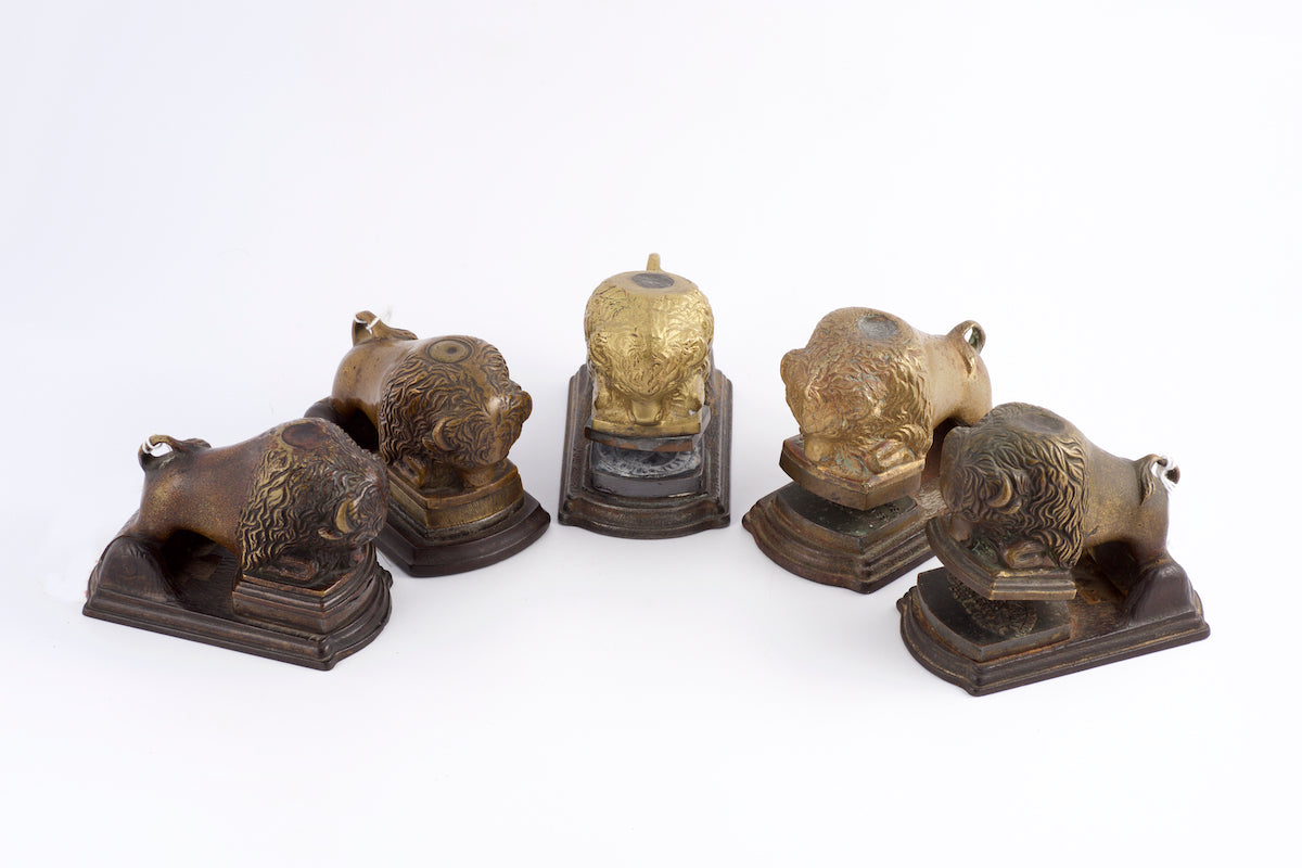 These are all 1800's wax impression seals - each has a different lead imprint under the front feet; some are patinaed more than others ... the one appears to have been cleaned ... but they are all close to the same mold.