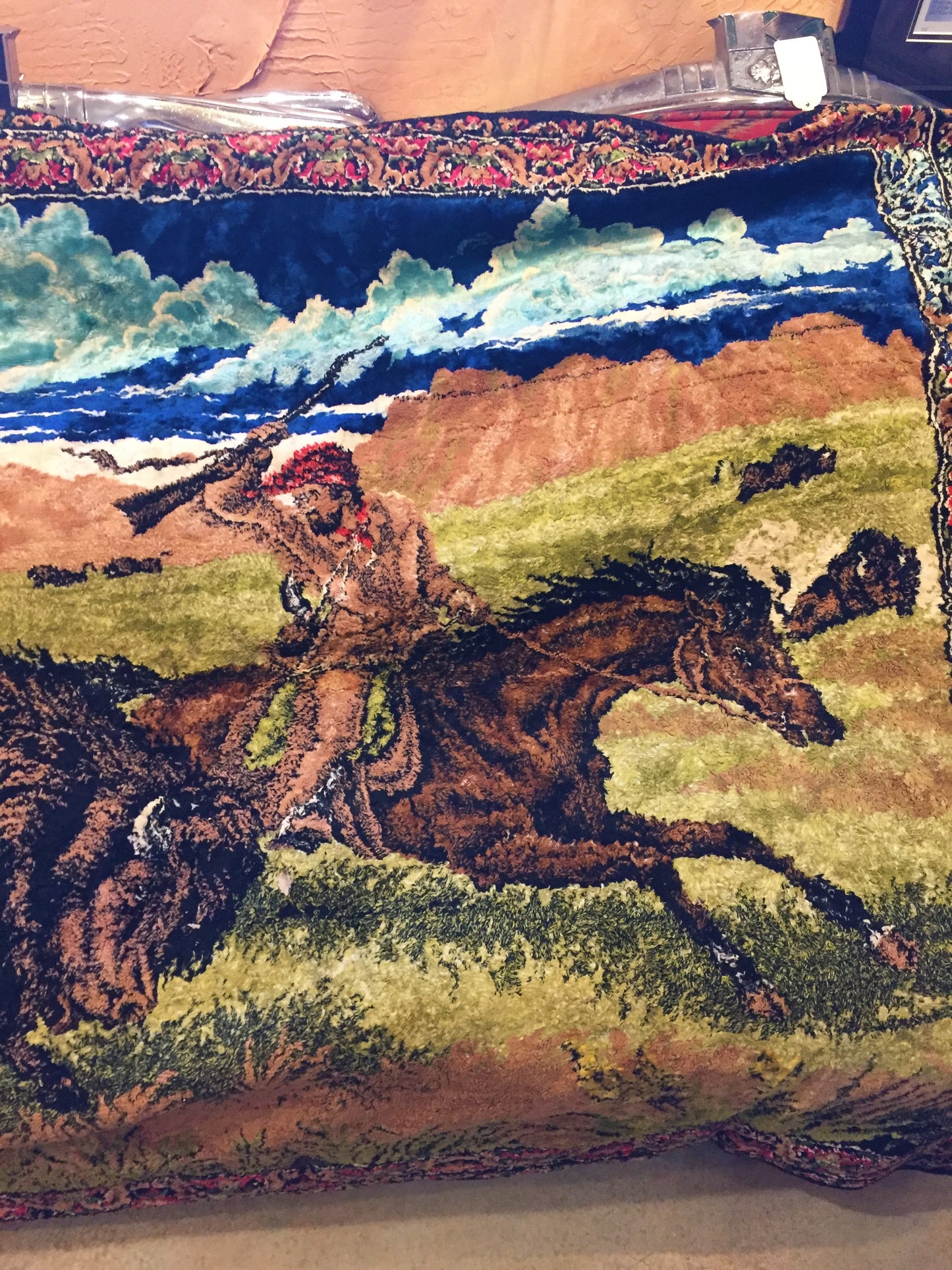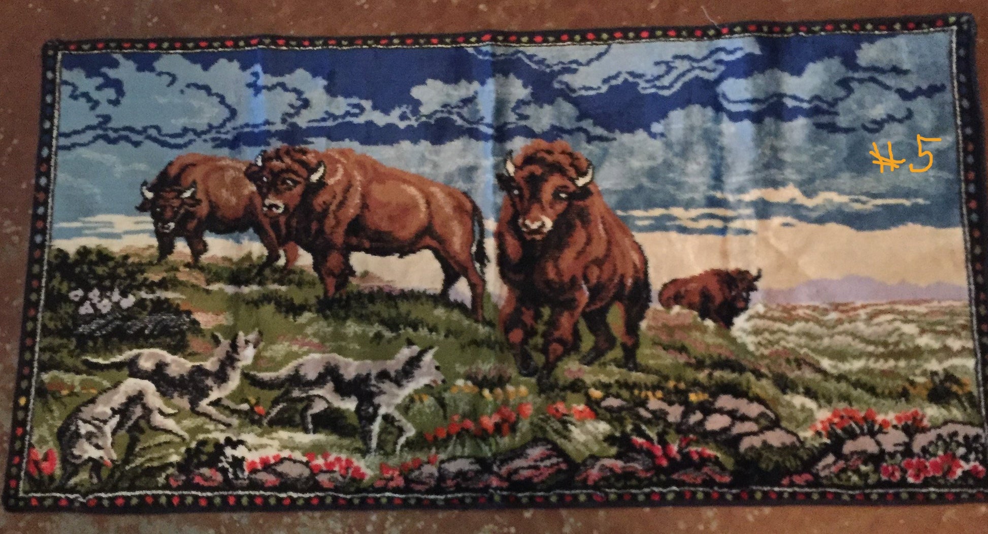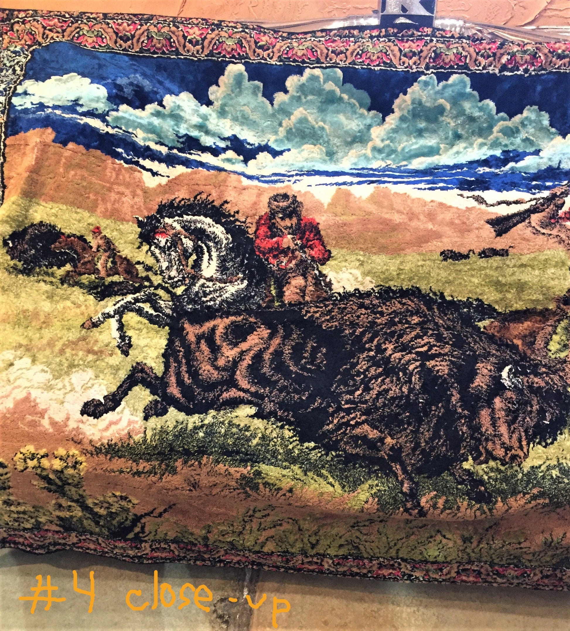 We've acquired several bison related tapestries over the past several years.  We usually just have one or two in the store, but recently the number has grown.  Fifty years ago, these were a lot more common, for wall decoration, over the back of a couch or chair and even as a small throw rug.  Just thought some of you might like to see these ... or bring them home.