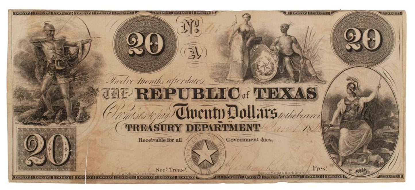 Historical Texas Paper - $20 Republic of Texas Treasury Note