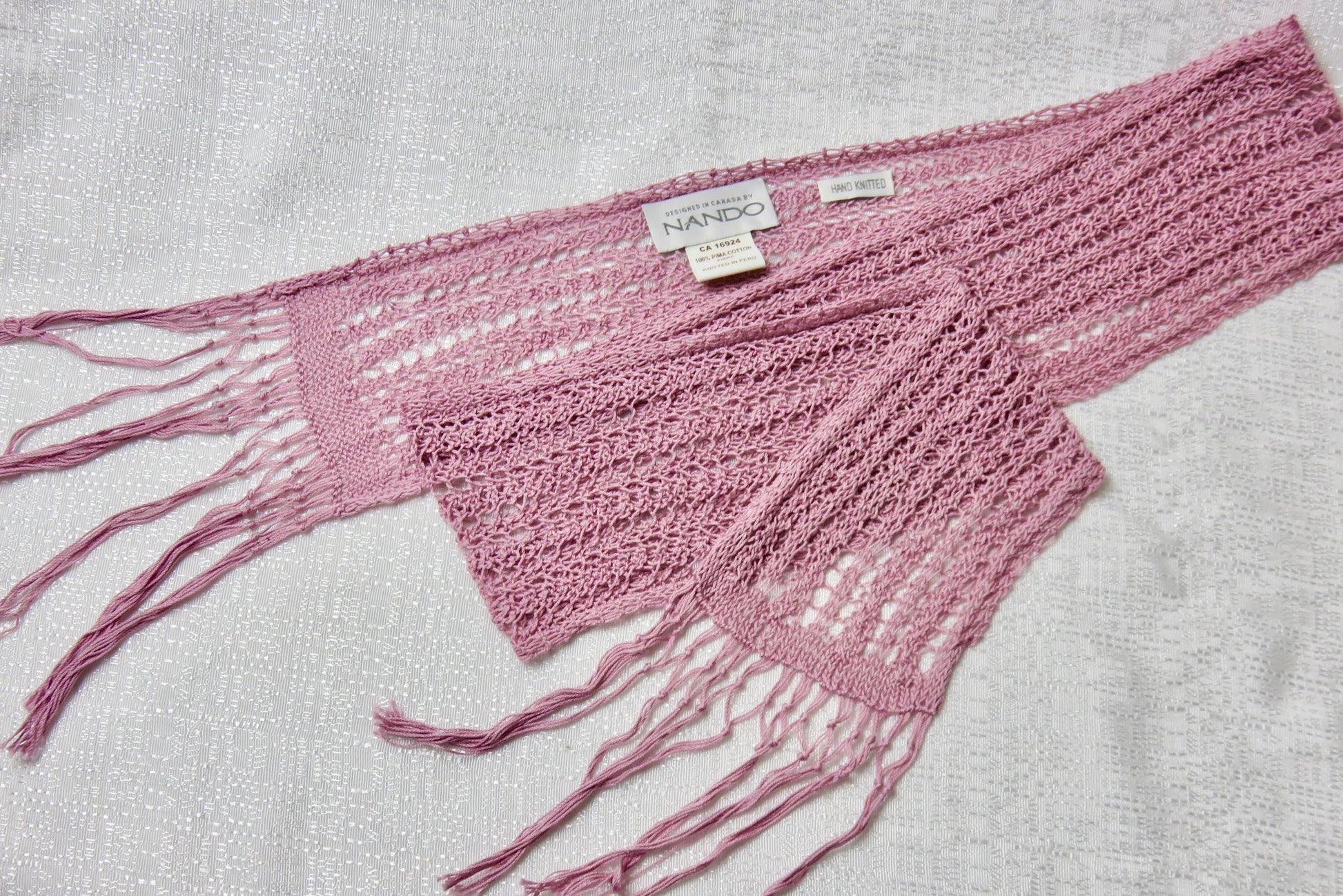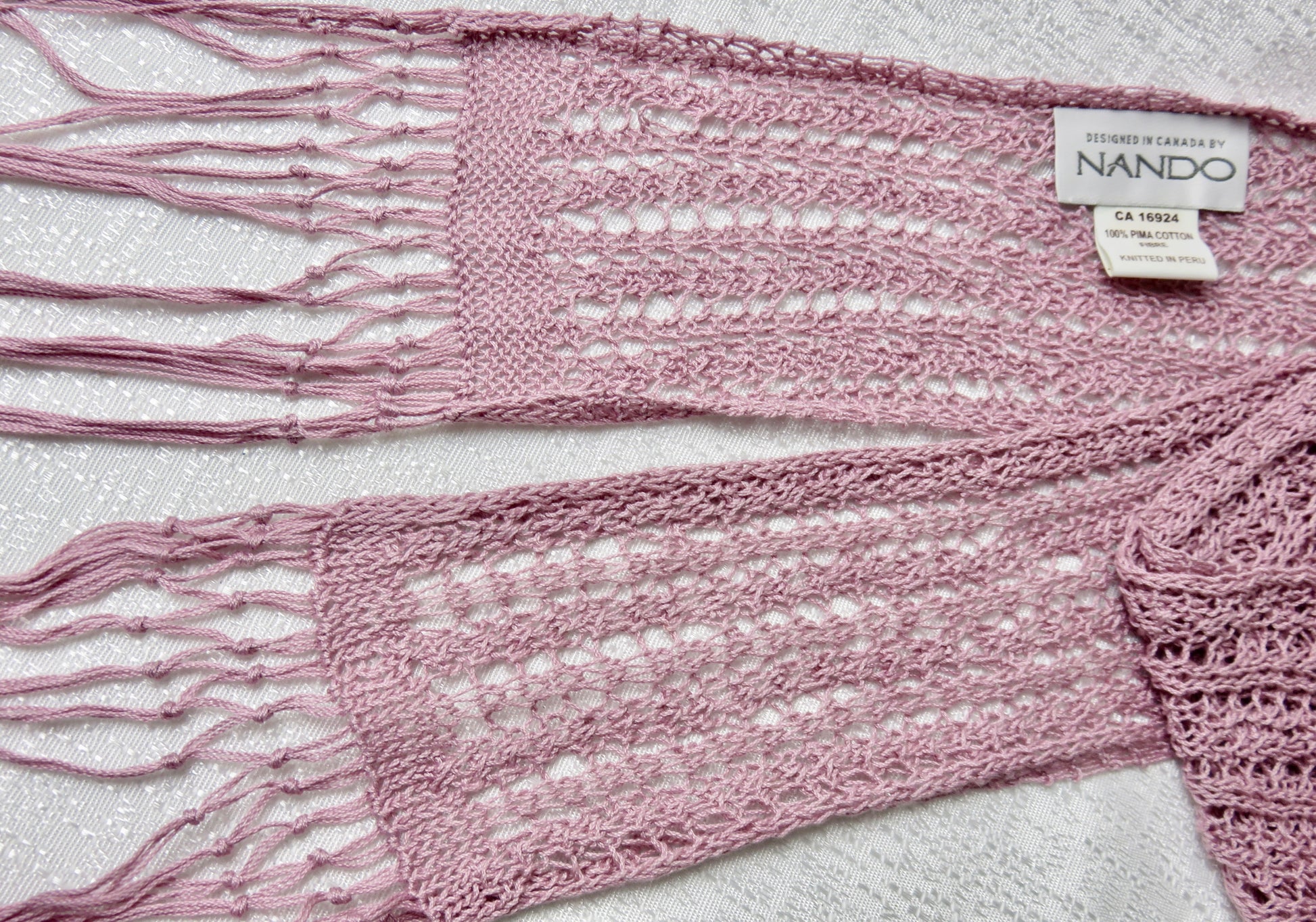Nando soft lilac 100% Pima cotton scarf measures 4" x 60". Delicate fringe edging. Hand knit in Peru. Hand wash or dry clean.