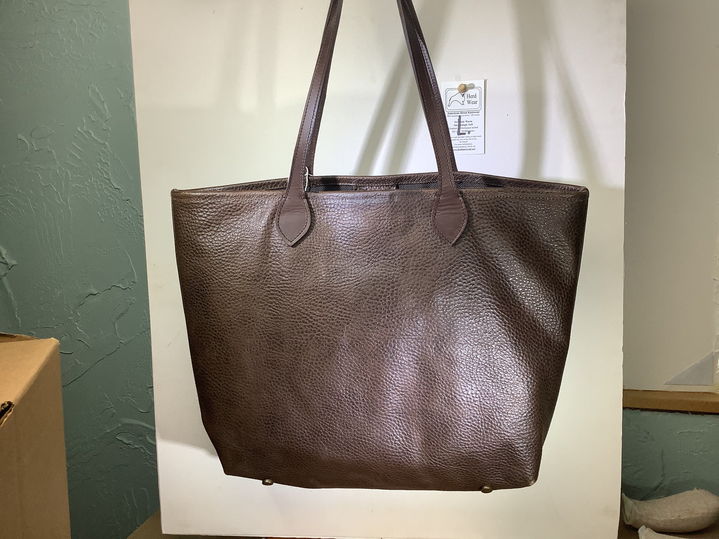All of the above are American bison leather with bridle leather handles, large enough for carry on items for travel or just everyday bag. YKK Brass zipper closure or magnet closure. Sizes are as close as we can measure. Call if you need more pictures of a particular tote ... but remember, most all are one-of-a-kind.