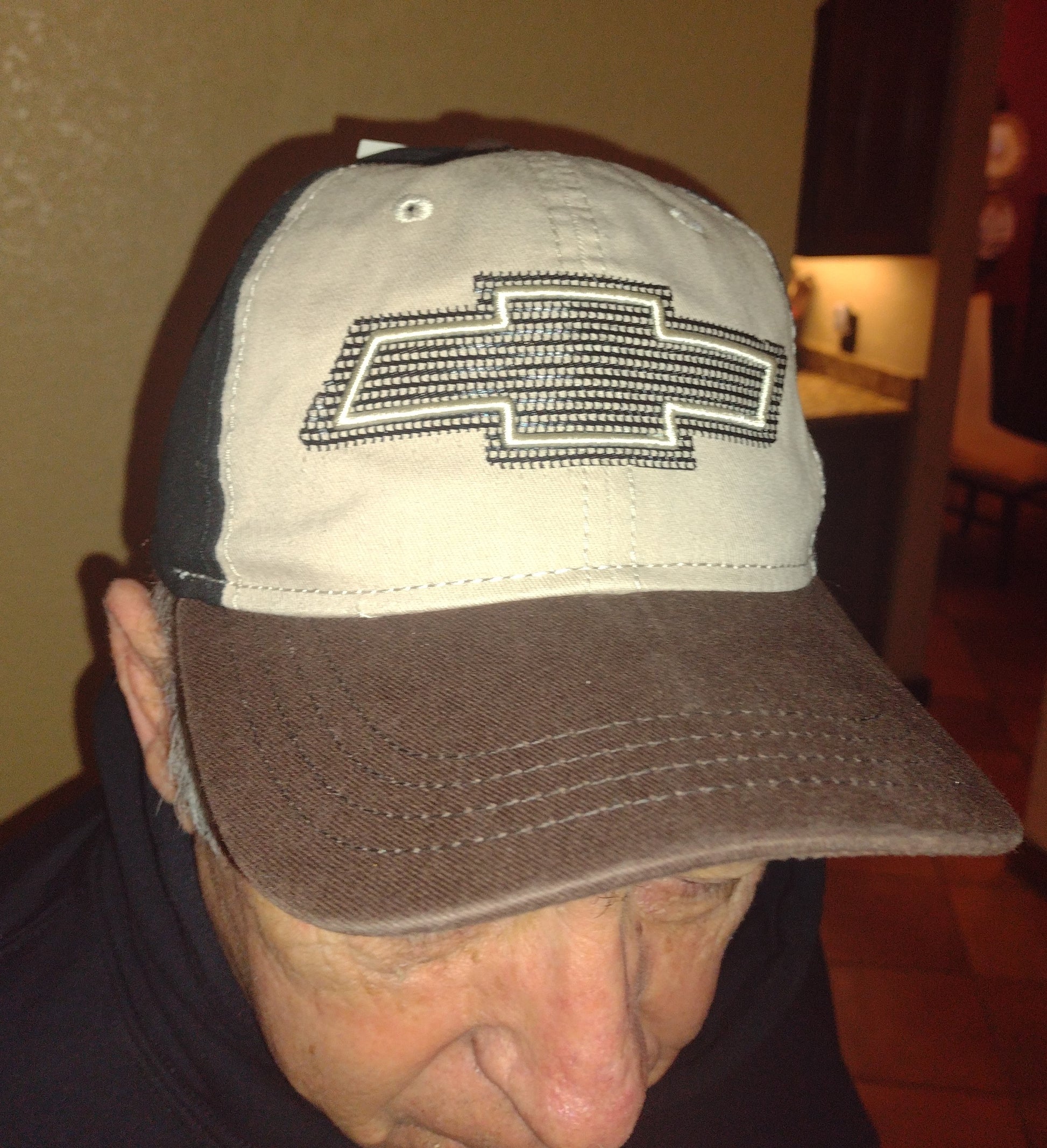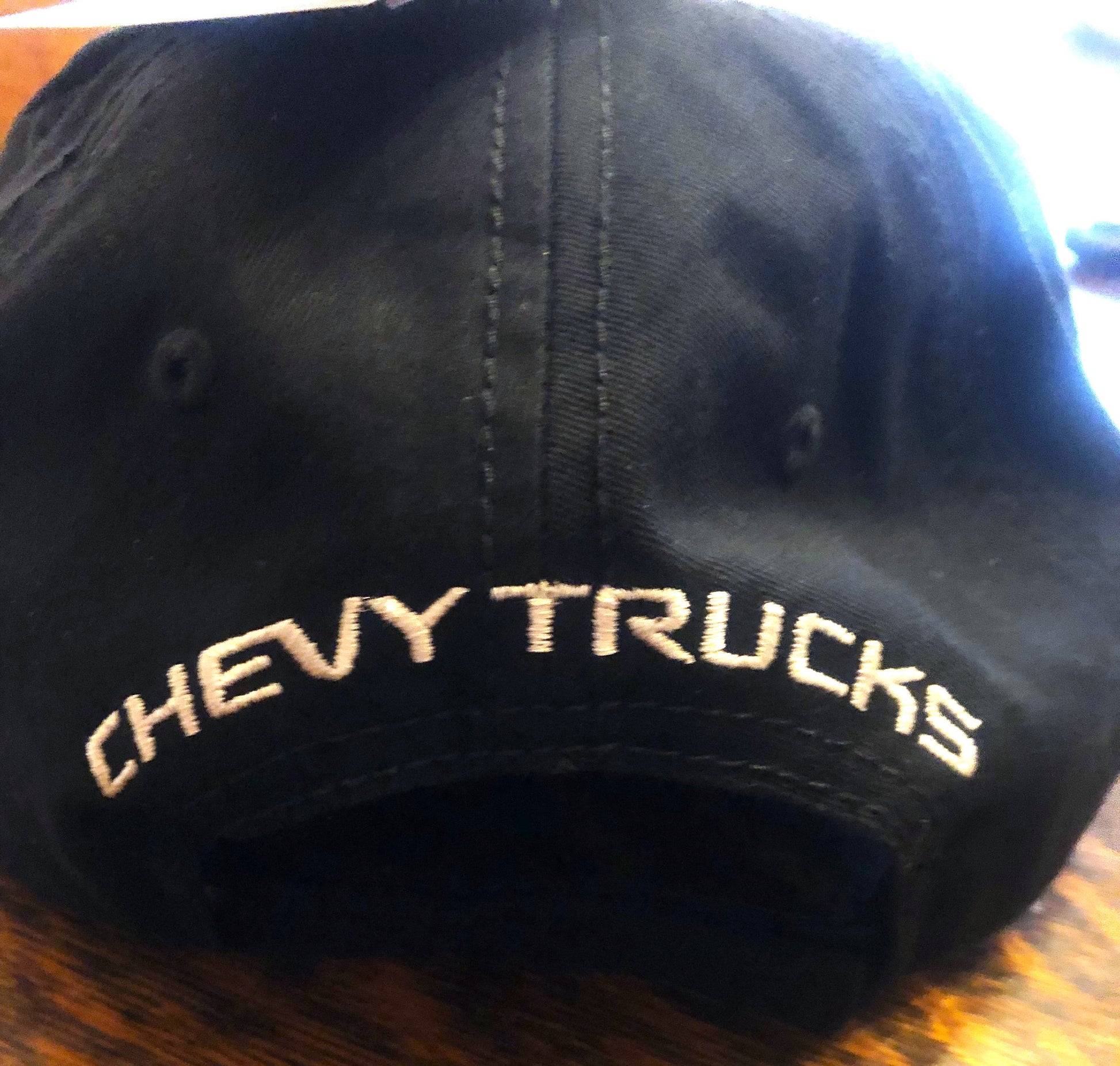 Neat color combo - dirt brown brim, khaki front panel with the black and white emblem and black canvas for the rest of the cap. "CHEVY TRUCKS" embroidered on the back.