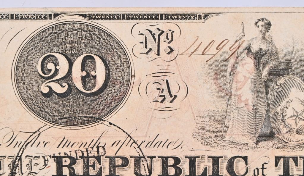 This is a well preserved, but funded and cancelled, Republic of Texas Mirabeau Lamar Signed $20 Note - #4099. Second signature is that of James Harper Starrr .. the second Treasurer of the Republic of Texas.