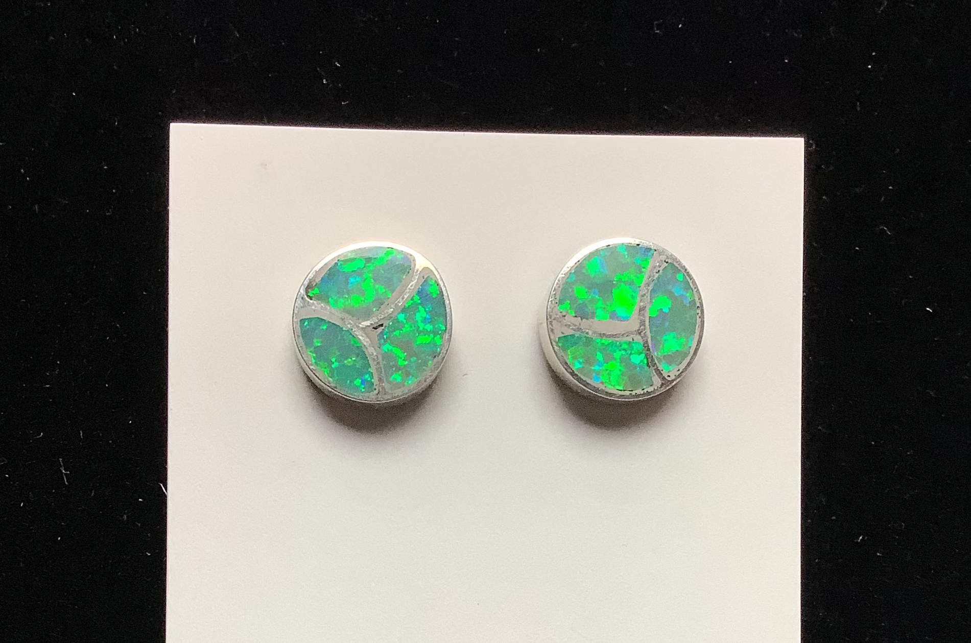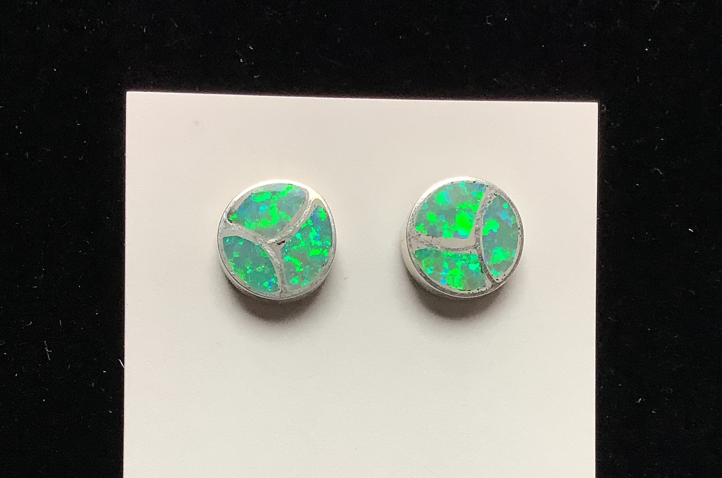 Some fun little synthetic (some call it man-made) opal earrings. the Caribbean Sea blue are French hooks; the Galapagos Ocean green are inlayed posts. Just $54 your choice. Both are set in .925 sterling and are Native American made in New Mexico.