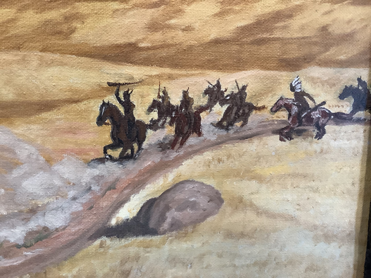 What attracted me to this work, other than just the smile it brings as to the Western theme, was the artists ability to put so much "motion" into it. The horses, the coach's wheels, the gunners and the pursuers ...the dust flying. Without being photographic, it has a life quality. Just me.