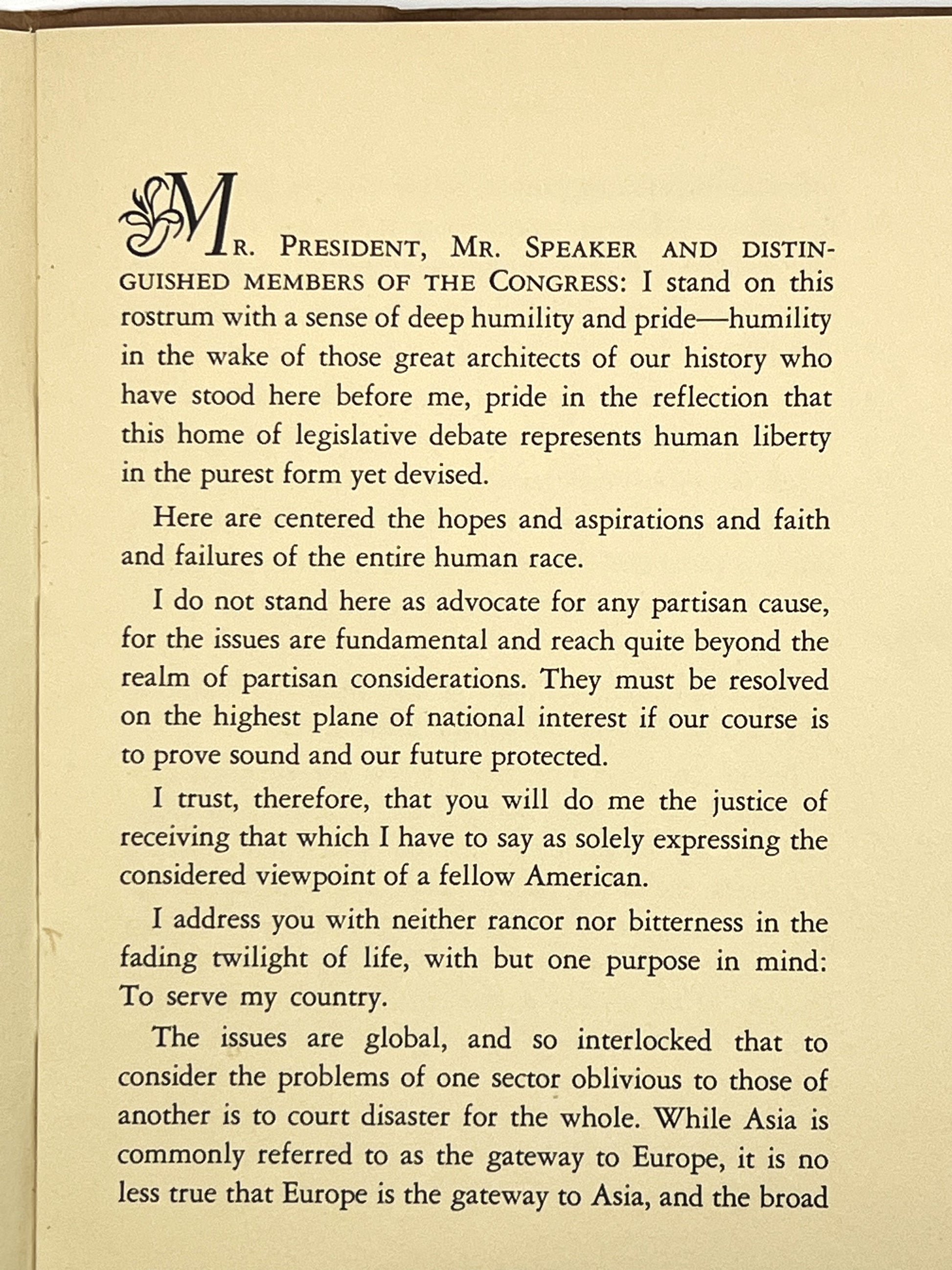 This is a rare and historic copy of the farewell speech of General Douglas MacArthur.
