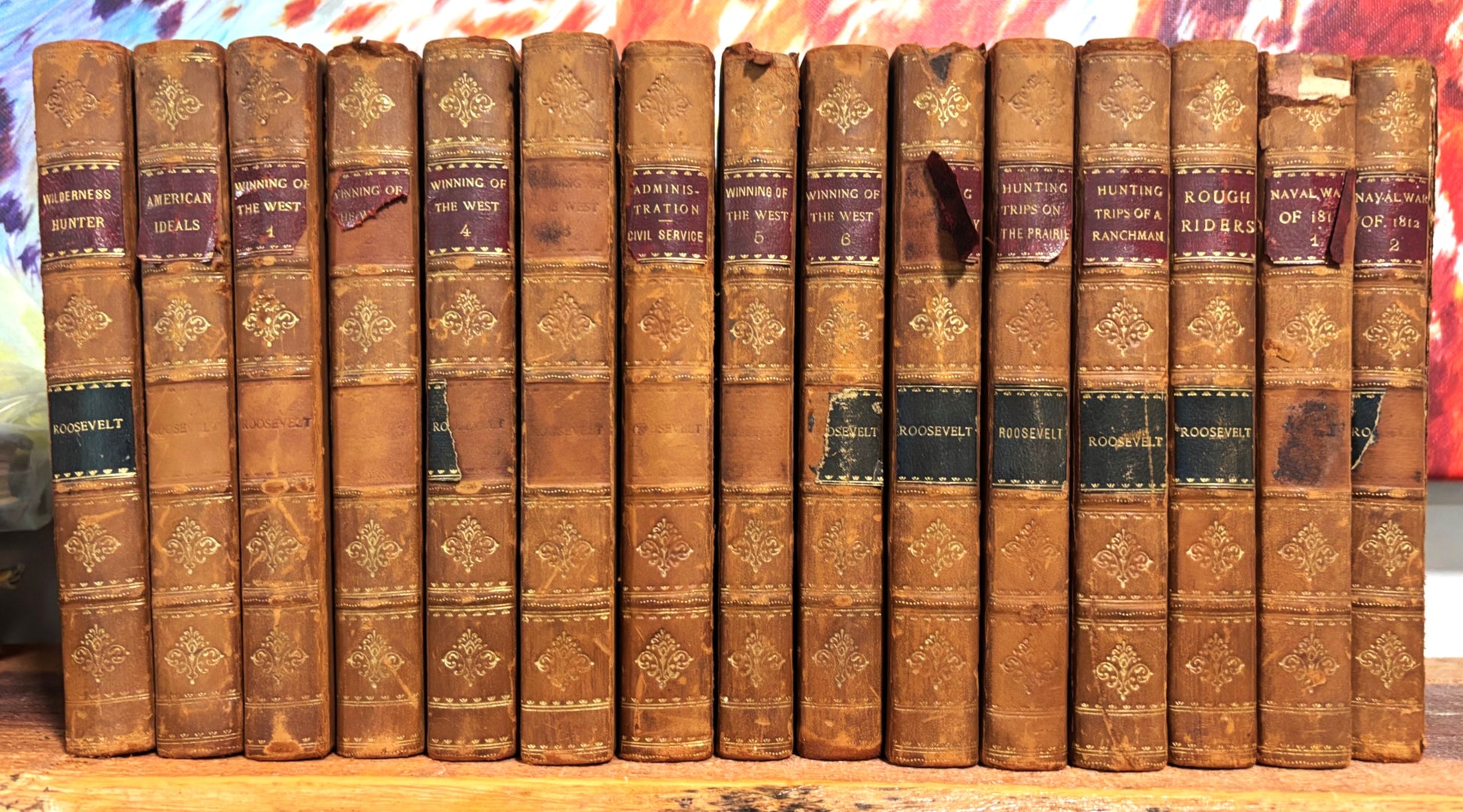 One of the most beautiful .... and most tightly bound sets of 14 of the 15 vol Theodore Roosevelt works I have found. Considering the age (1901 printing), it is in very good or better condition. Readable without worry; these bindings are tight. The pages have some pretty good foxing (tanned aged coloration). but the paper is still crisp. I doubt most of these volumes have ever been read.
