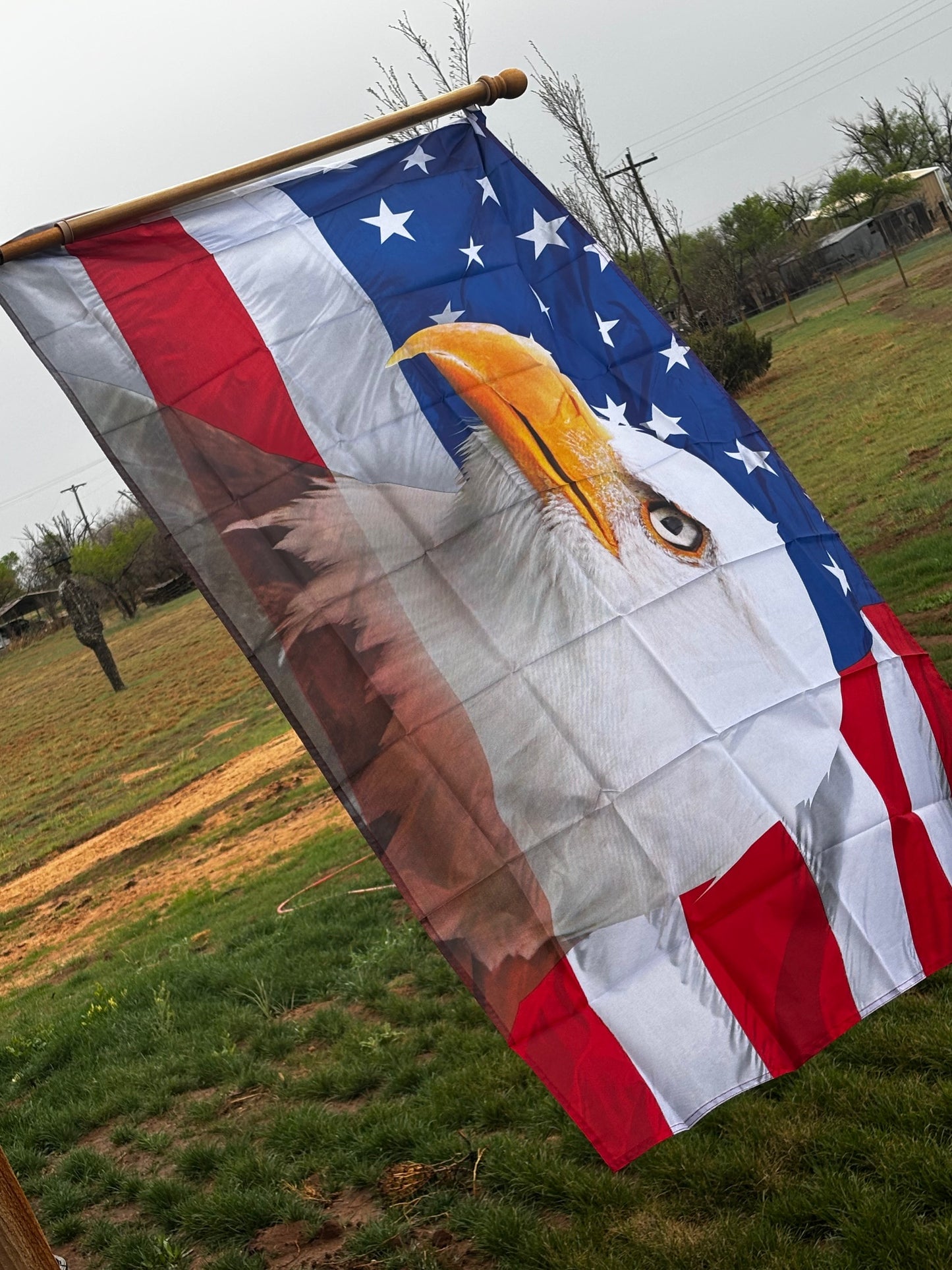 Lightweight nylon; a great "unofficial", but very patriotic banner. Share your support for the colors and symbols of the USA with all around you. I've had one at the old store and now in the yard for years now. Just a few left. Printed to show through on both sides, (Flag only; no flagpole)
