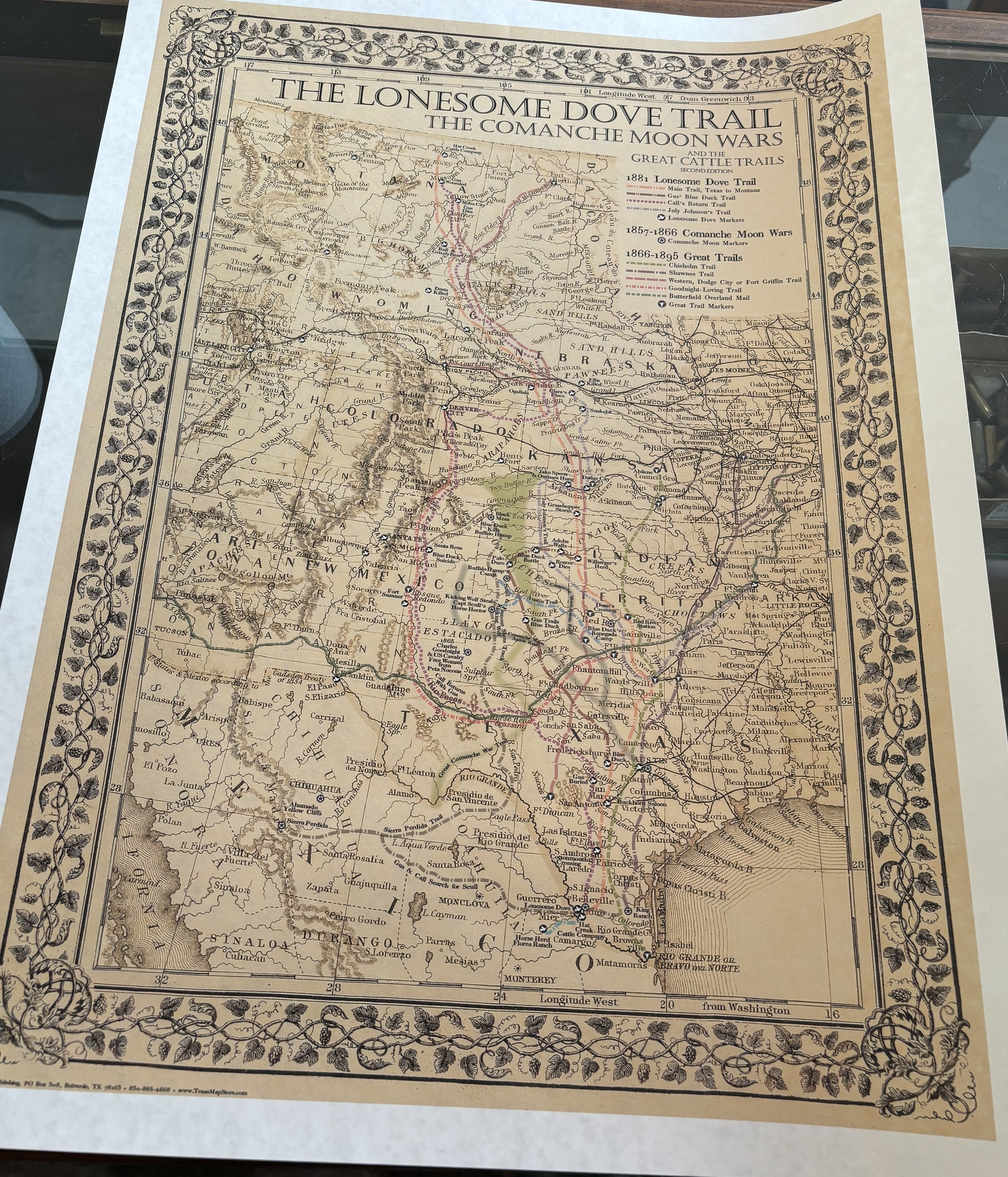 Alan has found as many as he could and created this beautiful Lonesome Dove Trail Map. Fun, educational and a great wall hanging.