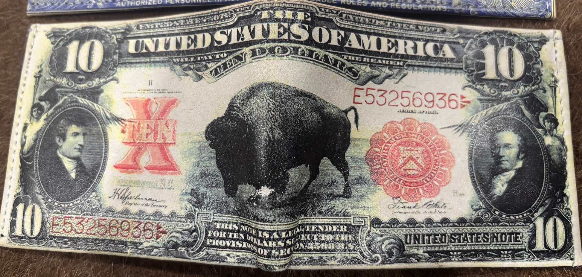 These are old stock, but great new wallets.  I used one of the $10. Bison Bill (Yes, that was a real US $10 bill printed initially in 1901) wallets every day for about 7 years ...  and the print on the leather (yes, these are leather) barely faded.  The exterior was still tough and not cracked and the interior nylon was just in great shape. I think it's still in a drawer somewhere and if it is I'm going to add that picture to these.