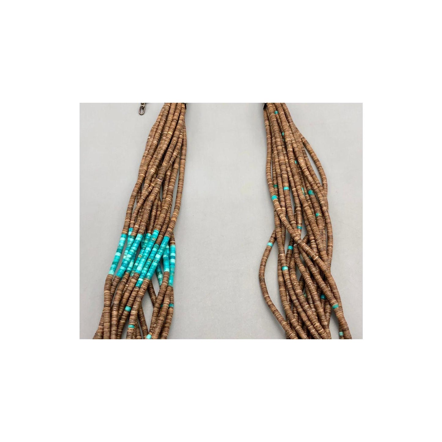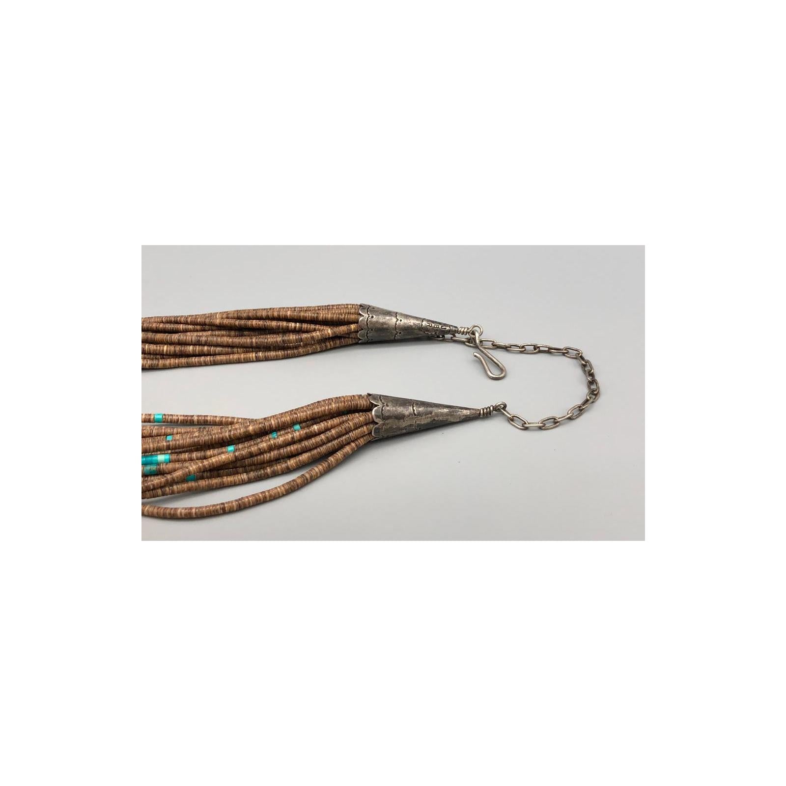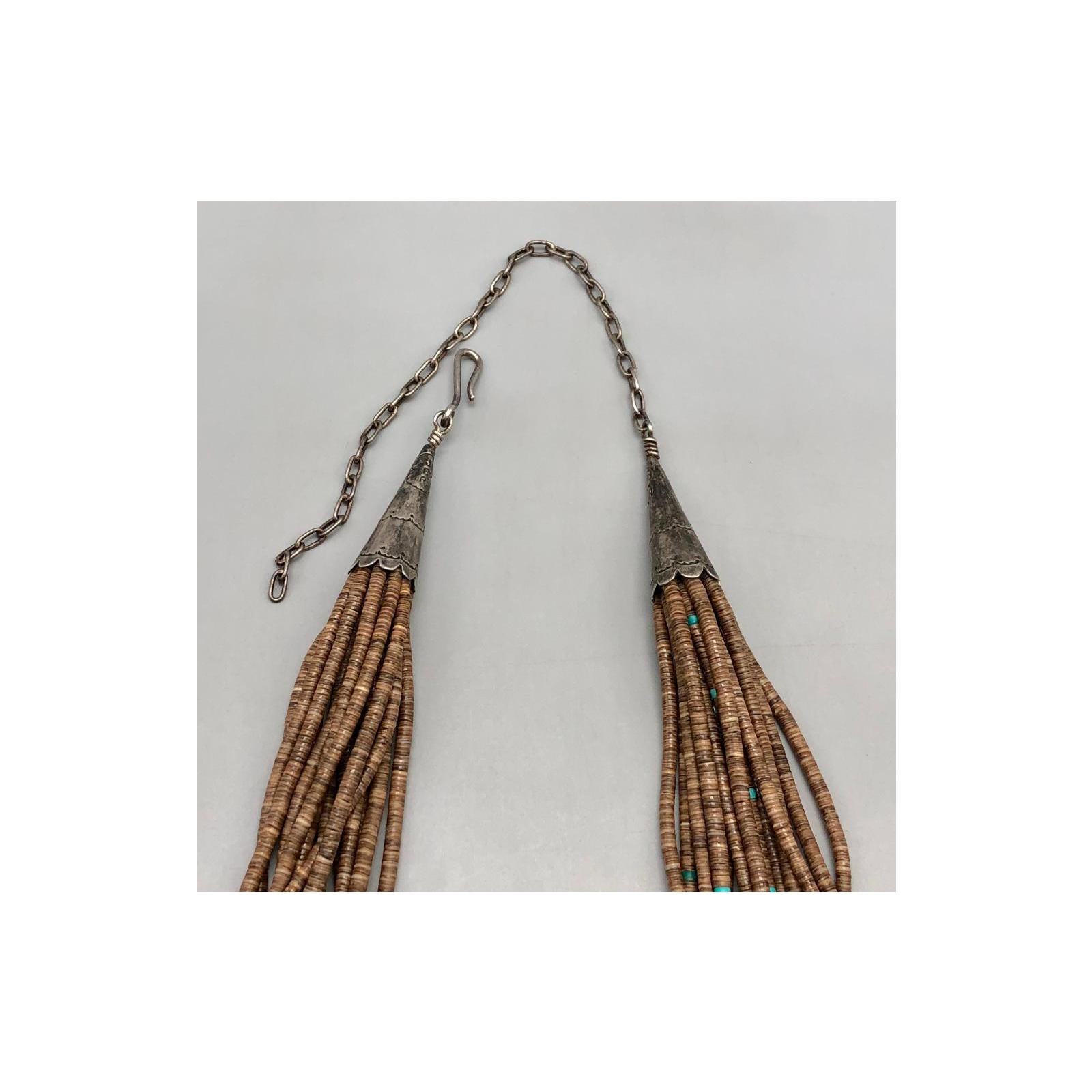 Fifteen fine and beautiful strands of heishi and turquoise beads set in an appealing pattern. The necklace is longer, and strung on a string with sterling silver cones and an adjustable chain at the end. This would be a great layering piece for your collections. I’ve not seen anything close to this in the past.