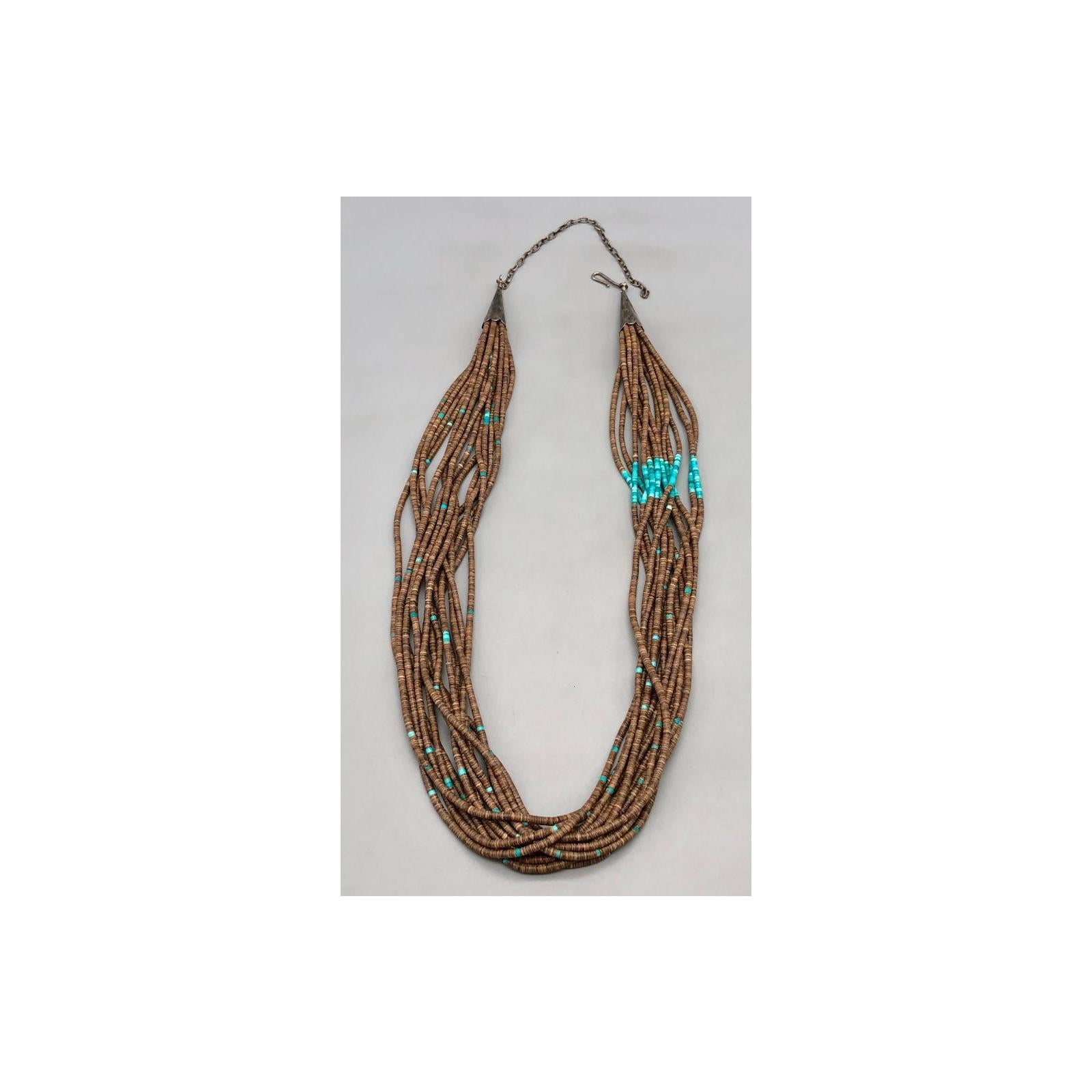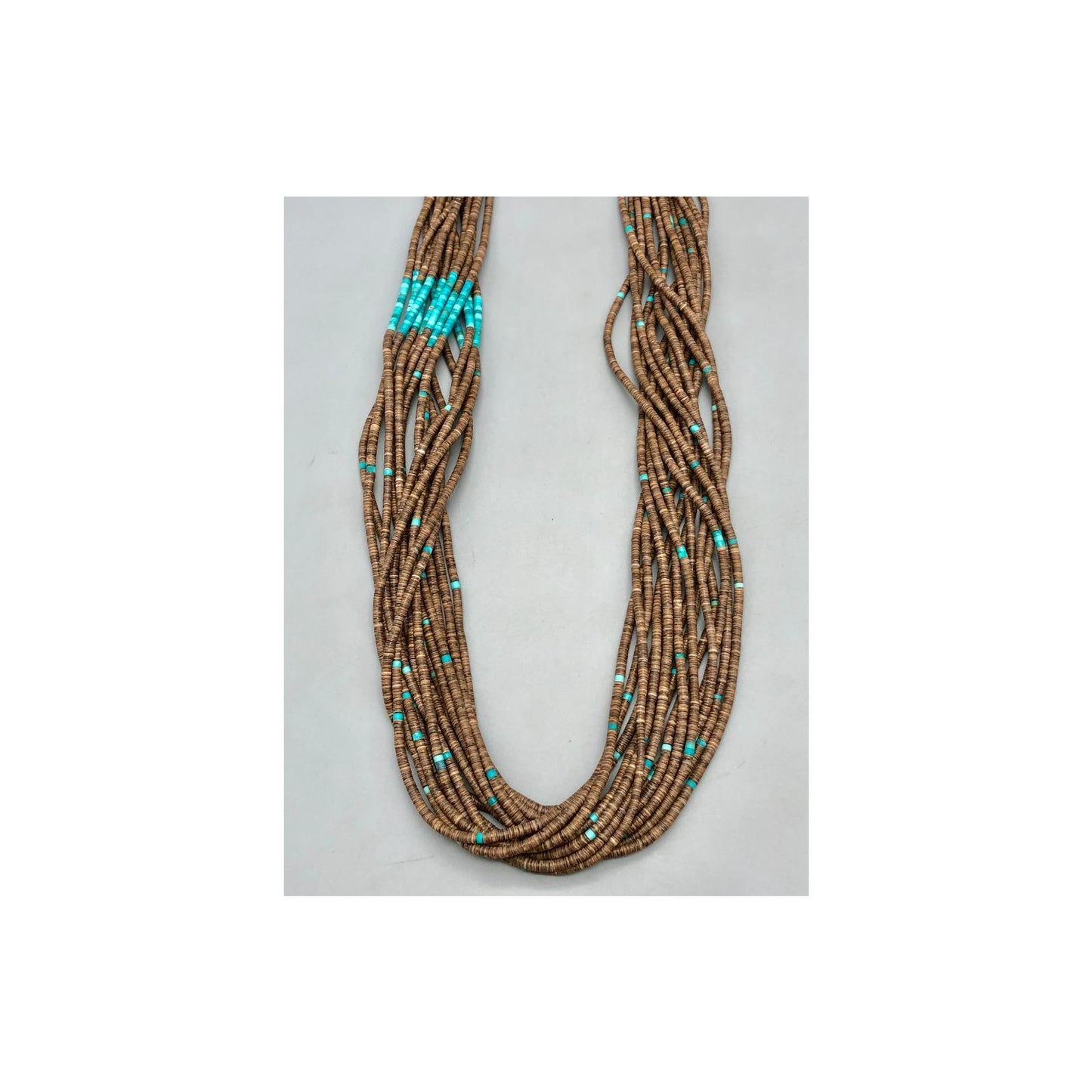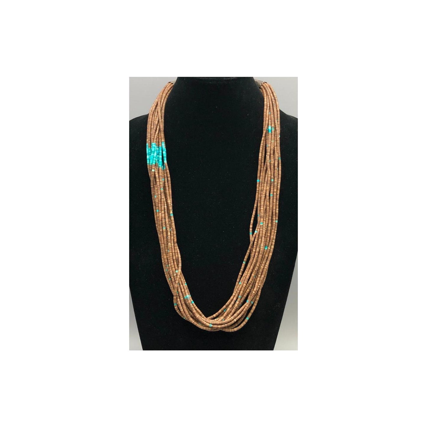 Fifteen fine and beautiful strands of heishi and turquoise beads set in an appealing pattern. The necklace is longer, and strung on a string with sterling silver cones and an adjustable chain at the end. This would be a great layering piece for your collections. I’ve not seen anything close to this in the past.