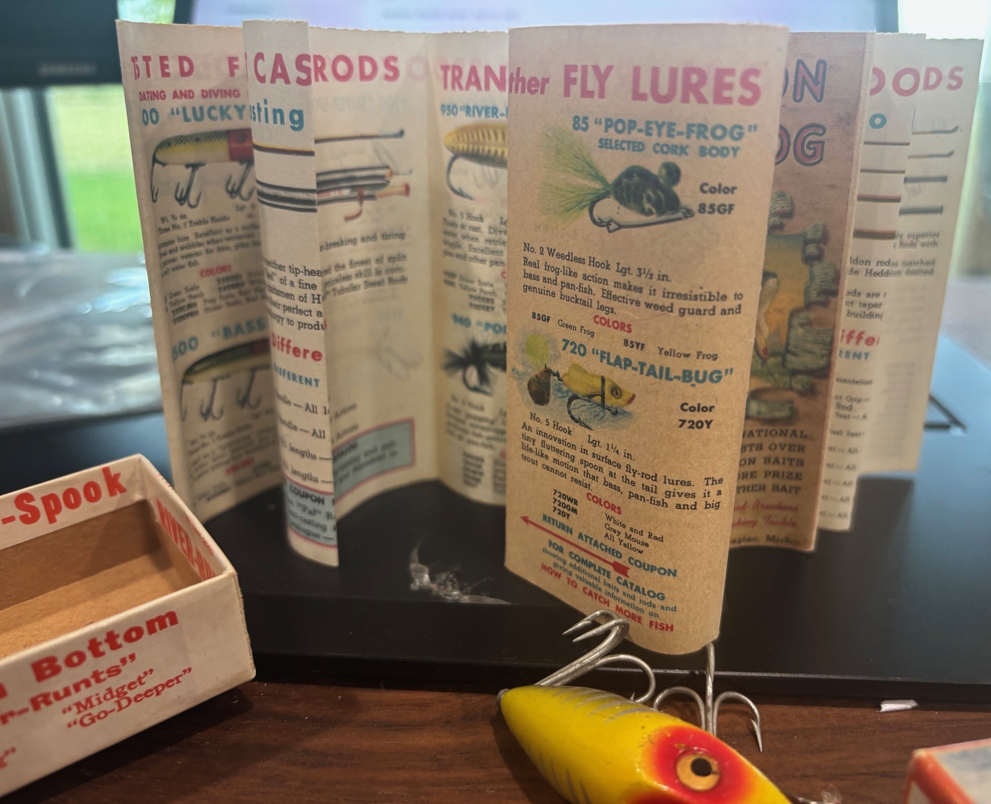 Another seemingly unused lure, with original box and insert. These were 1940-50 ish lures and boxes. It appears to me to be wood rather than plastic as I cannot feel any mold line, which puts in the earlier years. Just my thinking ... and as I have said, these are returnable if you are not satisfied for whatever reason.