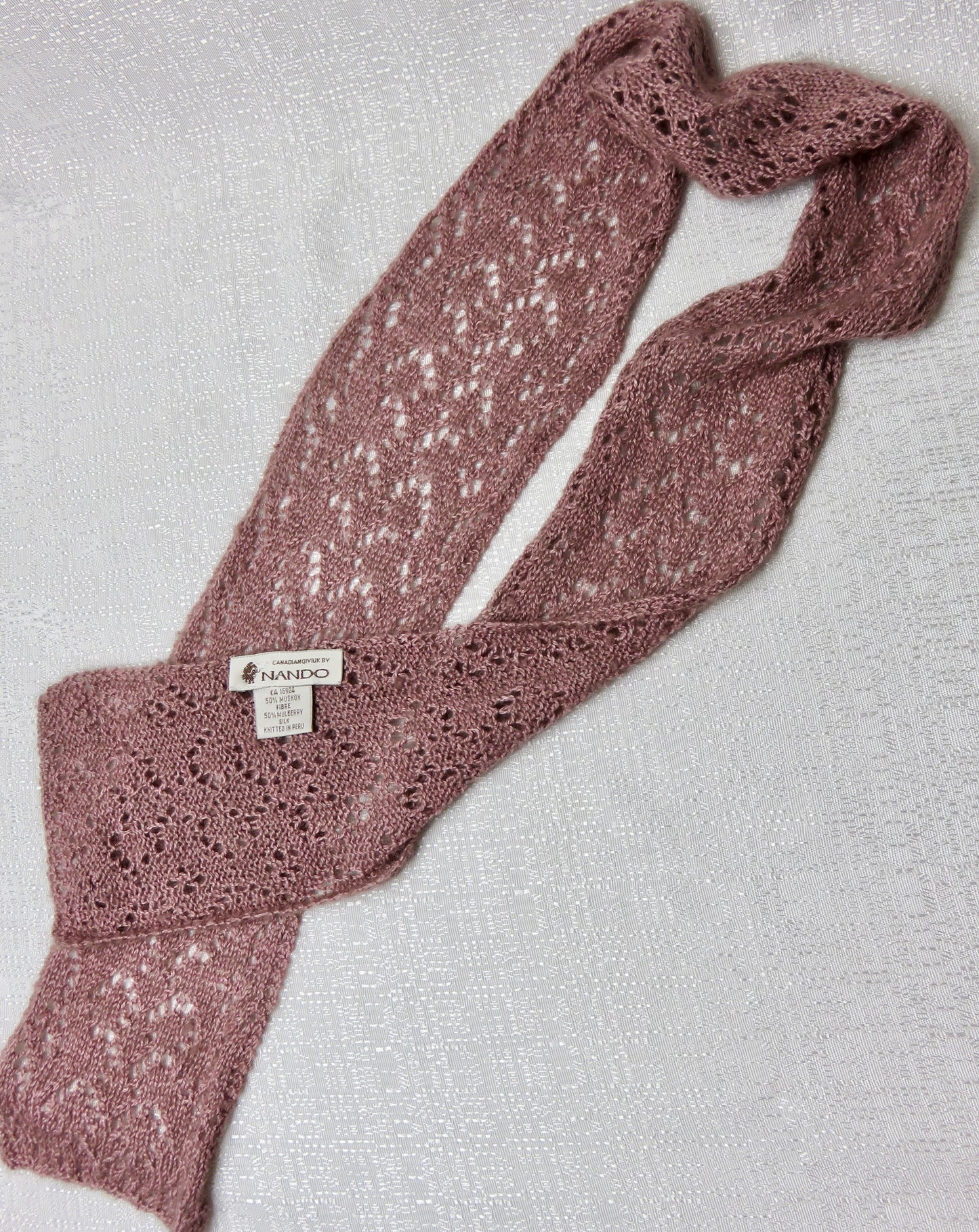 Nando soft mauve 50% muskox/ 50% mulberry silk scarf hand knit in Peru. 5" x 52". Hand wash or dry clean.