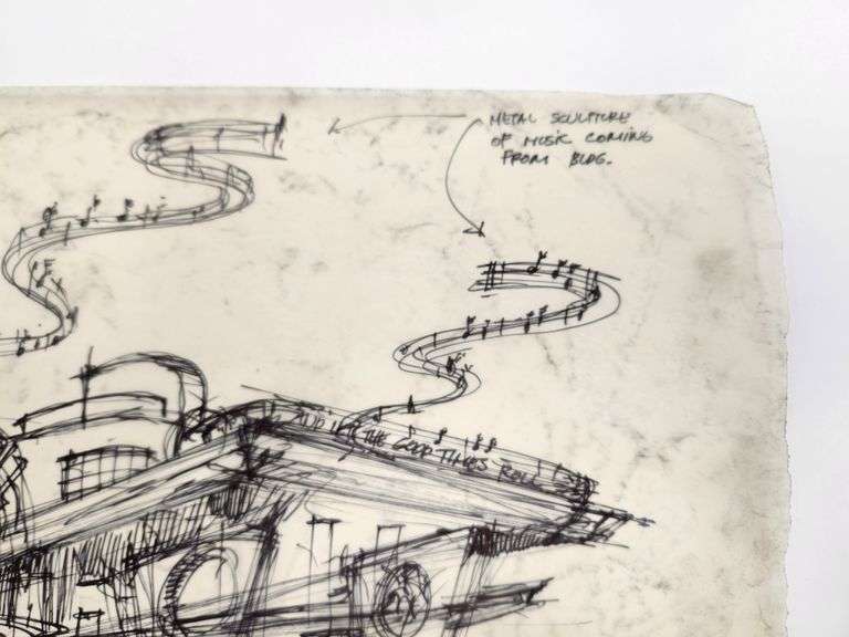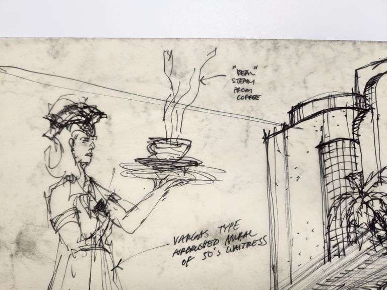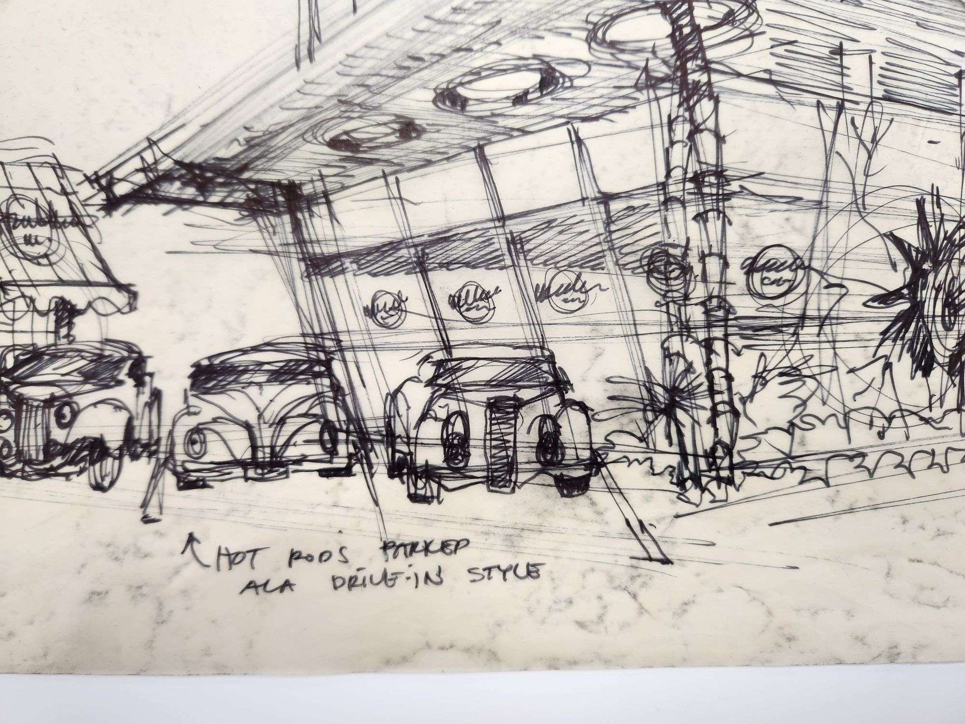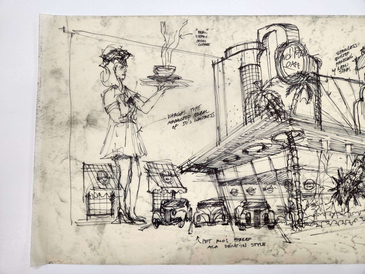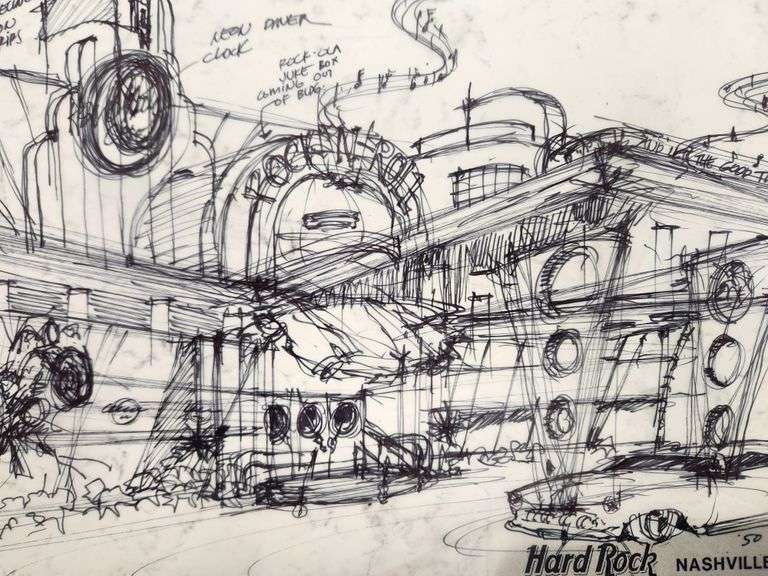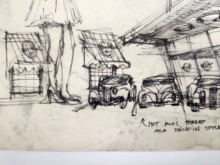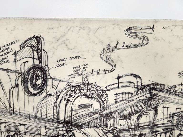 Welcome to the wild side of architectural concepting. This original Hard Rock Café design sketch, hand-titled “50s California Drive-In,” is a full-throttle burst of creativity, drafted directly onto vintage trace paper in black marker and ink with zero hesitation and max attitude.