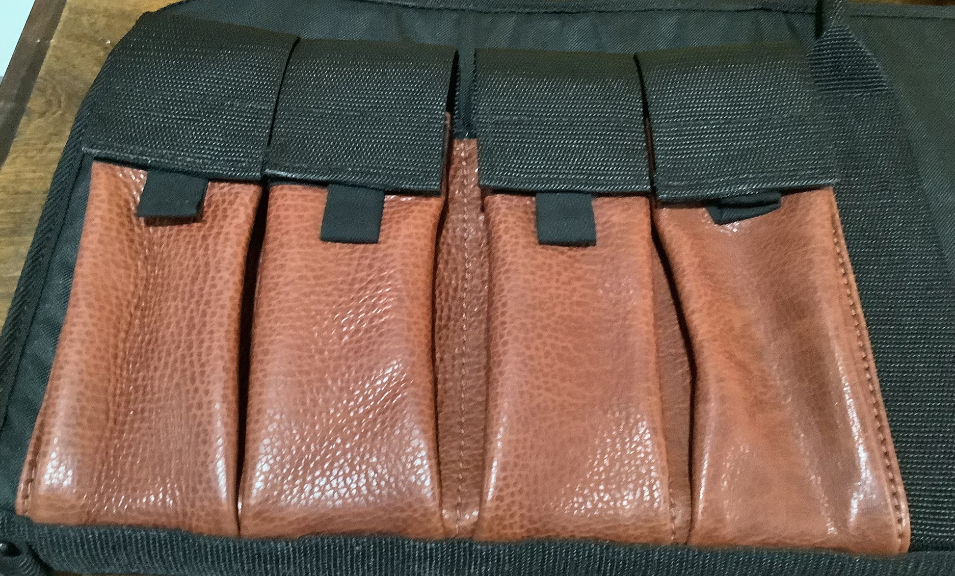 - COLOR:: Black Nylon with full grain Tobacco brown Bison Leather Mag pouches.