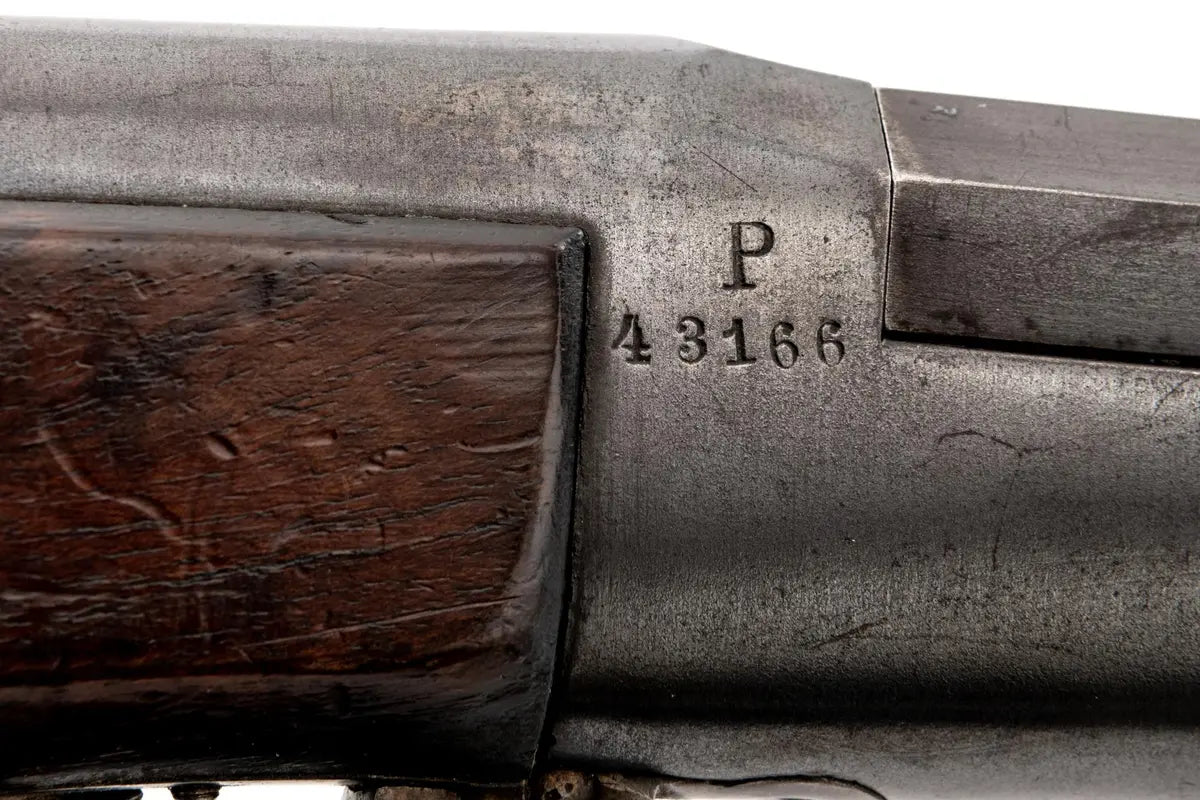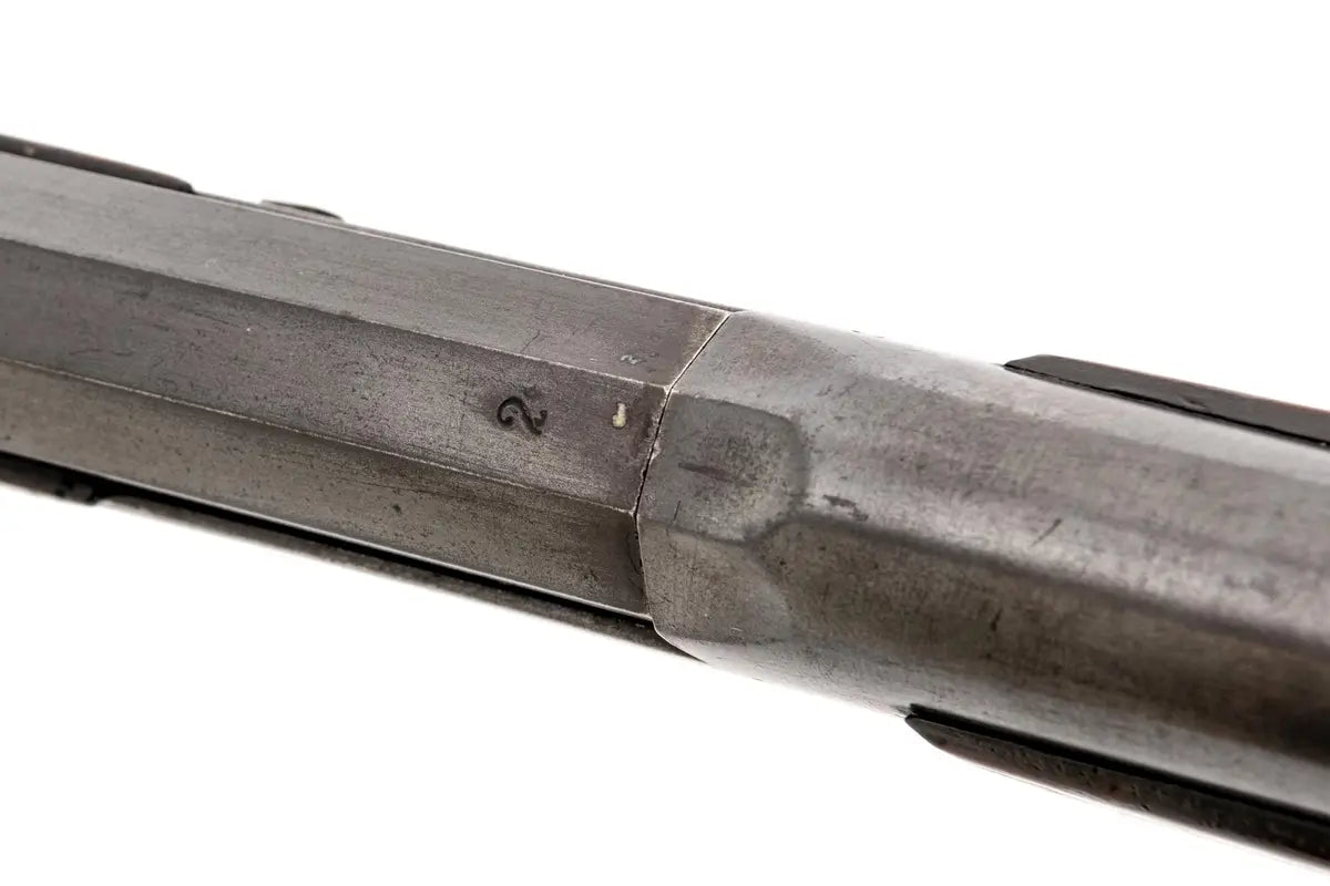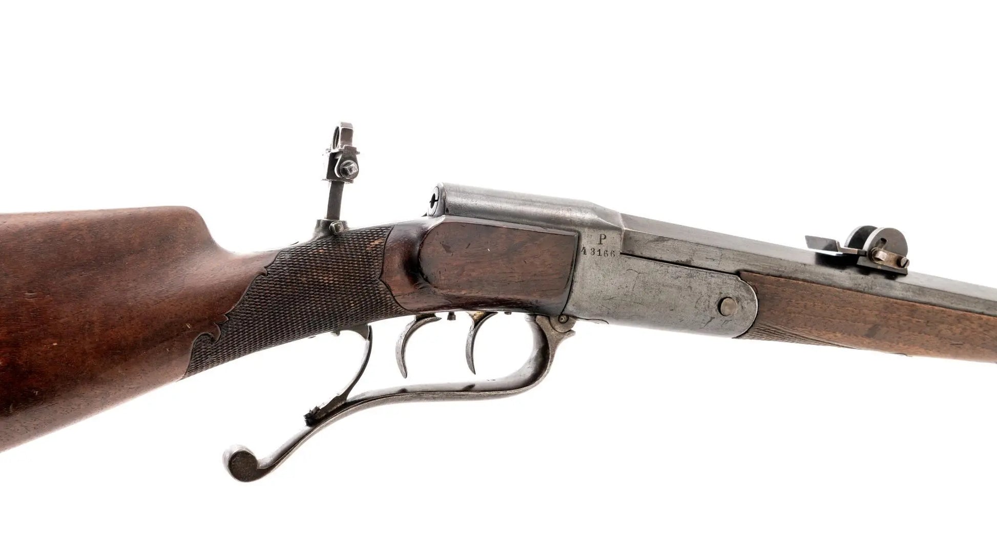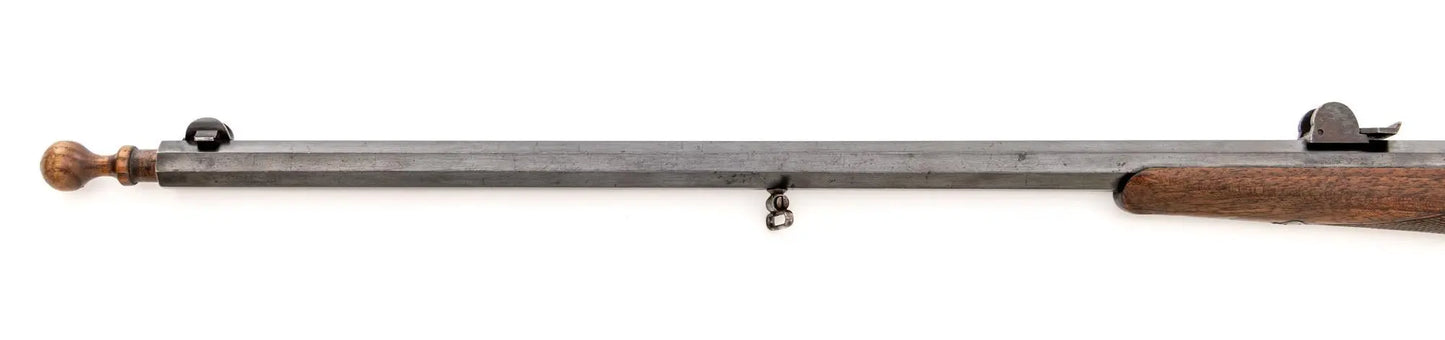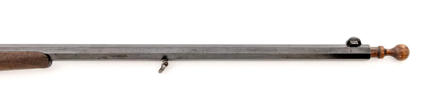 Antique European Single Shot Parlor Rifle, #P43166, 4mm cal., 26" octagon barrel, blue finish, checkered walnut two-piece straight grip stock, sling swivel on the barrel and stud in the buttstock, protected blade front and adjustable rear volley sight, stylized trigger guard/release, and double set triggers. With minimal visible markings, including the serial number and "2" on the barrel flat at the breech. Mfg'd circa late 19th Century.