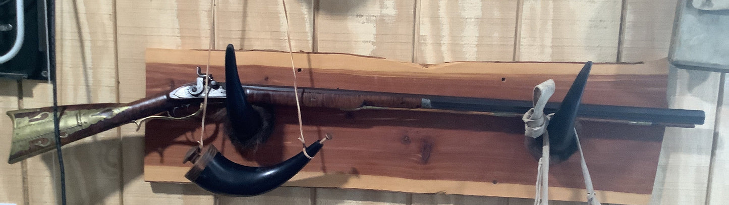 Beautiful and well maintained antique .38 caliber percussion long (38" barrel) rifle, having an octagon barrel, tiger maple full-stock, "Kentucky" style. engraved and pierced brass patchbox, brass trigger guard and butt plate, ramrod, single trigger and etched lock plate, apparently unmarked.