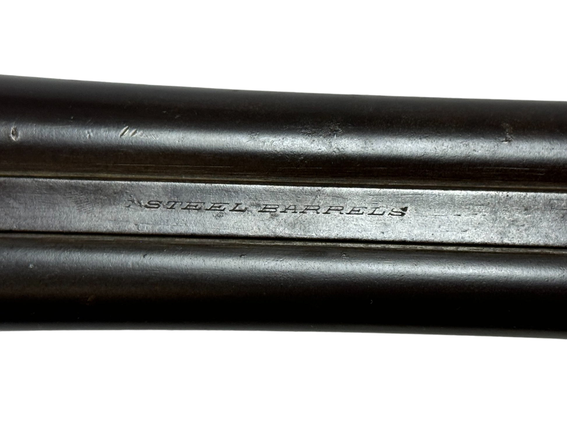 S#: 23391 | Mfg. circa 1886 | 29.75" Steel Barrels | 12 GA. | 14" LOP | Country of origin: Belgium | Back lock; metal butt plate with heel; refinished stock |||| CONDITION: Fair. Bottom Lever opening. Darkened blue refinish with bare metal patina lock plates. Wood stock is very good and solid with fine, sharp checkering and nice grain. Seems to mechanically function with a decent amount of play in the lockup. Lever arm does not want to stay locked. Bores show some minor pitting. See photos for more representative description.