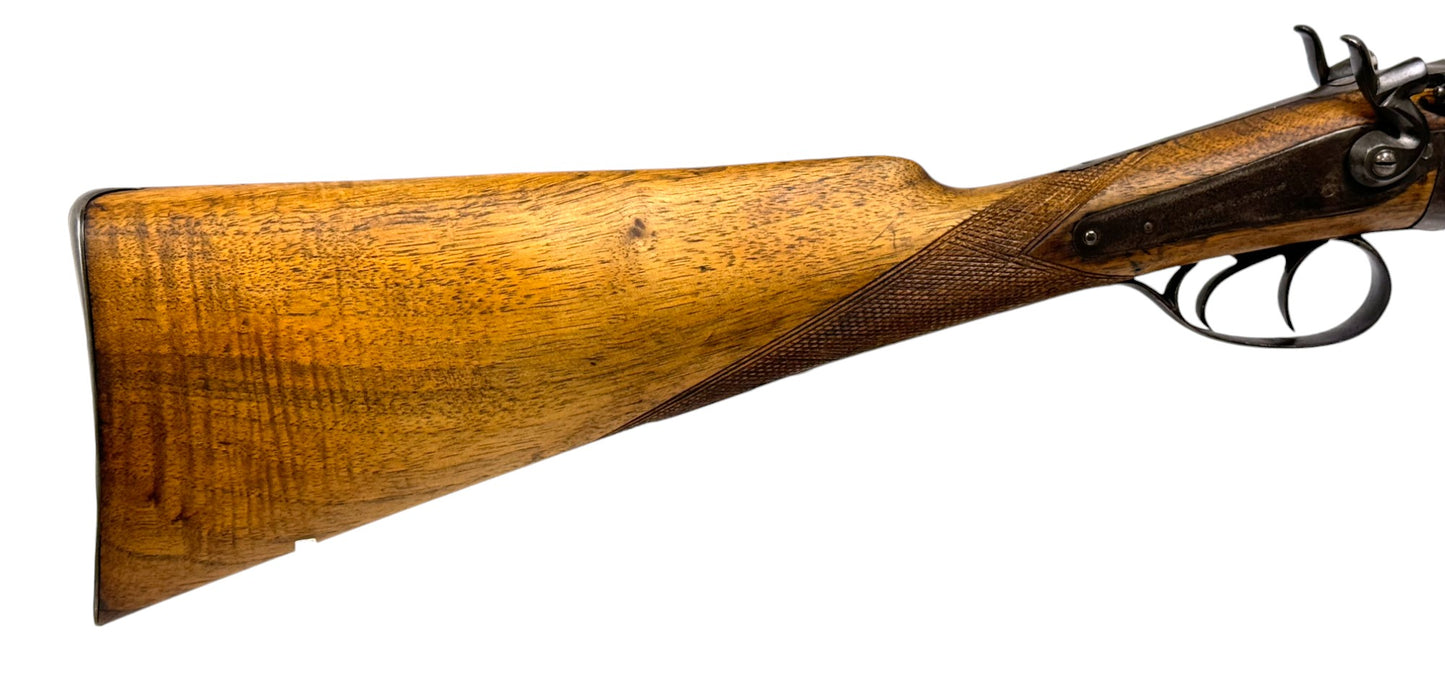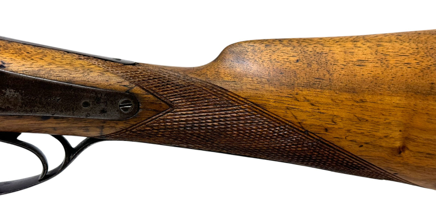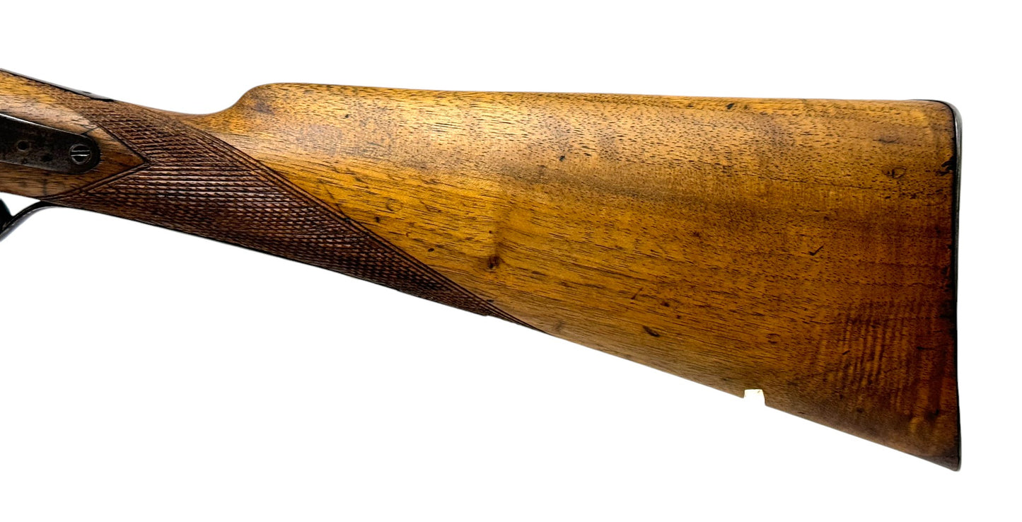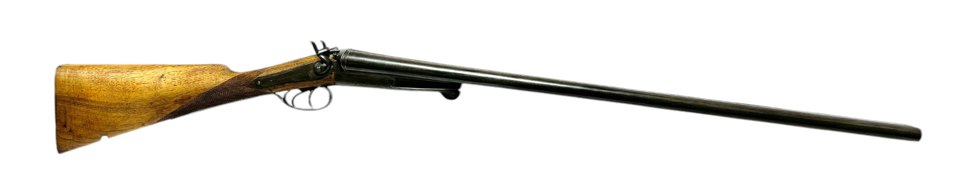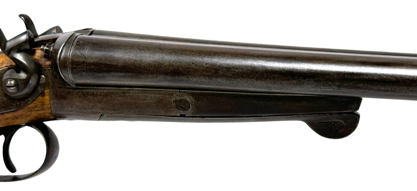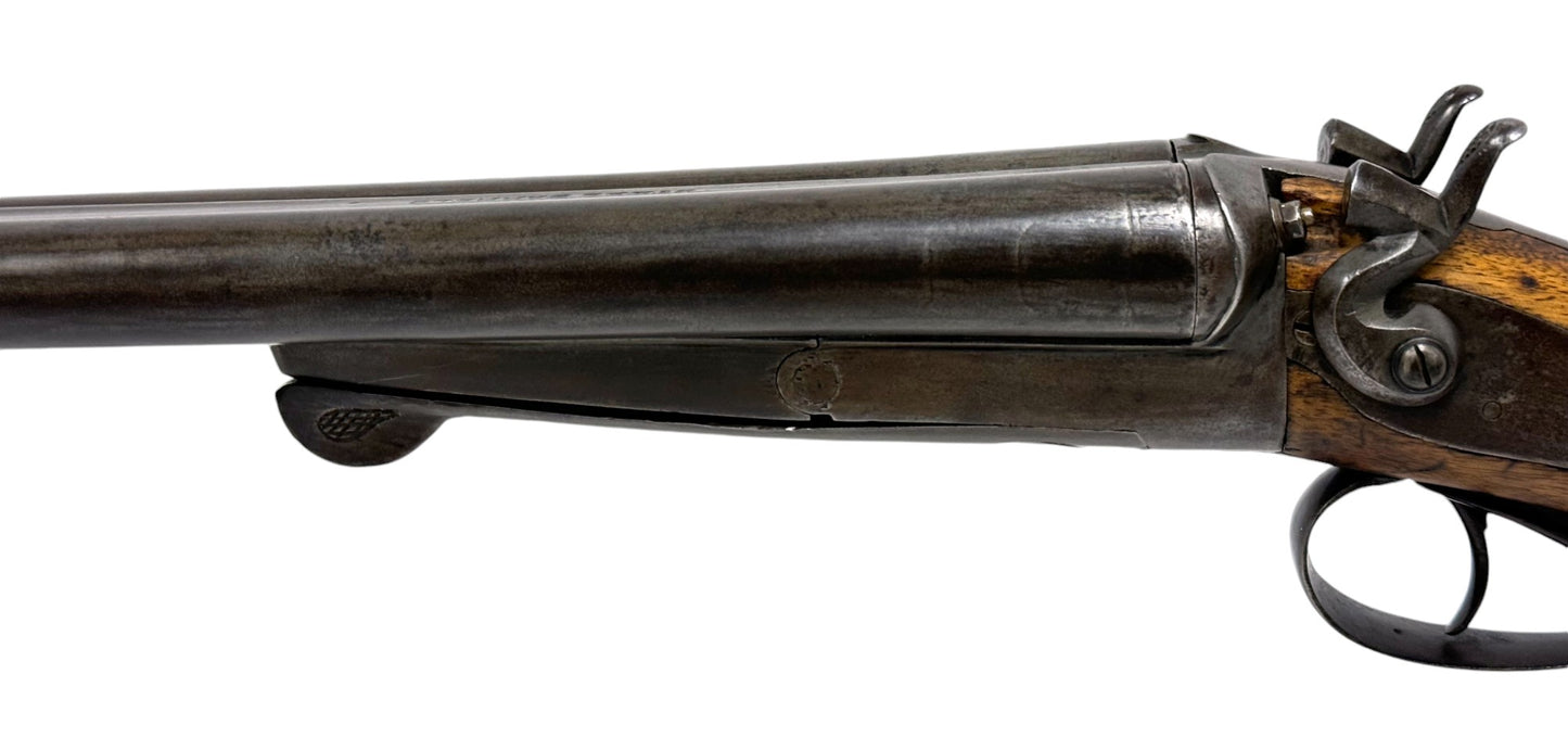 S#: 30540 | Mfg. circa 1895 | 30" Steel Barrels | 12 GA. | 14.5" LOP | Country of origin: Belgium | Refinished straight stock w/ steel butt plate w/ heel; underlever release; spring loaded strikers; leave hammers at half cocked |||| CONDITION: Good. Darkened patina on metal with clear markings. Smooth, sanded wood stock is in good, solid condition showing a few minor repairs and is finely re-checkered. Seems to mechanically function at full and half cock. Hammers must be left at half cock to keep firing pins in so barrel will open. Nice and tight lockup. Bores show some minor expected pitting throughout. See photos for more representative description