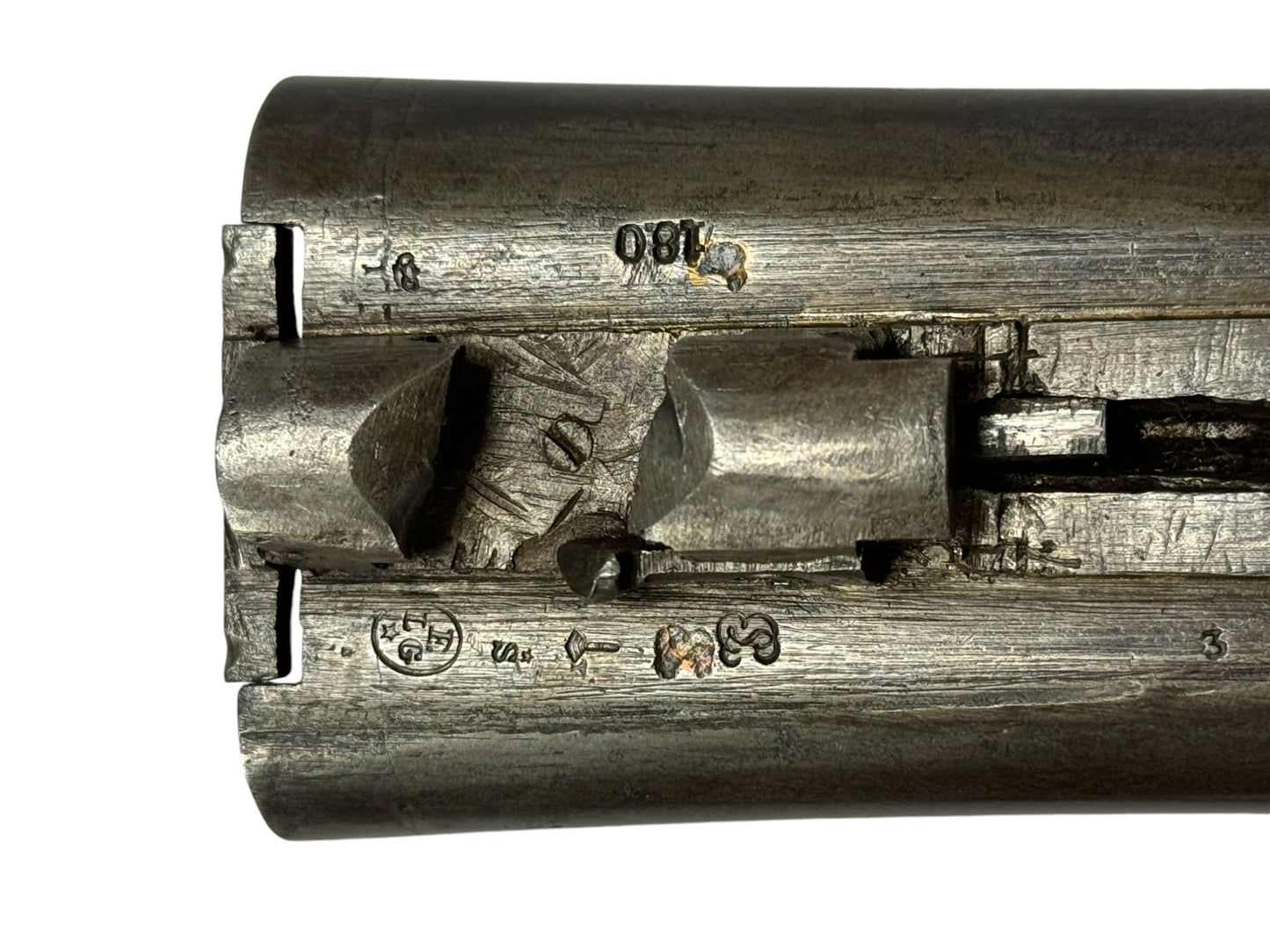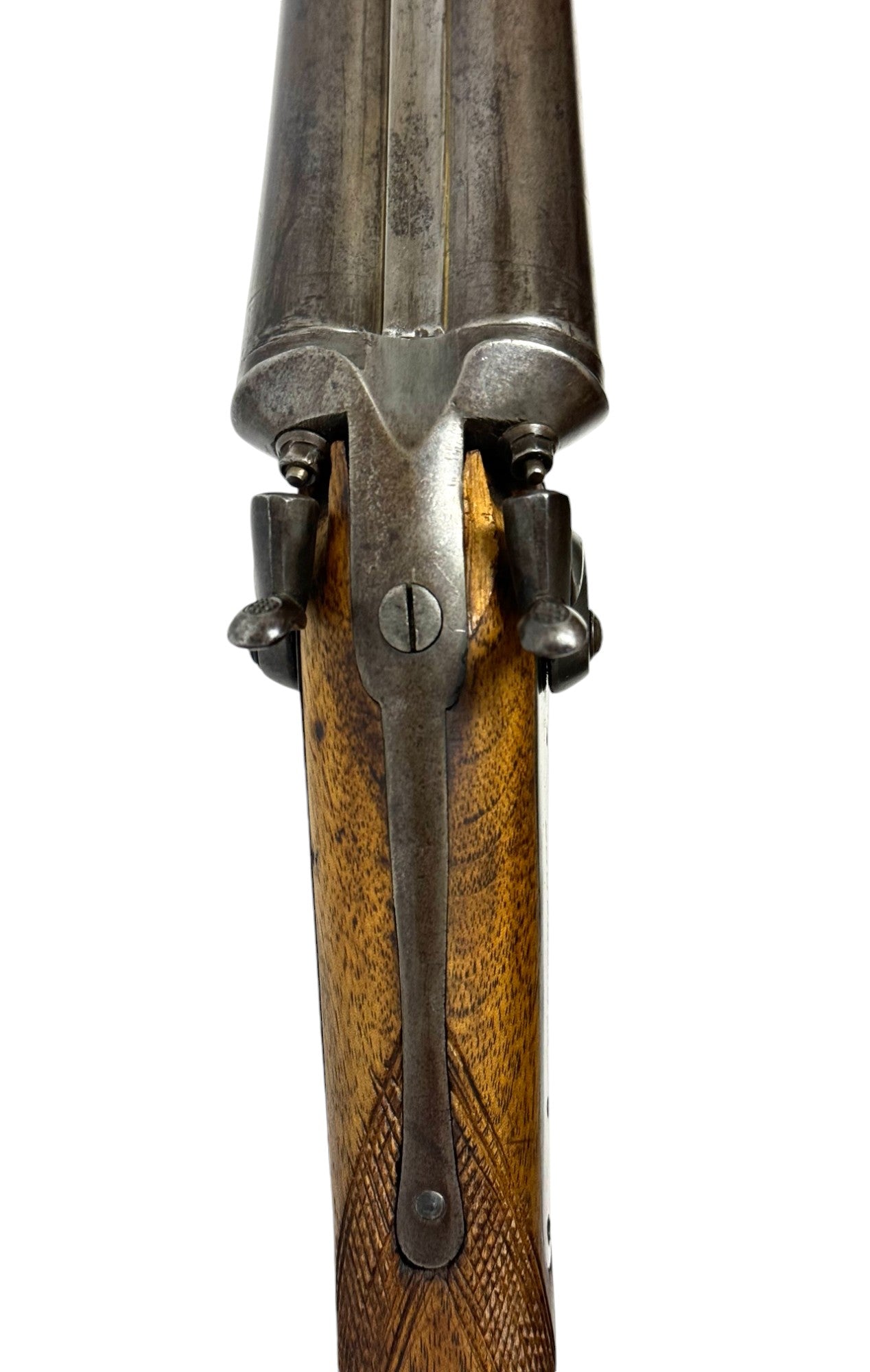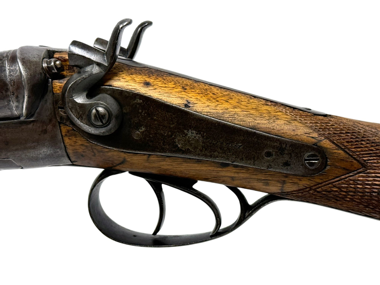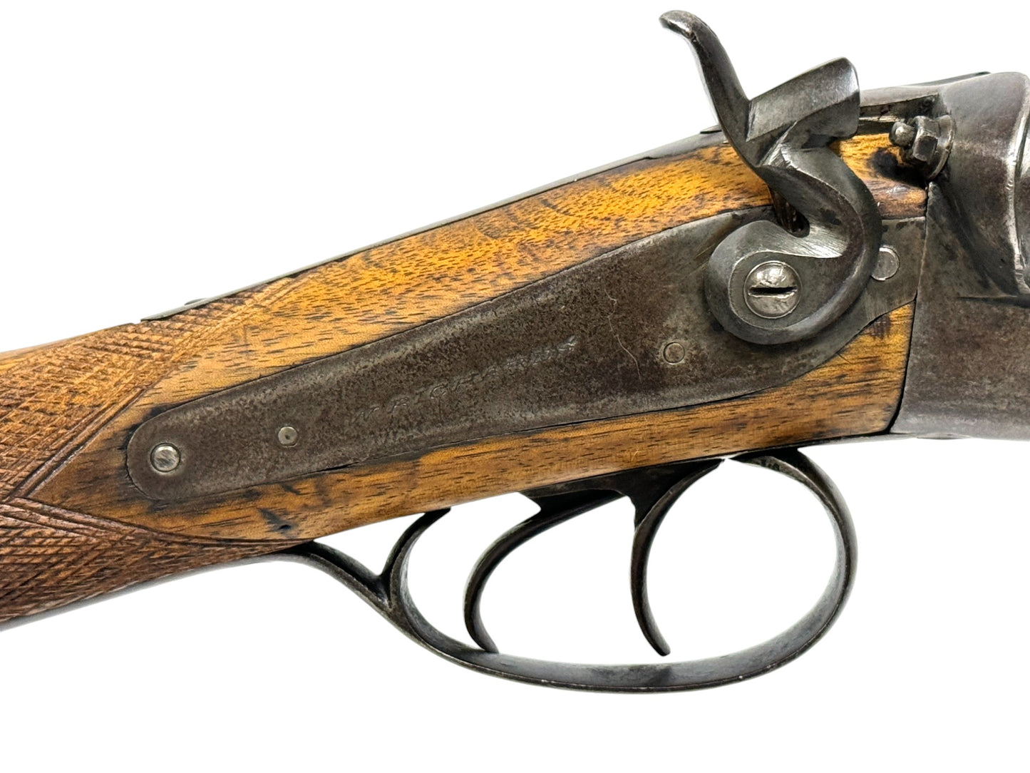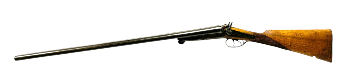 S#: 30540 | Mfg. circa 1895 | 30" Steel Barrels | 12 GA. | 14.5" LOP | Country of origin: Belgium | Refinished straight stock w/ steel butt plate w/ heel; underlever release; spring loaded strikers; leave hammers at half cocked |||| CONDITION: Good. Darkened patina on metal with clear markings. Smooth, sanded wood stock is in good, solid condition showing a few minor repairs and is finely re-checkered. Seems to mechanically function at full and half cock. Hammers must be left at half cock to keep firing pins in so barrel will open. Nice and tight lockup. Bores show some minor expected pitting throughout. See photos for more representative description