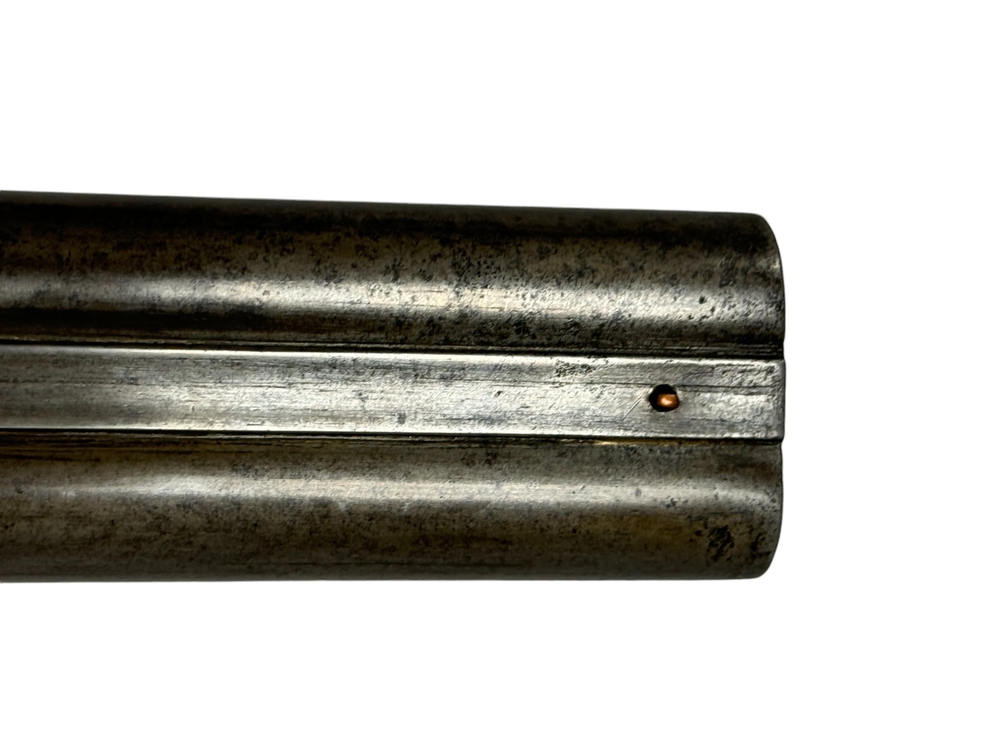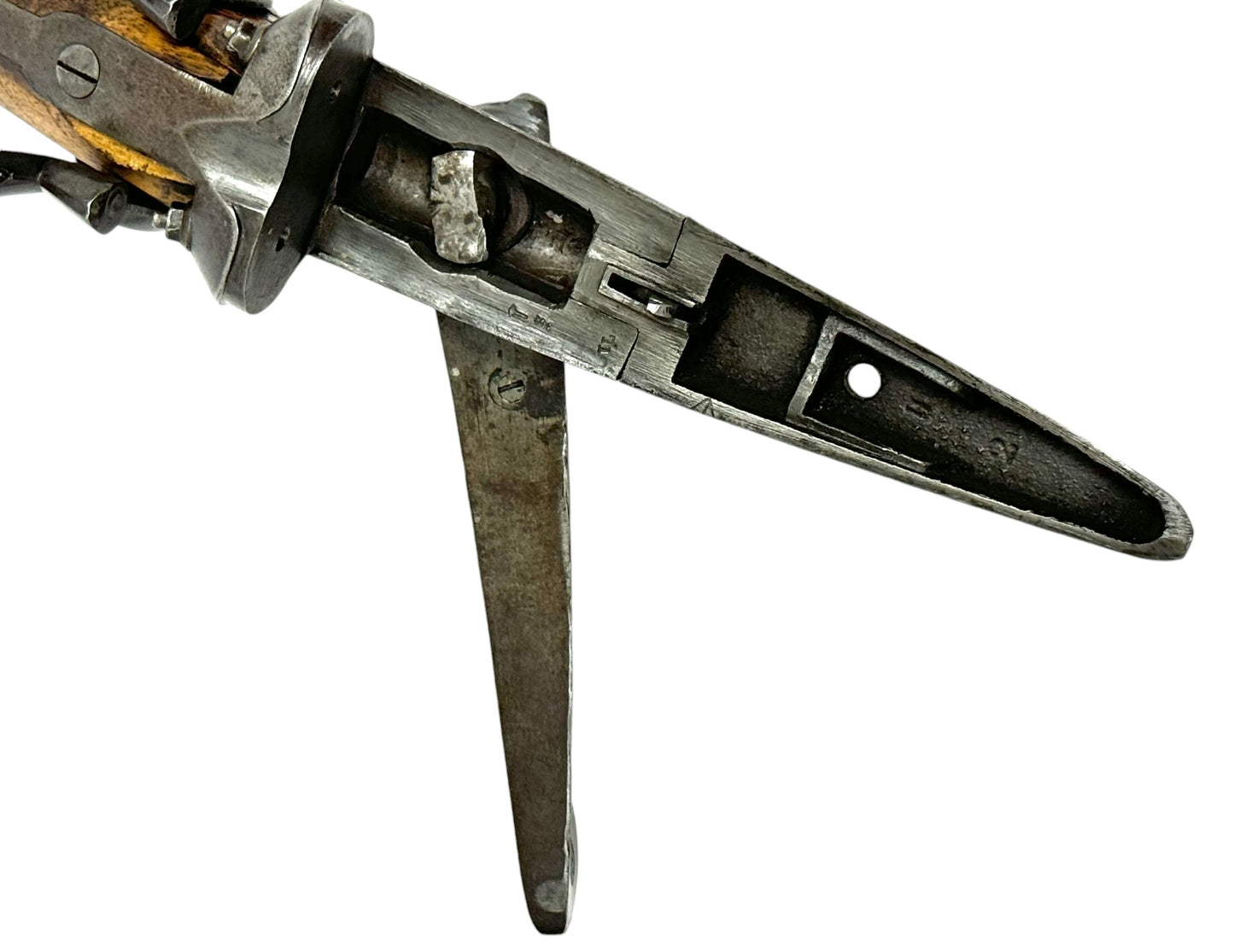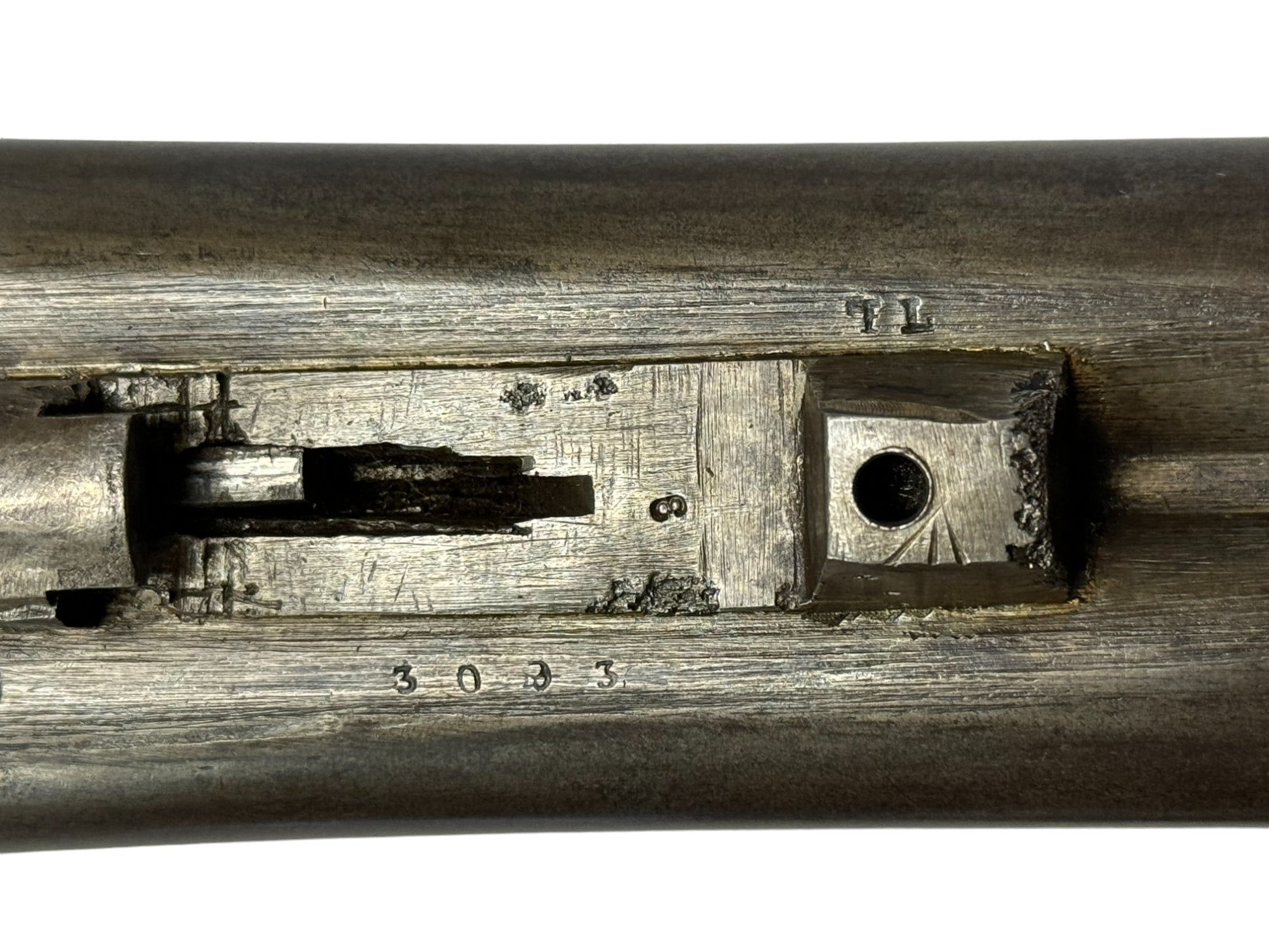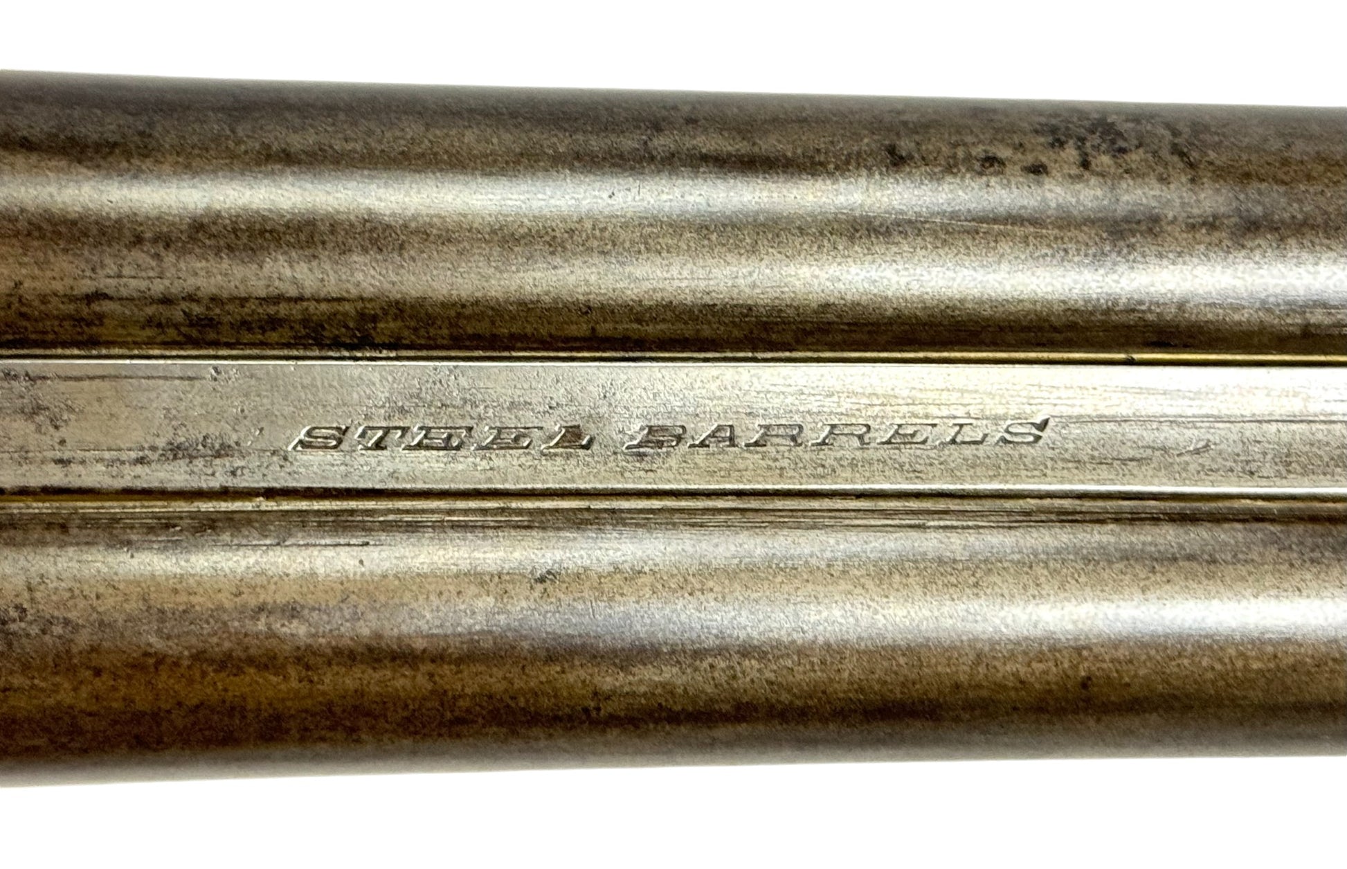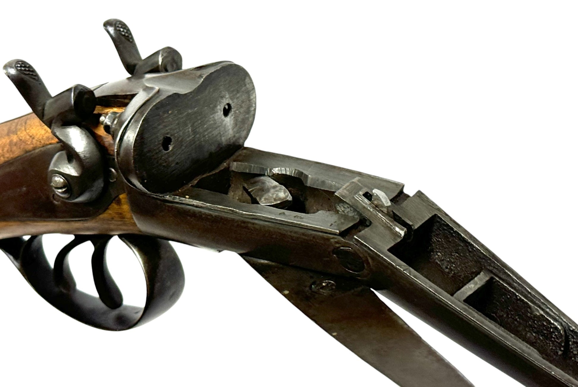 S#: 30540 | Mfg. circa 1895 | 30" Steel Barrels | 12 GA. | 14.5" LOP | Country of origin: Belgium | Refinished straight stock w/ steel butt plate w/ heel; underlever release; spring loaded strikers; leave hammers at half cocked |||| CONDITION: Good. Darkened patina on metal with clear markings. Smooth, sanded wood stock is in good, solid condition showing a few minor repairs and is finely re-checkered. Seems to mechanically function at full and half cock. Hammers must be left at half cock to keep firing pins in so barrel will open. Nice and tight lockup. Bores show some minor expected pitting throughout. See photos for more representative description