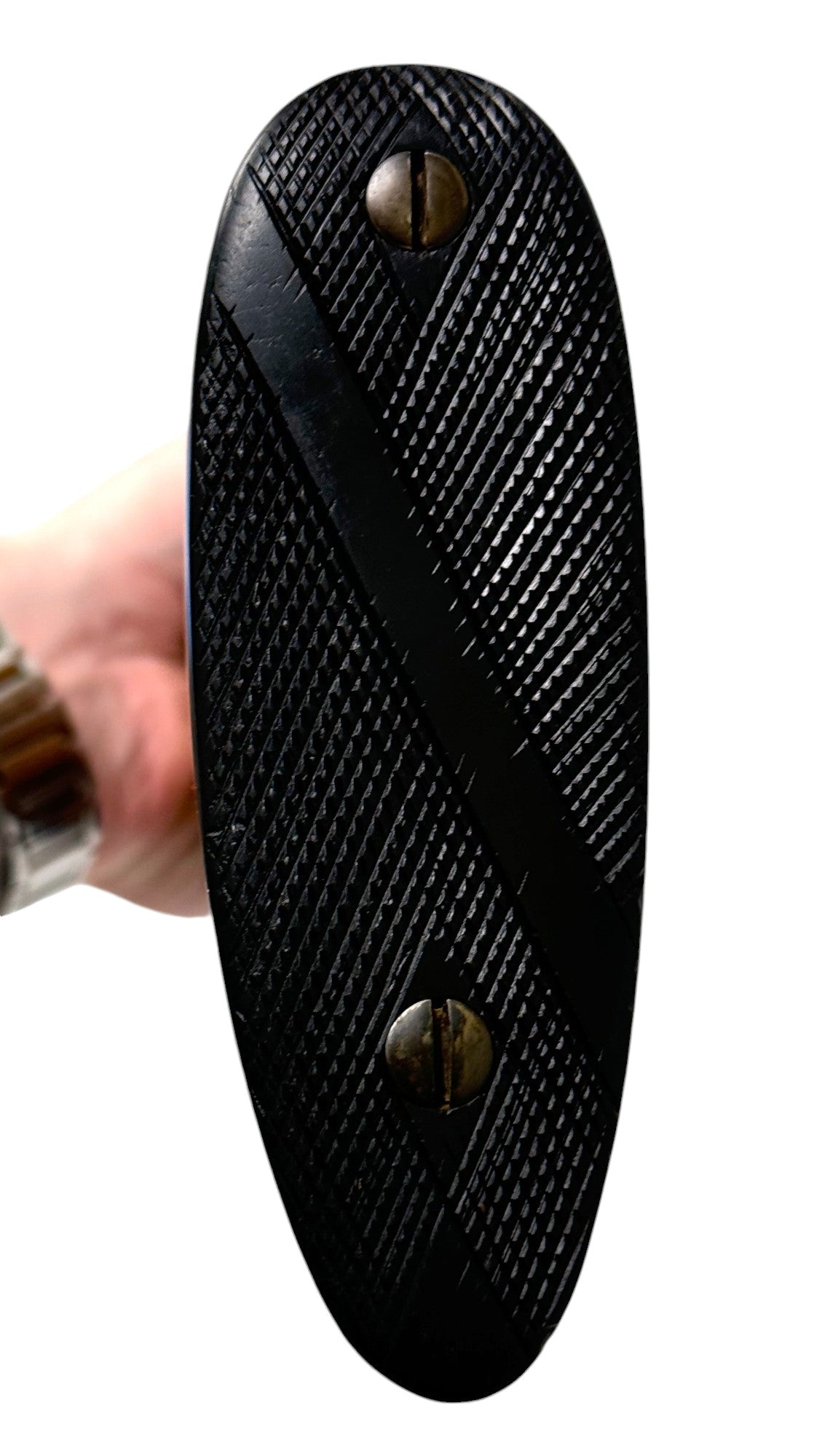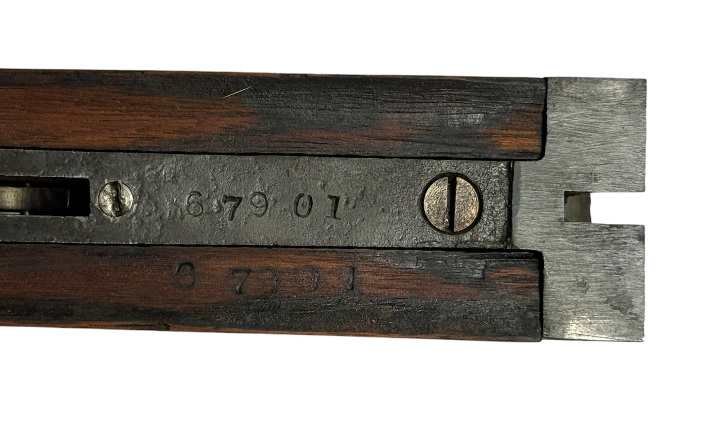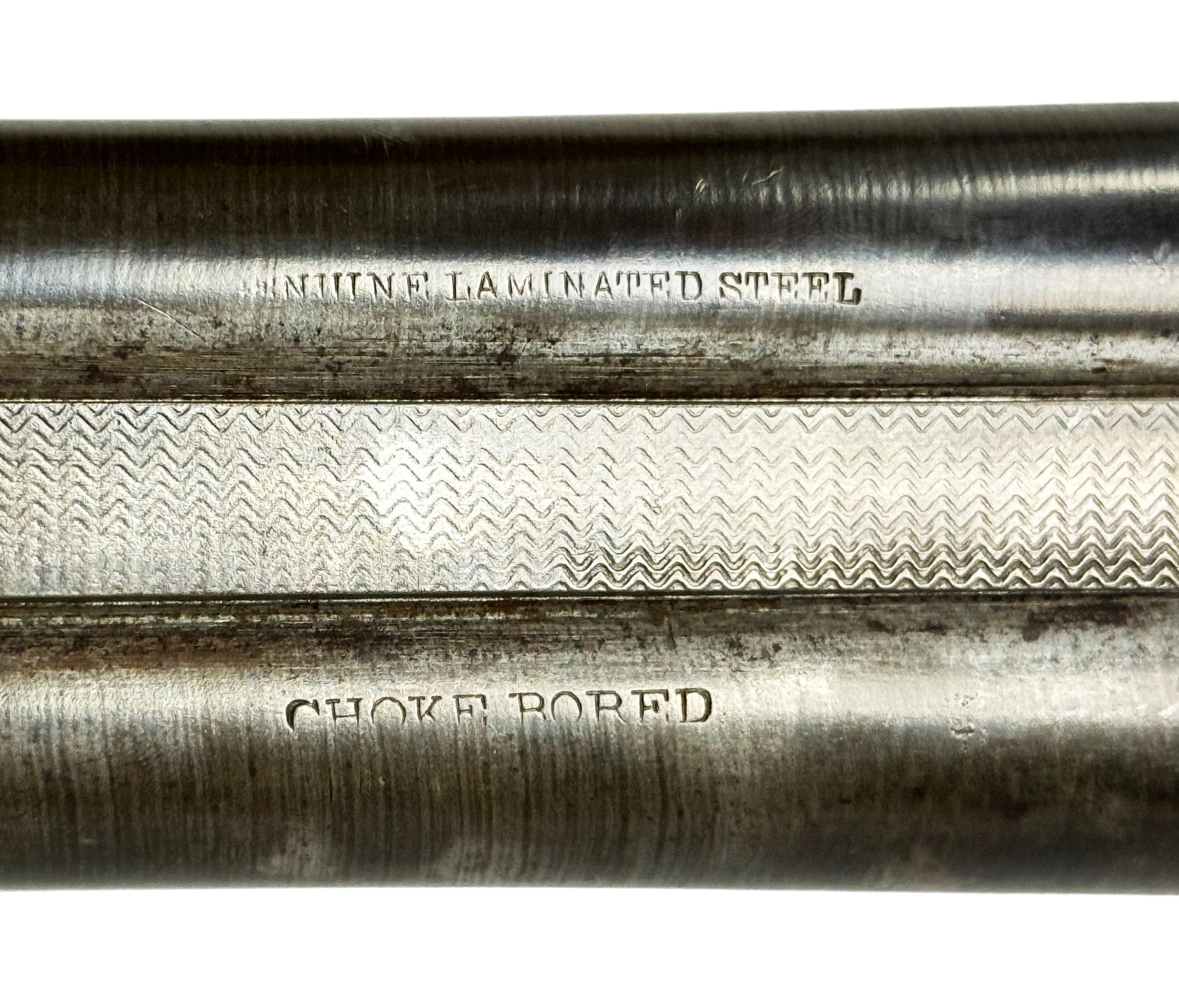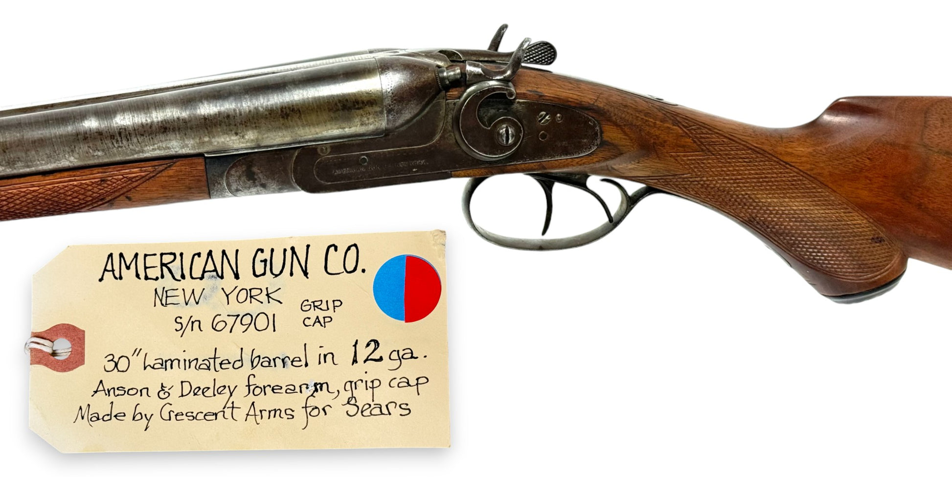 SN #: 67901 | Mfg. circa 1897 | 30" Laminated Barrels with rib extension | 12 GA. | 14" LOP | Country of origin: USA | Deeley release forearm; grip cap; refinished stock; made by Crescent Arms for Sears |||| CONDITION: Good. Dark patina metal finish. Clear markings. Wood stock is smooth and solid with refinished checkering. Seems to mechanically function with a smidge of play in the lockup. Bores are very good with some very minor pitting. See photos for more representative description.