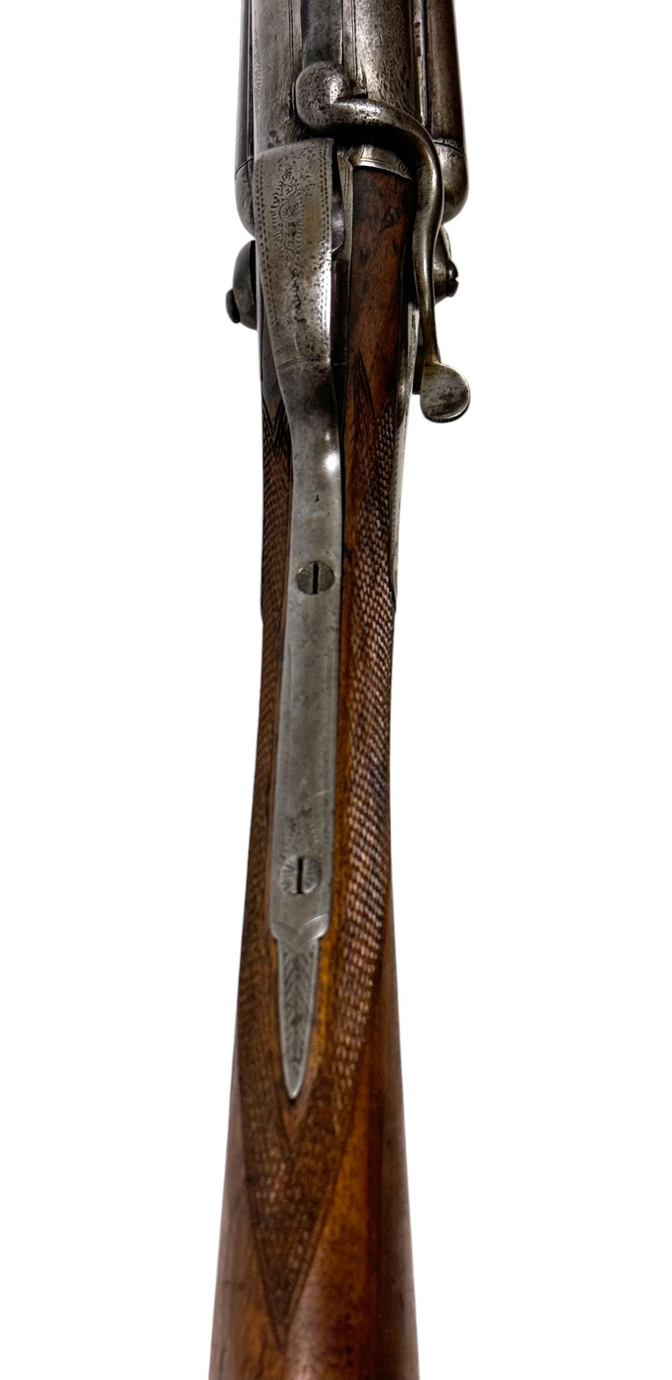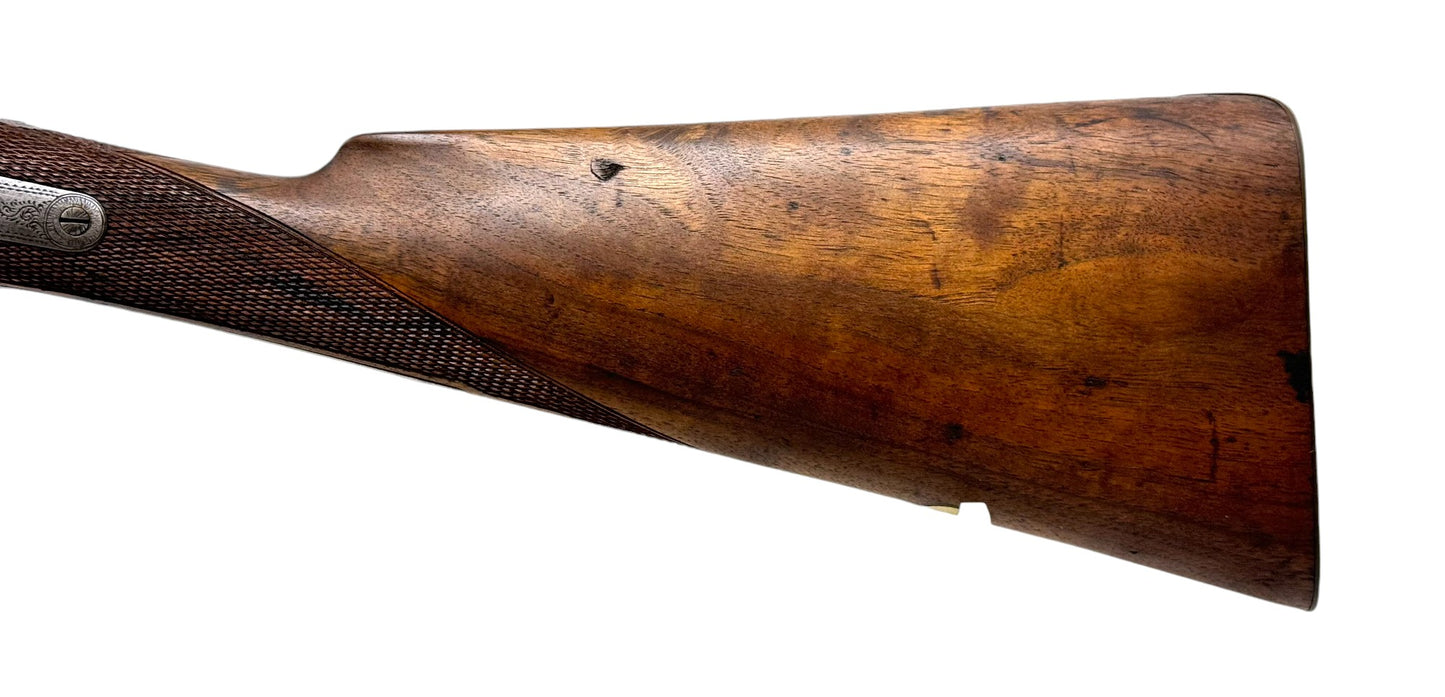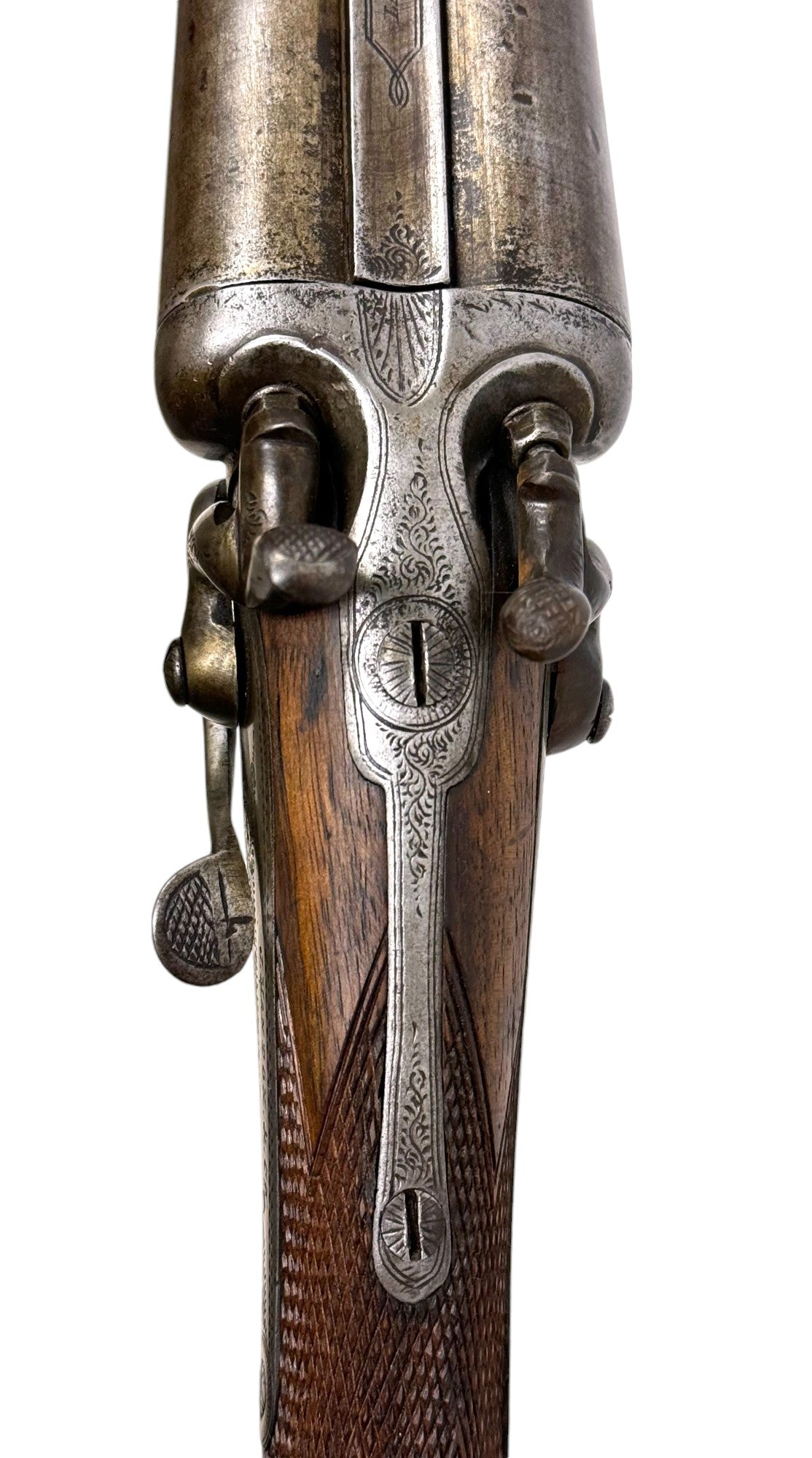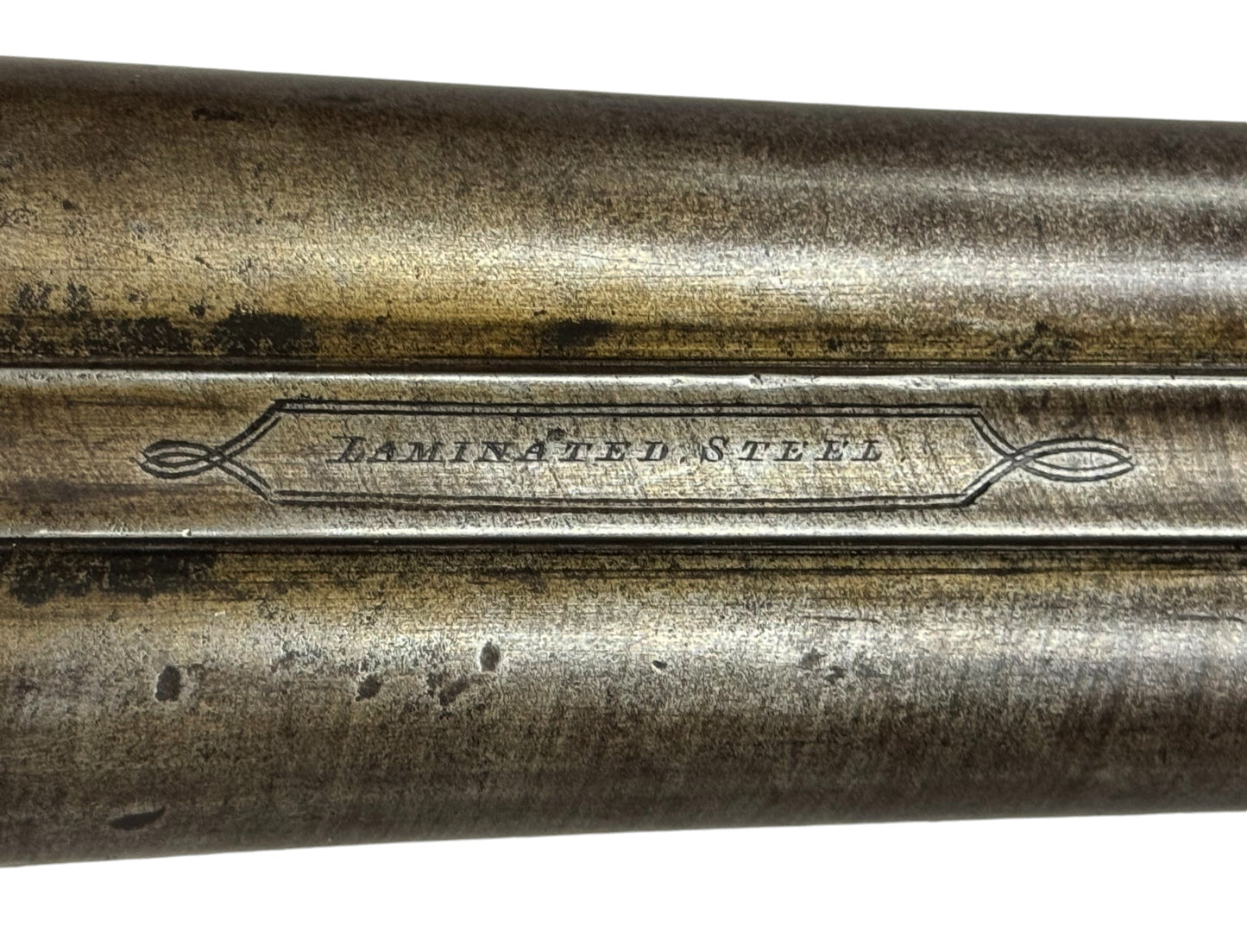 S#: 3408 | Mfg. circa 1885 (London, UK) | 29-5/8" Laminated Barrels | 12 GA. | 14.25" LOP | Country of origin: England | Wedge keeper forearm with engraved metal pull; Metal backlock butt plate with heel; side lever; oval inlay; Leave hammers at half cock |||| CONDITION: Good. Bare metal finish with patina. Clear markings. Nice engravings. A few darkened dinged spots throughout. Wood stock is excellent and solid with fine, sharp checkering. Forend is the same way with a nice metal inlay. Seems to mechanically function at both half and full cock. Left firing pin goes forward too far, needs some spring tension work. Sometimes issue with closing it due to extractor. Slight bit of play in the lockup. Bores show expected pitting. See photos for more. See photos for more representative description.