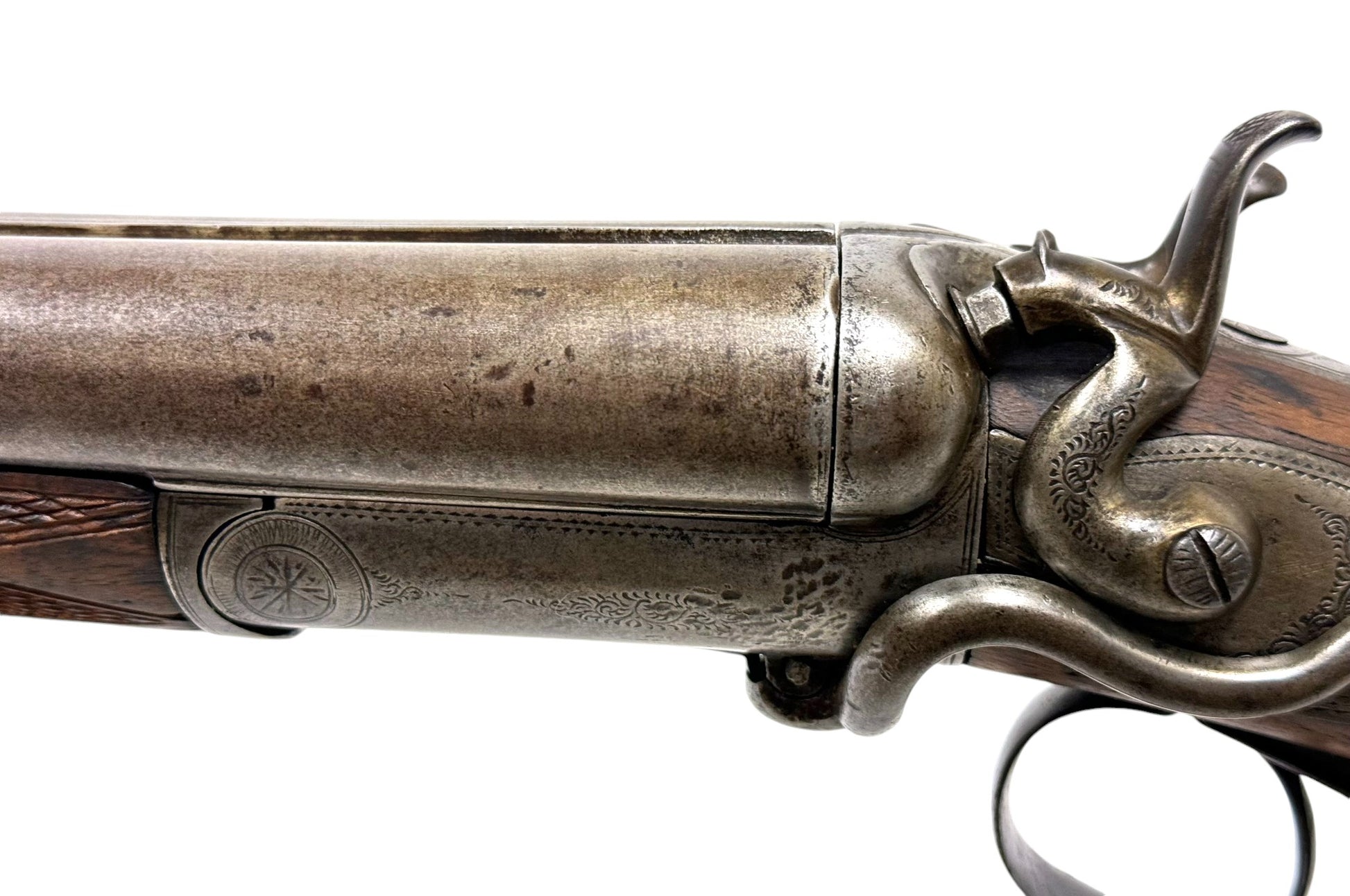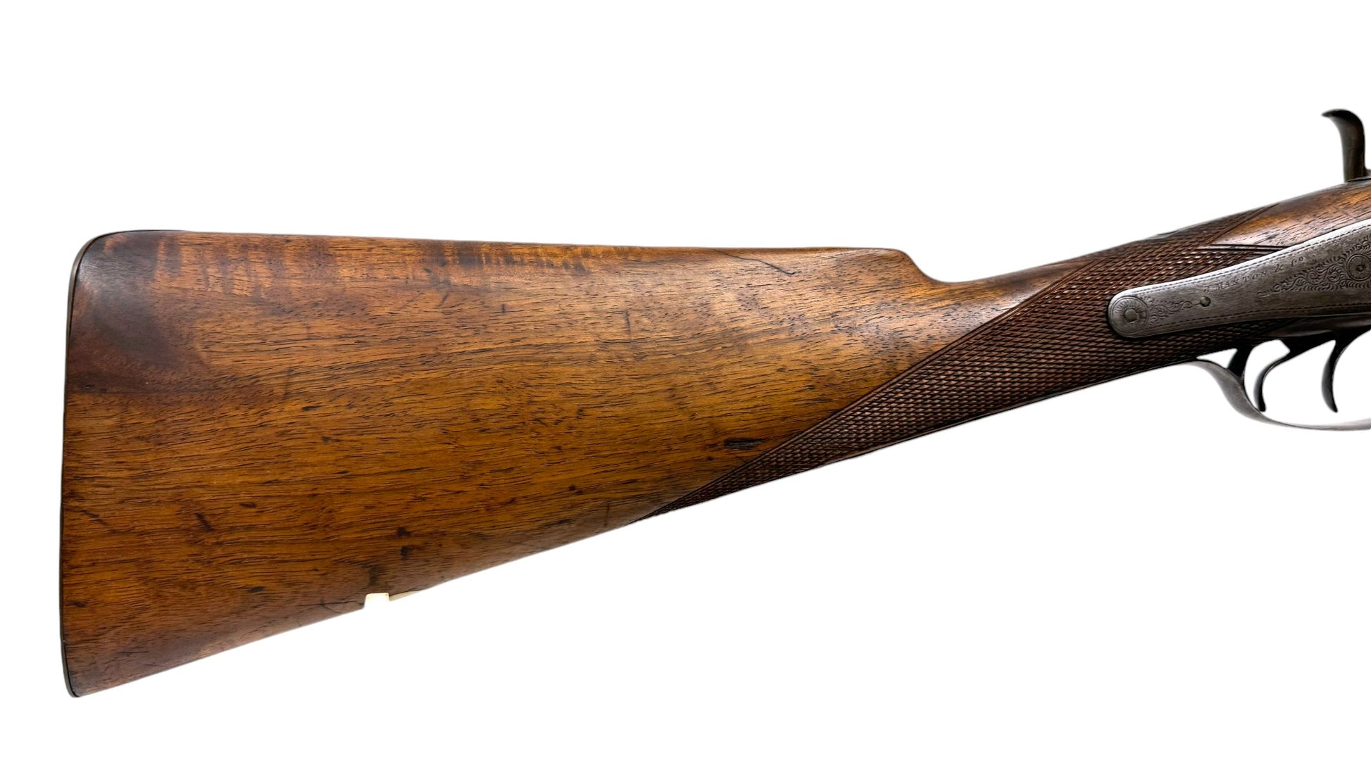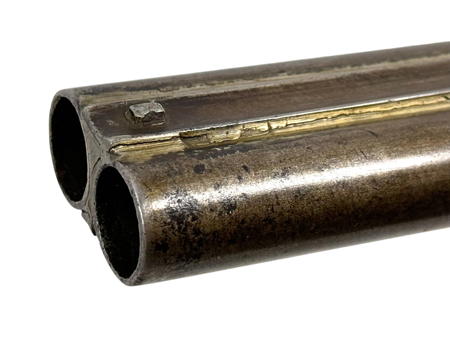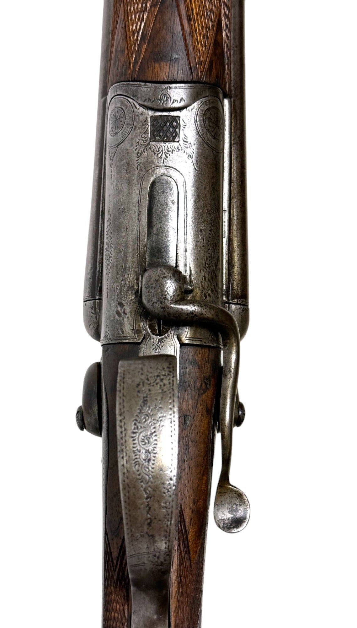 S#: 3408 | Mfg. circa 1885 (London, UK) | 29-5/8" Laminated Barrels | 12 GA. | 14.25" LOP | Country of origin: England | Wedge keeper forearm with engraved metal pull; Metal backlock butt plate with heel; side lever; oval inlay; Leave hammers at half cock |||| CONDITION: Good. Bare metal finish with patina. Clear markings. Nice engravings. A few darkened dinged spots throughout. Wood stock is excellent and solid with fine, sharp checkering. Forend is the same way with a nice metal inlay. Seems to mechanically function at both half and full cock. Left firing pin goes forward too far, needs some spring tension work. Sometimes issue with closing it due to extractor. Slight bit of play in the lockup. Bores show expected pitting. See photos for more. See photos for more representative description.