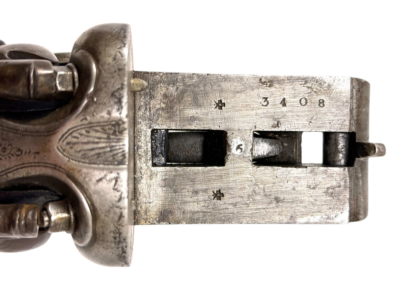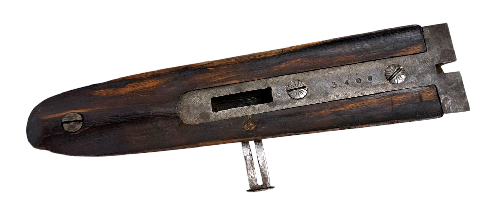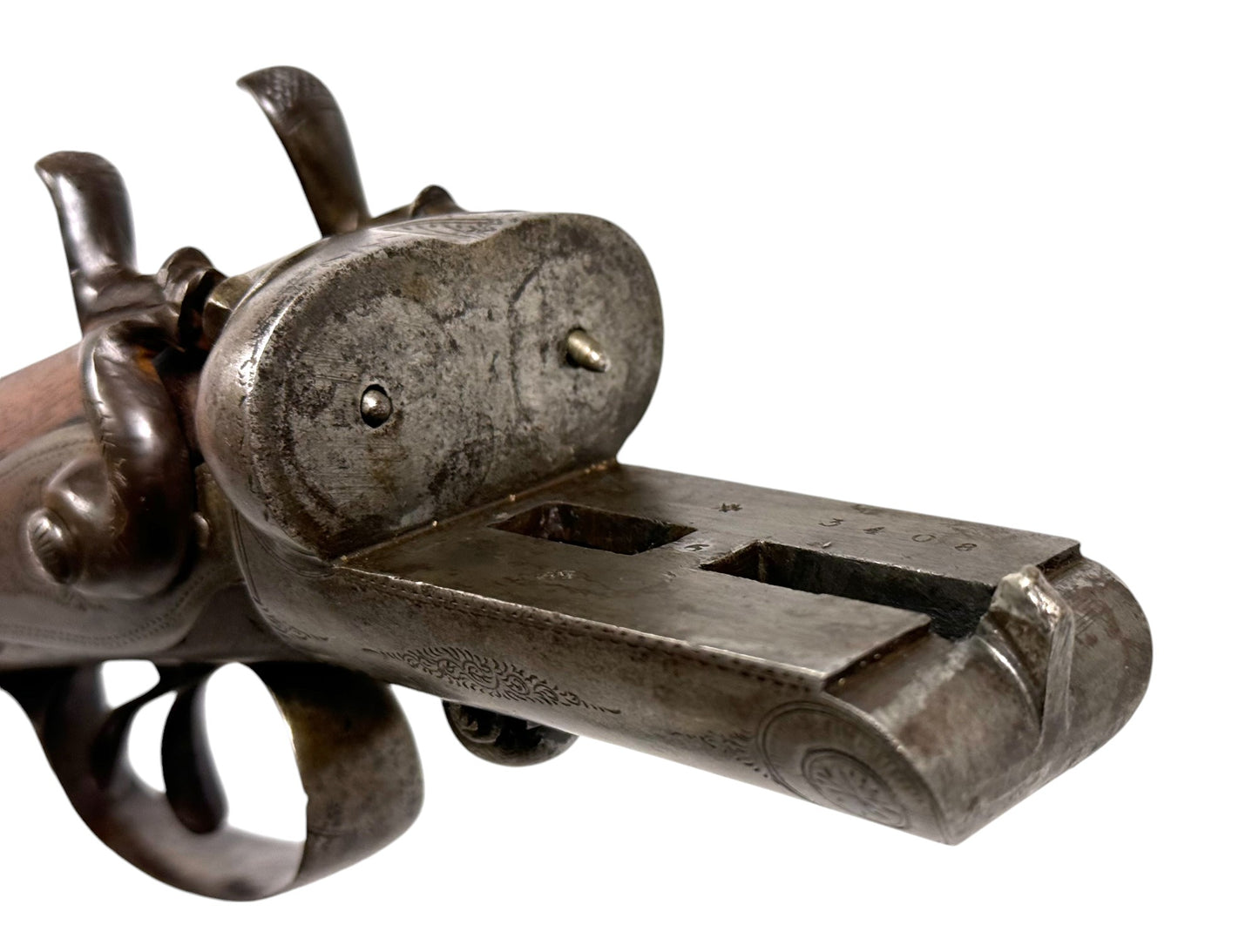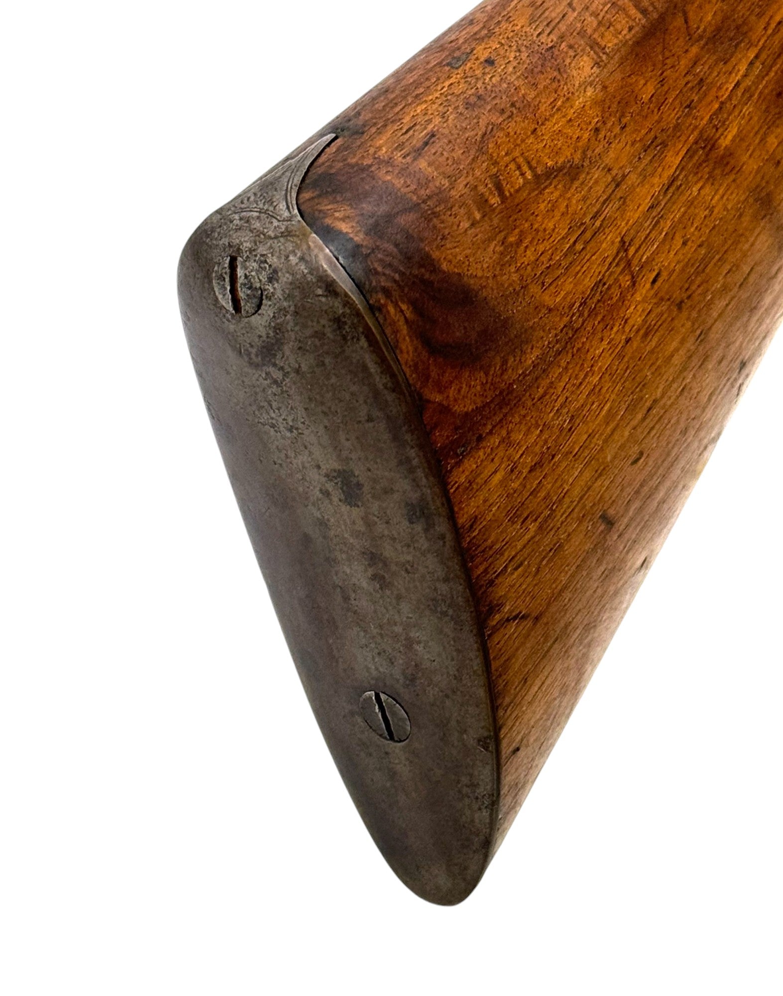 S#: 3408 | Mfg. circa 1885 (London, UK) | 29-5/8" Laminated Barrels | 12 GA. | 14.25" LOP | Country of origin: England | Wedge keeper forearm with engraved metal pull; Metal backlock butt plate with heel; side lever; oval inlay; Leave hammers at half cock |||| CONDITION: Good. Bare metal finish with patina. Clear markings. Nice engravings. A few darkened dinged spots throughout. Wood stock is excellent and solid with fine, sharp checkering. Forend is the same way with a nice metal inlay. Seems to mechanically function at both half and full cock. Left firing pin goes forward too far, needs some spring tension work. Sometimes issue with closing it due to extractor. Slight bit of play in the lockup. Bores show expected pitting. See photos for more. See photos for more representative description.