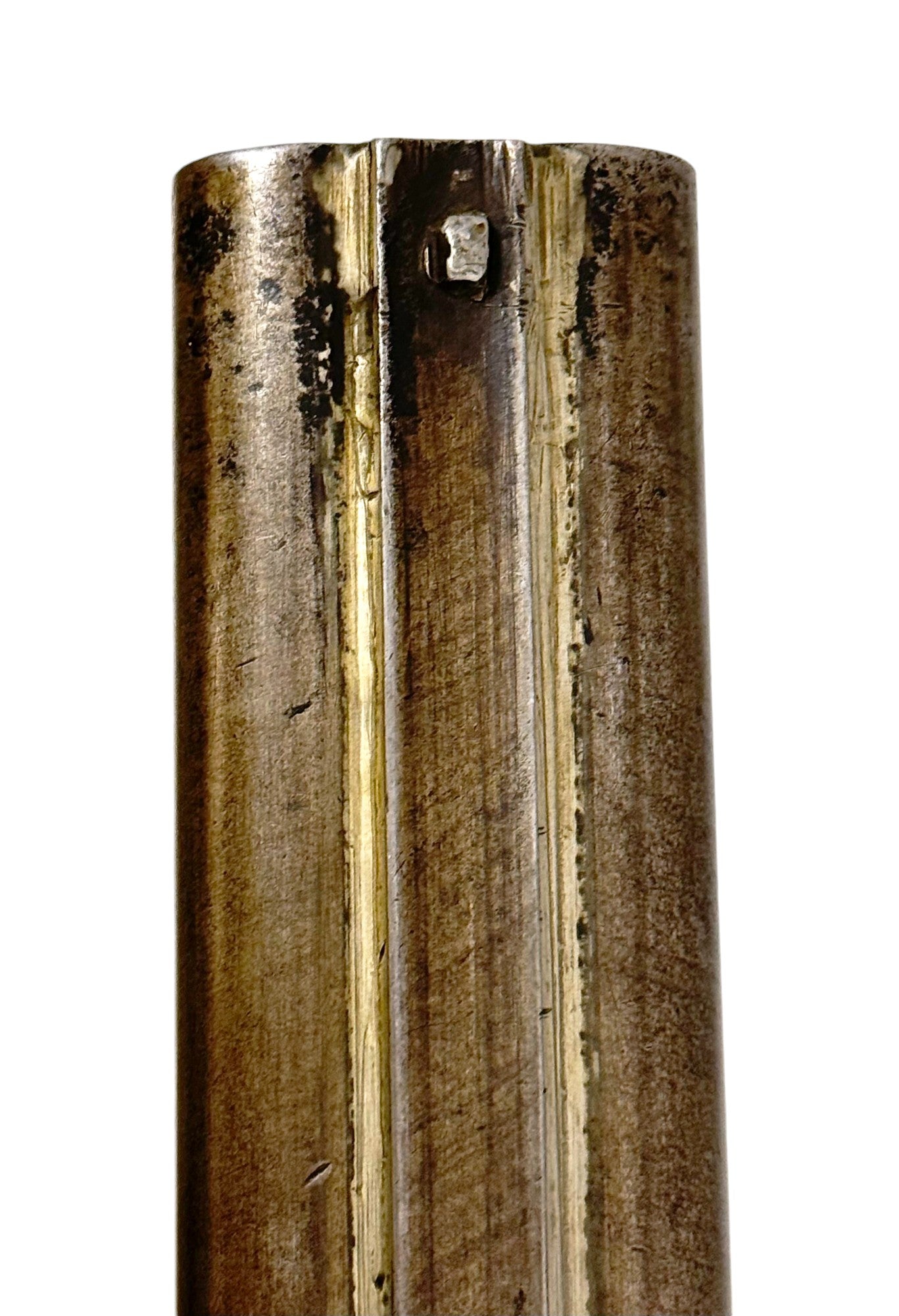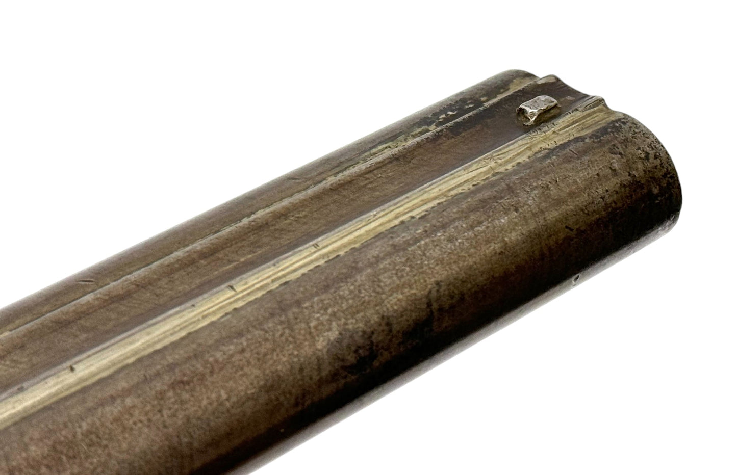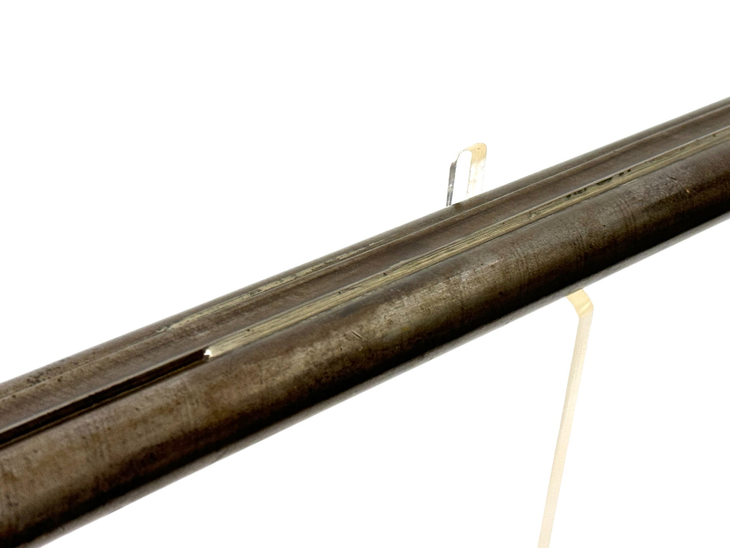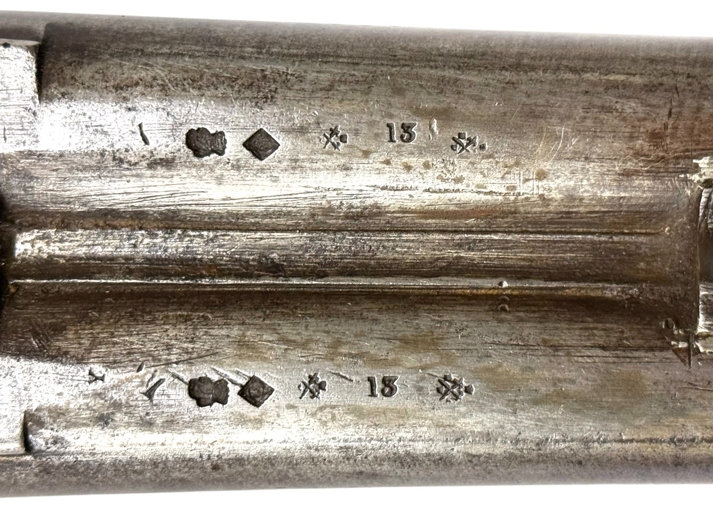 S#: 3408 | Mfg. circa 1885 (London, UK) | 29-5/8" Laminated Barrels | 12 GA. | 14.25" LOP | Country of origin: England | Wedge keeper forearm with engraved metal pull; Metal backlock butt plate with heel; side lever; oval inlay; Leave hammers at half cock |||| CONDITION: Good. Bare metal finish with patina. Clear markings. Nice engravings. A few darkened dinged spots throughout. Wood stock is excellent and solid with fine, sharp checkering. Forend is the same way with a nice metal inlay. Seems to mechanically function at both half and full cock. Left firing pin goes forward too far, needs some spring tension work. Sometimes issue with closing it due to extractor. Slight bit of play in the lockup. Bores show expected pitting. See photos for more. See photos for more representative description.
