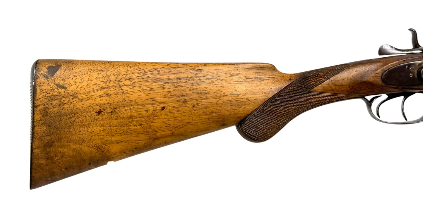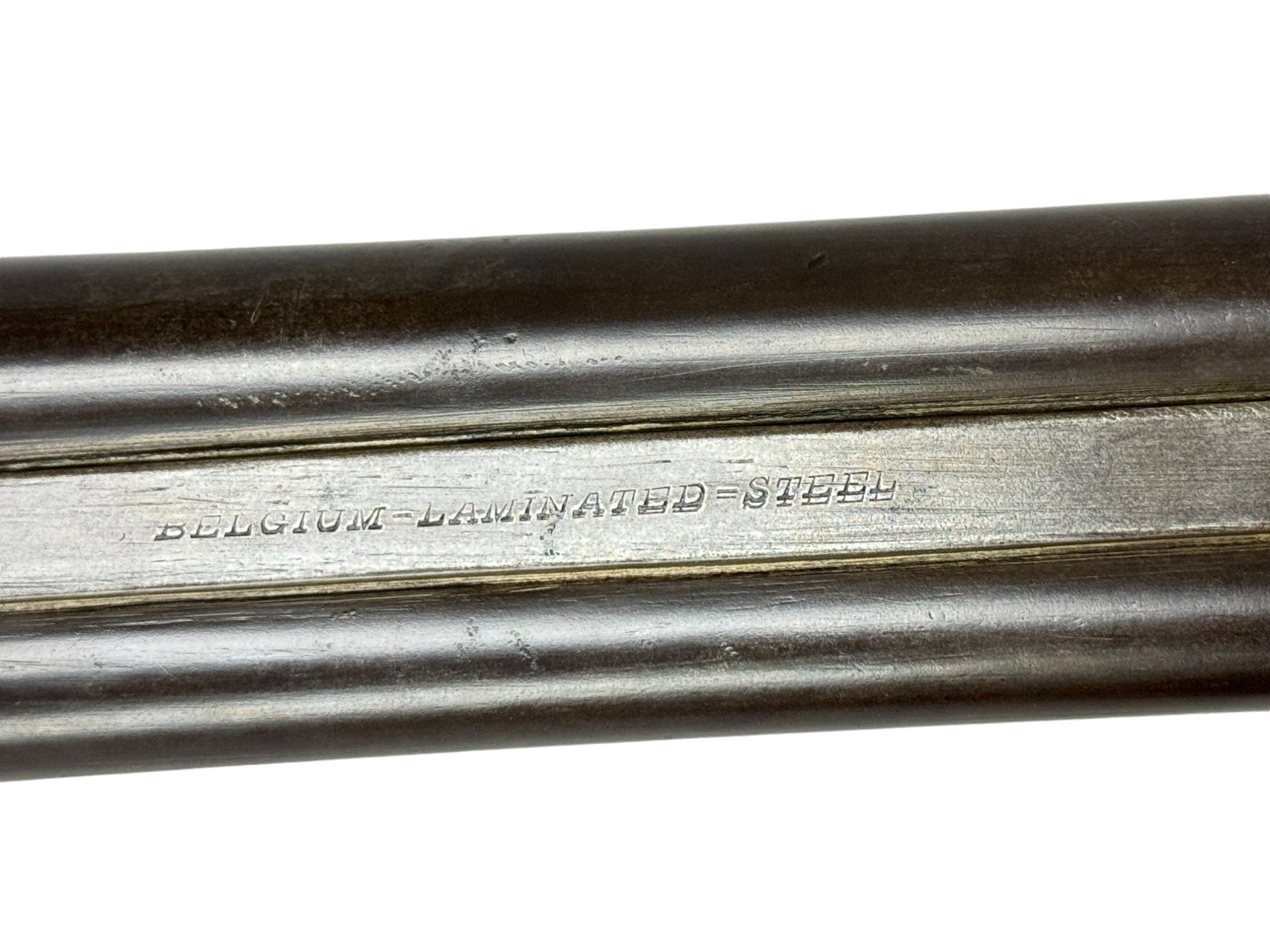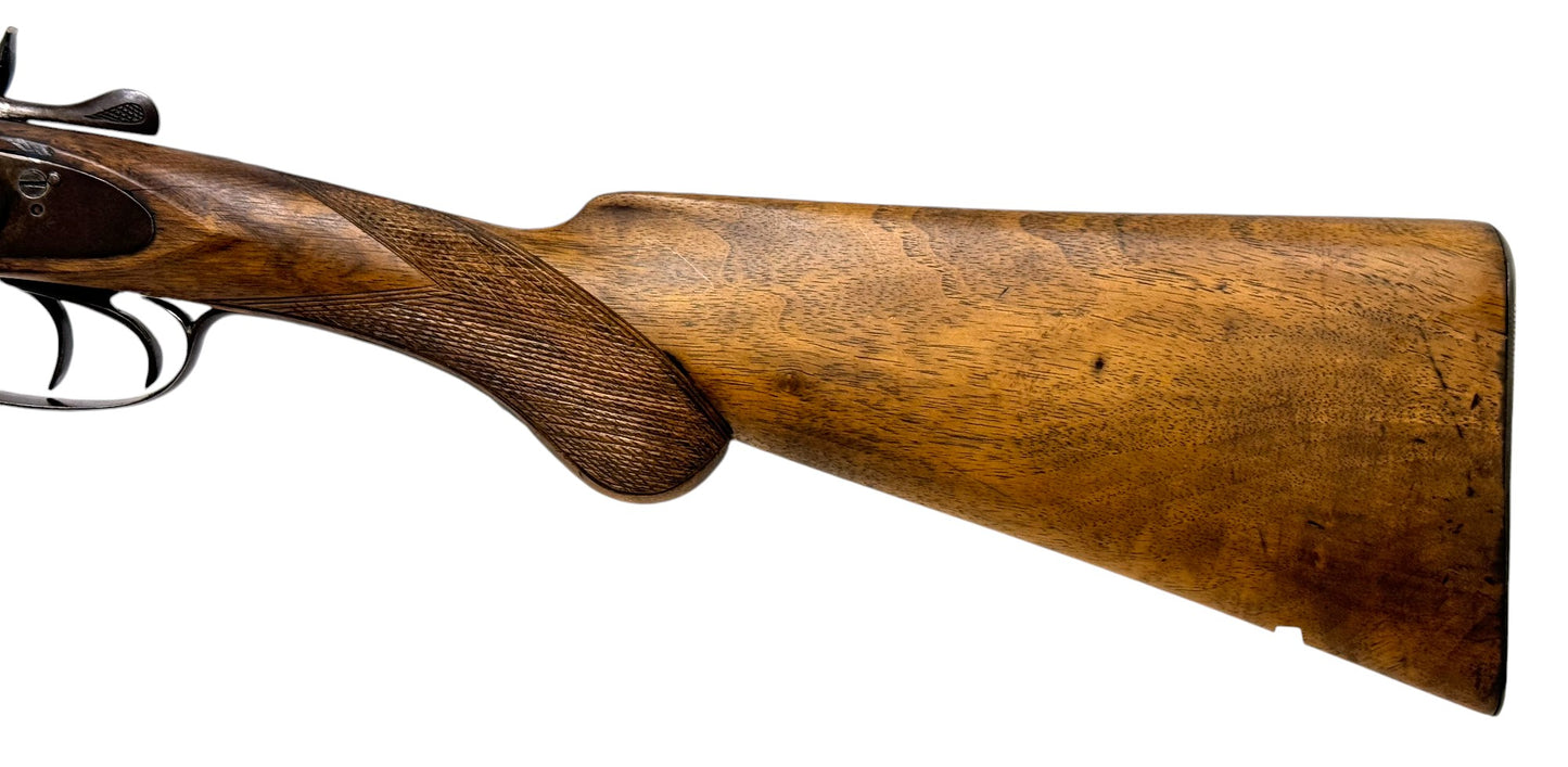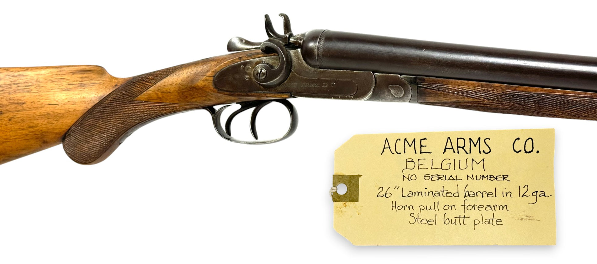 S#: NSN | Mfg. circa 1890 | 26" Laminated Barrels with Doll Head extension | 12 GA. | 14.5" LOP | Country of origin: Belgium | Horn pull on forearm; steel butt plate; refinished stock |||| CONDITION: Moderate. Dark gray patina finish. Wood stock is good and solid. Forend is good with horn pull inlay. Seems to mechanically function with play in the lockup. Hammers are extremely tight and right hammer is broken. Bores are good with minor expected pitting. See photos for more representative description.