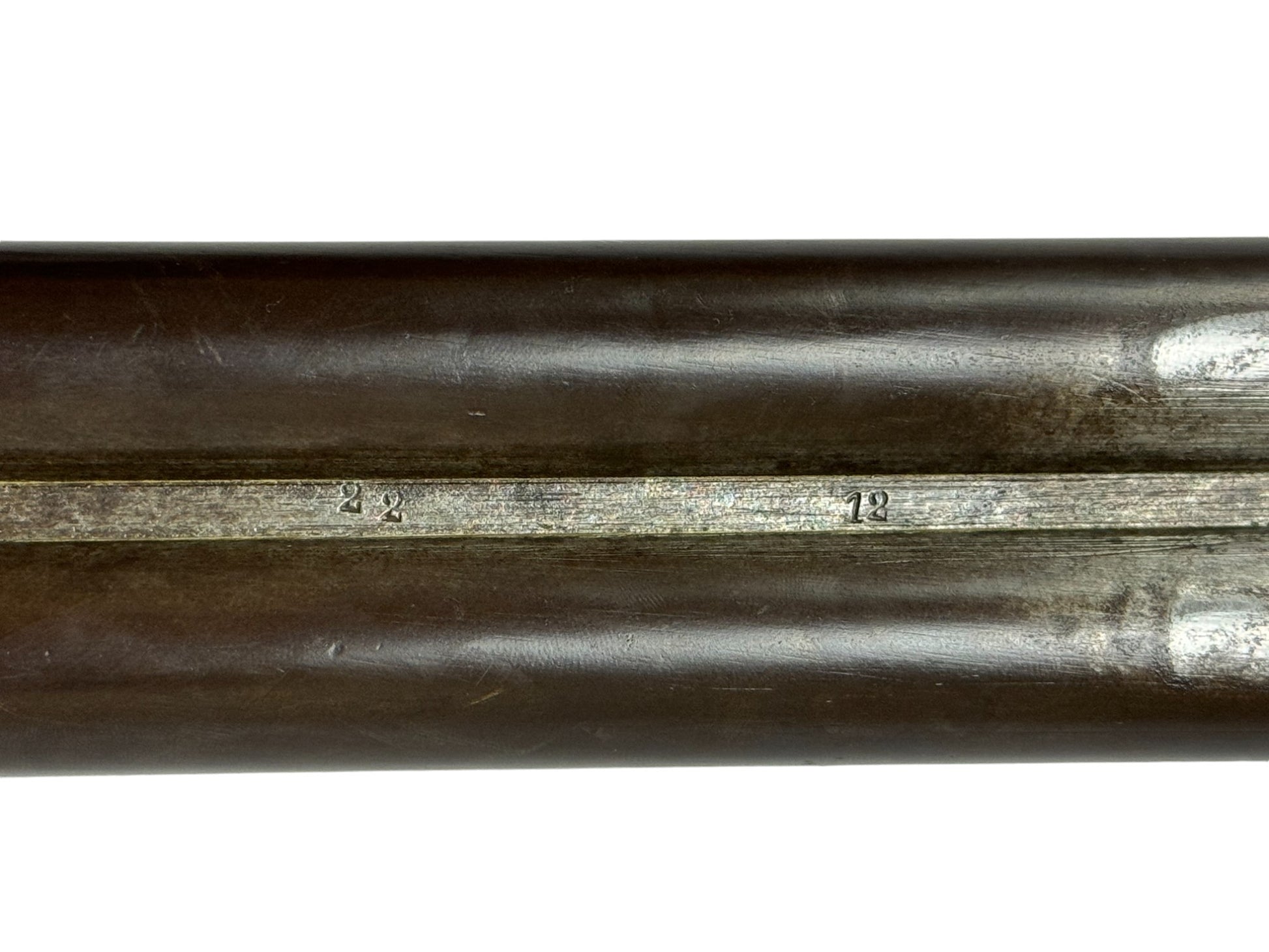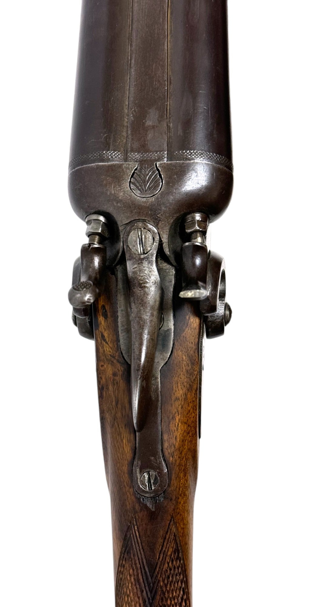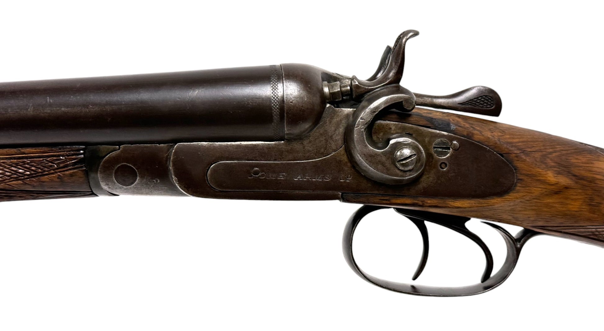S#: NSN | Mfg. circa 1890 | 26" Laminated Barrels with Doll Head extension | 12 GA. | 14.5" LOP | Country of origin: Belgium | Horn pull on forearm; steel butt plate; refinished stock |||| CONDITION: Moderate. Dark gray patina finish. Wood stock is good and solid. Forend is good with horn pull inlay. Seems to mechanically function with play in the lockup. Hammers are extremely tight and right hammer is broken. Bores are good with minor expected pitting. See photos for more representative description.