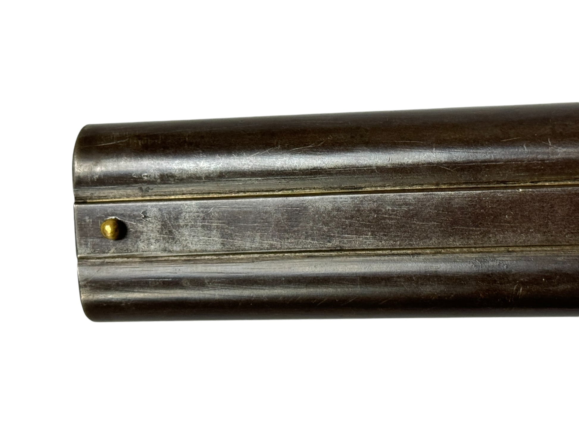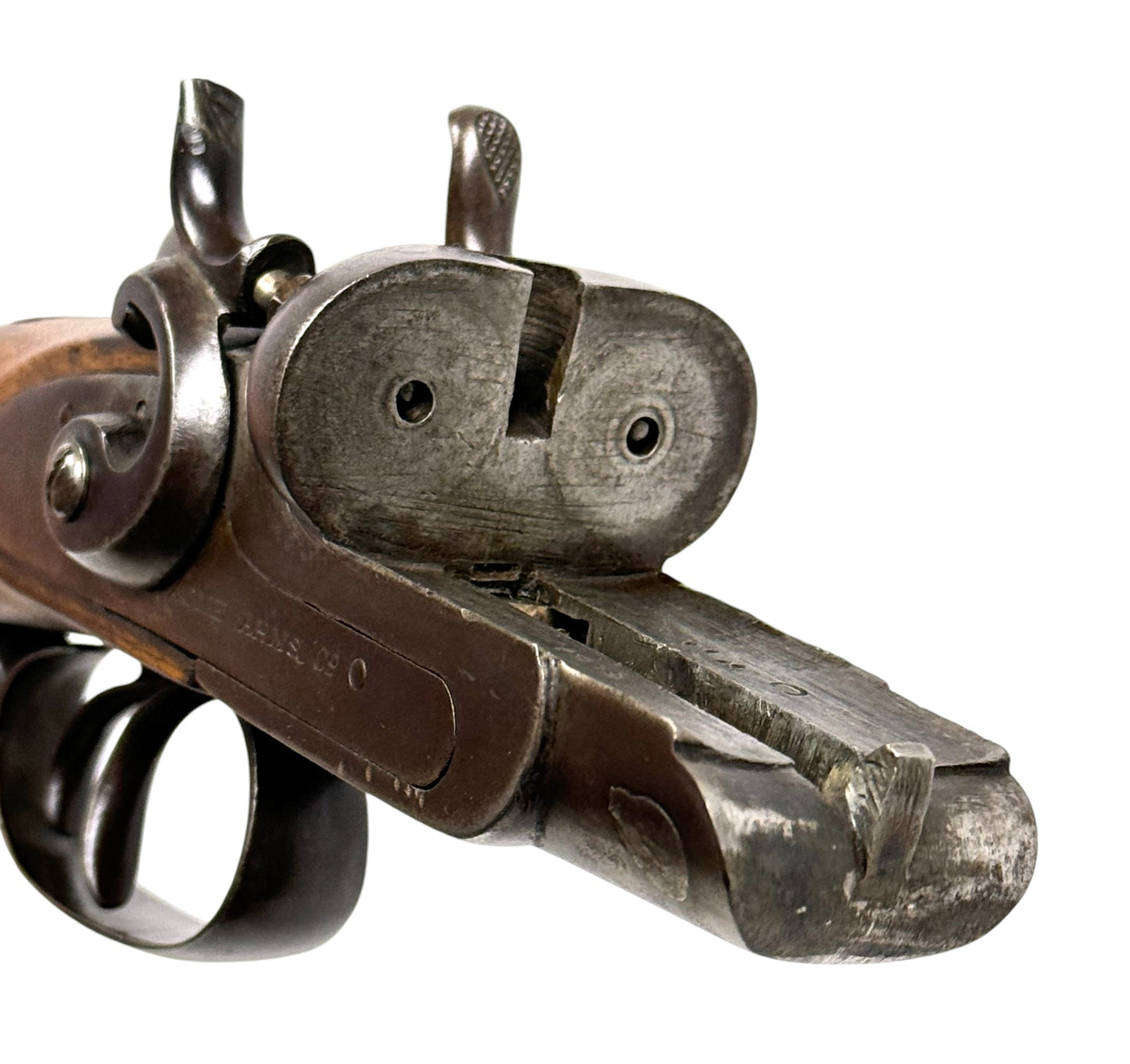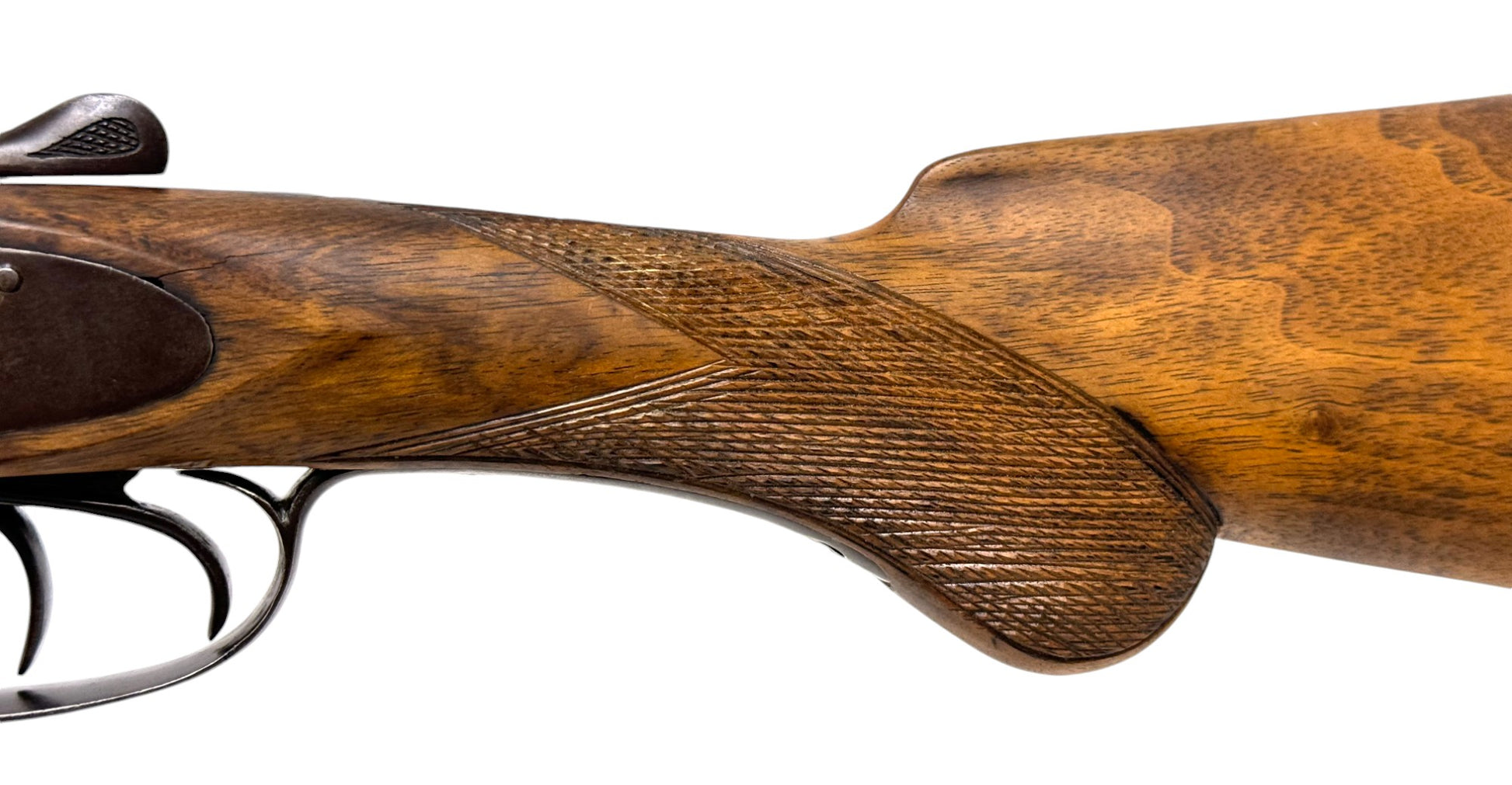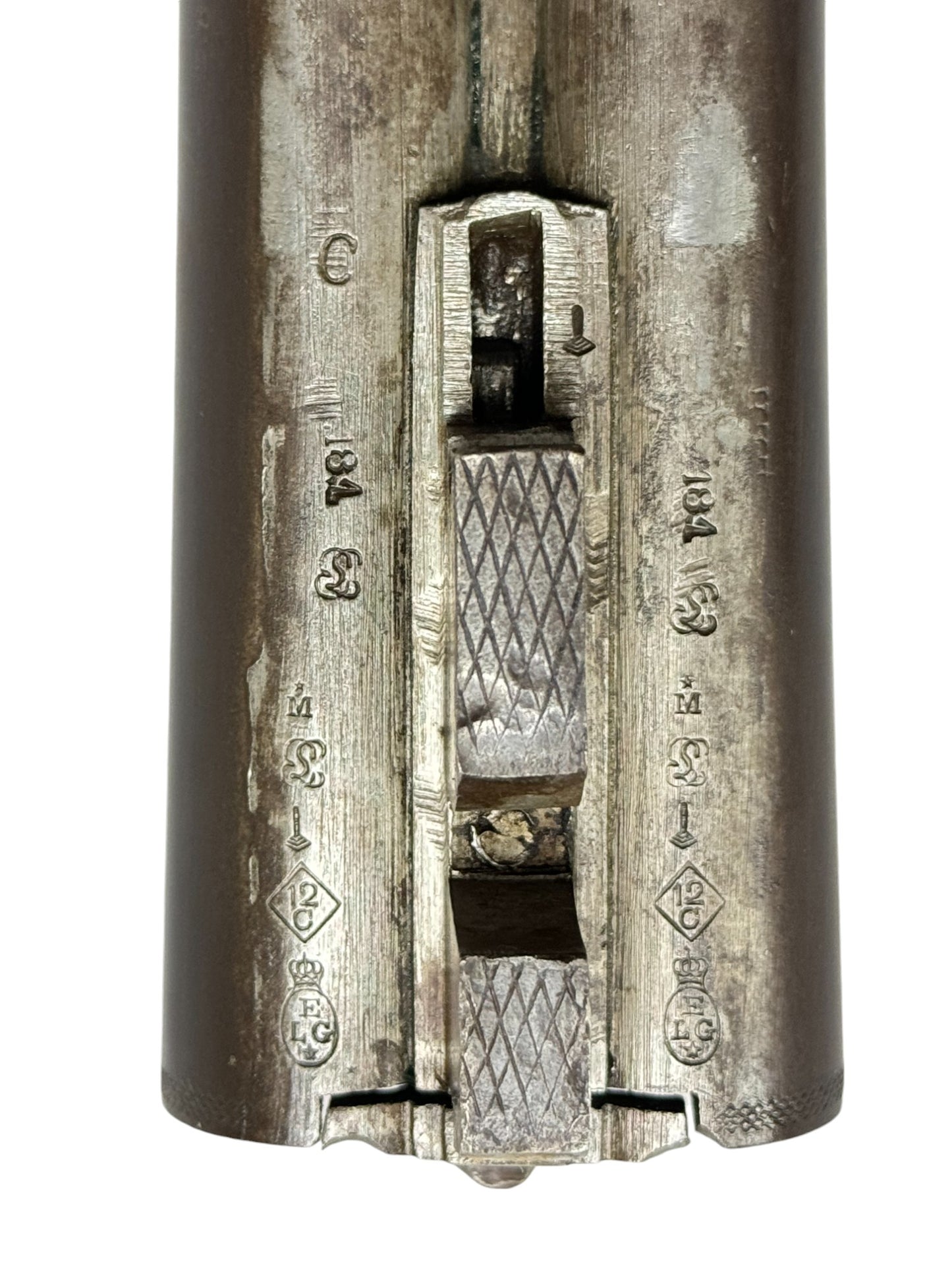 S#: NSN | Mfg. circa 1890 | 26" Laminated Barrels with Doll Head extension | 12 GA. | 14.5" LOP | Country of origin: Belgium | Horn pull on forearm; steel butt plate; refinished stock |||| CONDITION: Moderate. Dark gray patina finish. Wood stock is good and solid. Forend is good with horn pull inlay. Seems to mechanically function with play in the lockup. Hammers are extremely tight and right hammer is broken. Bores are good with minor expected pitting. See photos for more representative description.