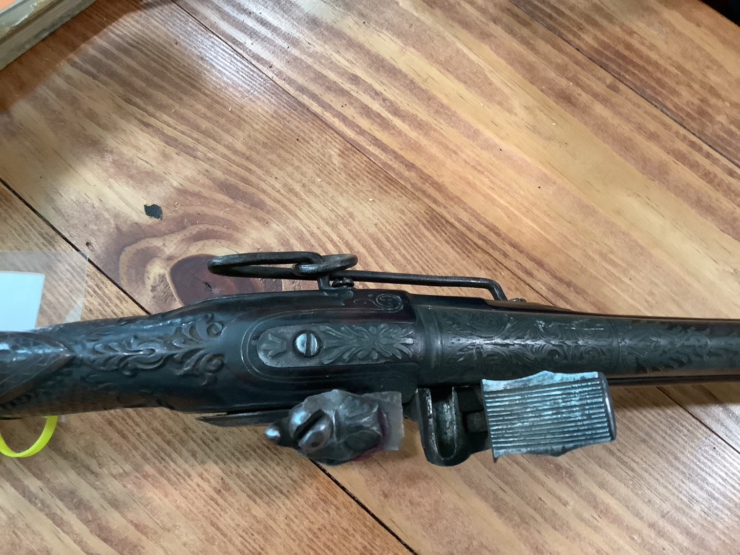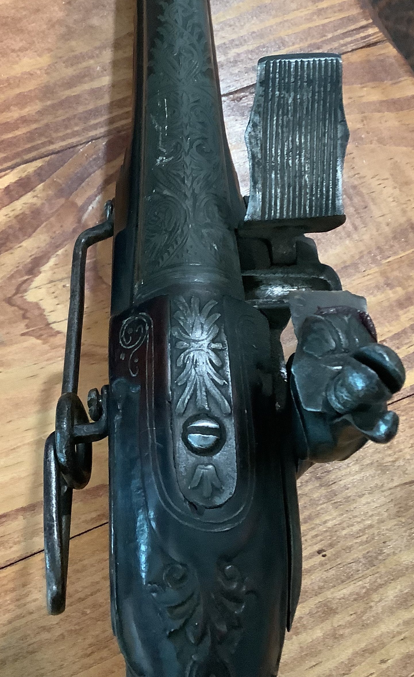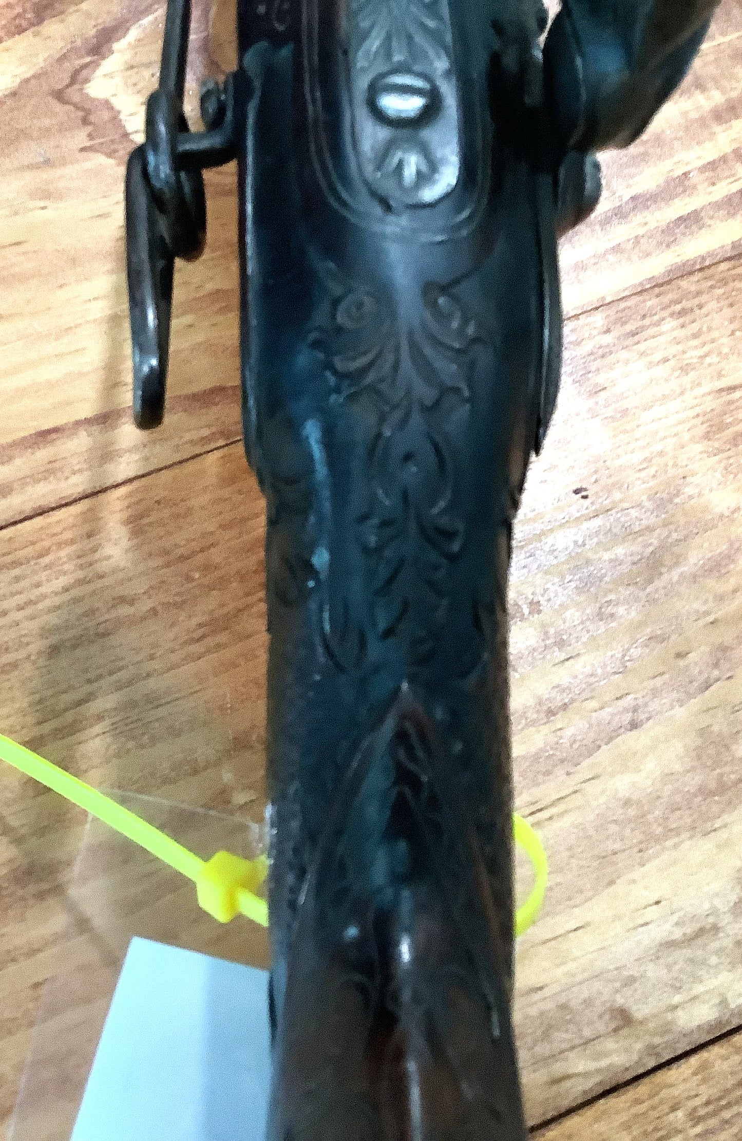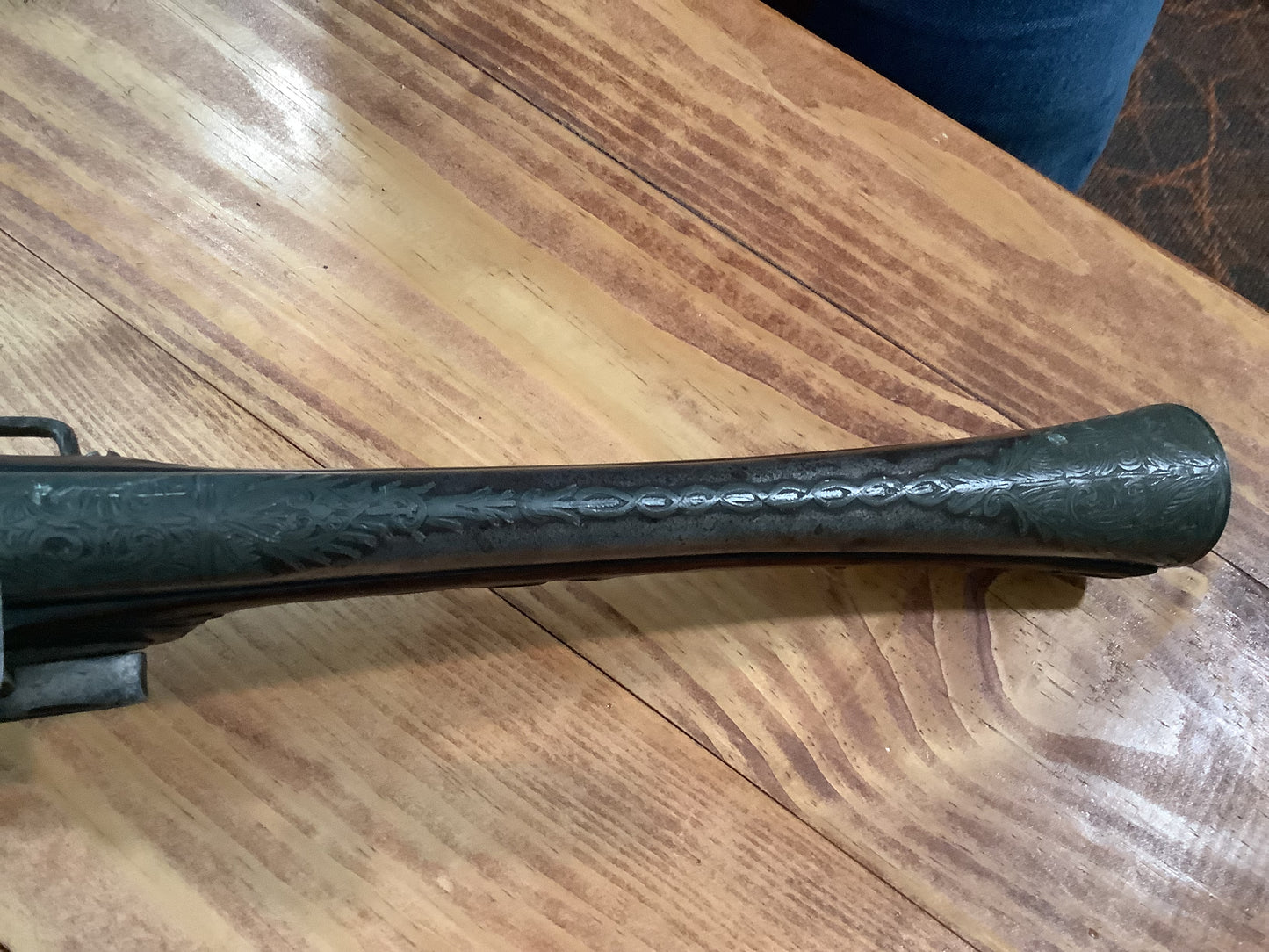Turkish/Ottoman Flintlock Knee Pistol - Blunderbuss (Dag). 11.75" flared barrel 1.5". Silver inlay, Detail carvings in stock; Embossed/Engraved barrel, with additional embellishment. Engraved trigger guard, lock plate, frizzed, hammer and barrel. Under barrel removable wooden ramrod. Metal Saddle ring. NVSN. Most likely made late1700's - early 1800's compared to similar weapons. What a beautiful and fun piece of history to hold and admire. Wasn't really sure I wanted to put this up for sale, but here it is ... for the moment.
