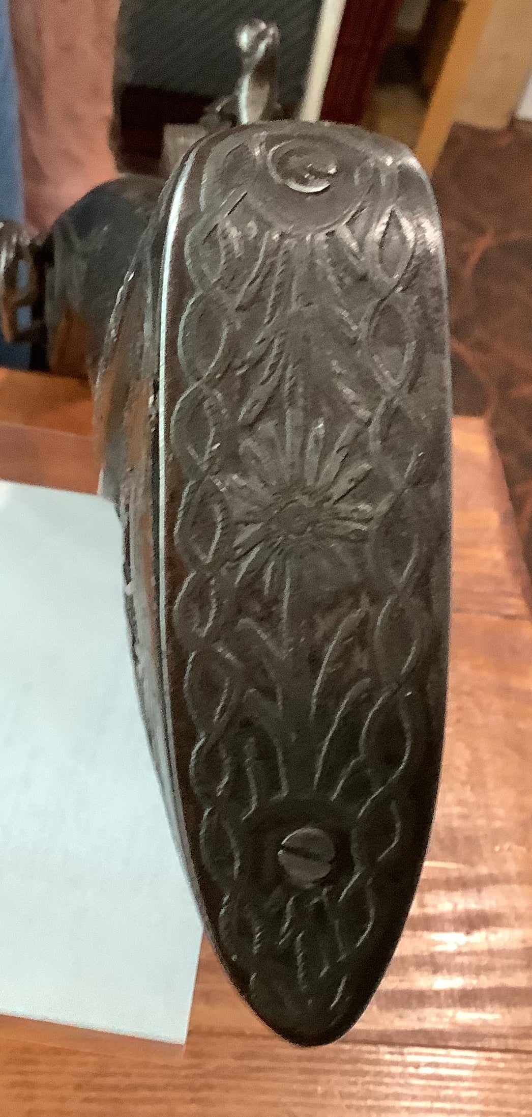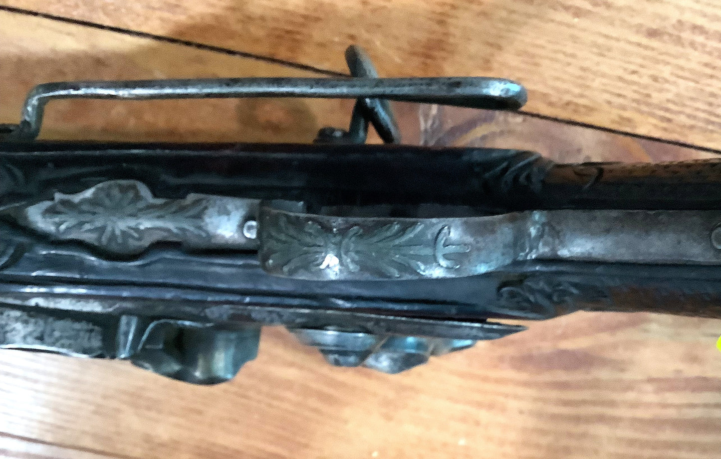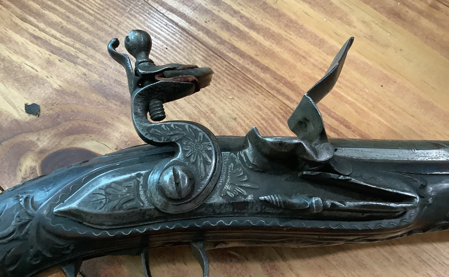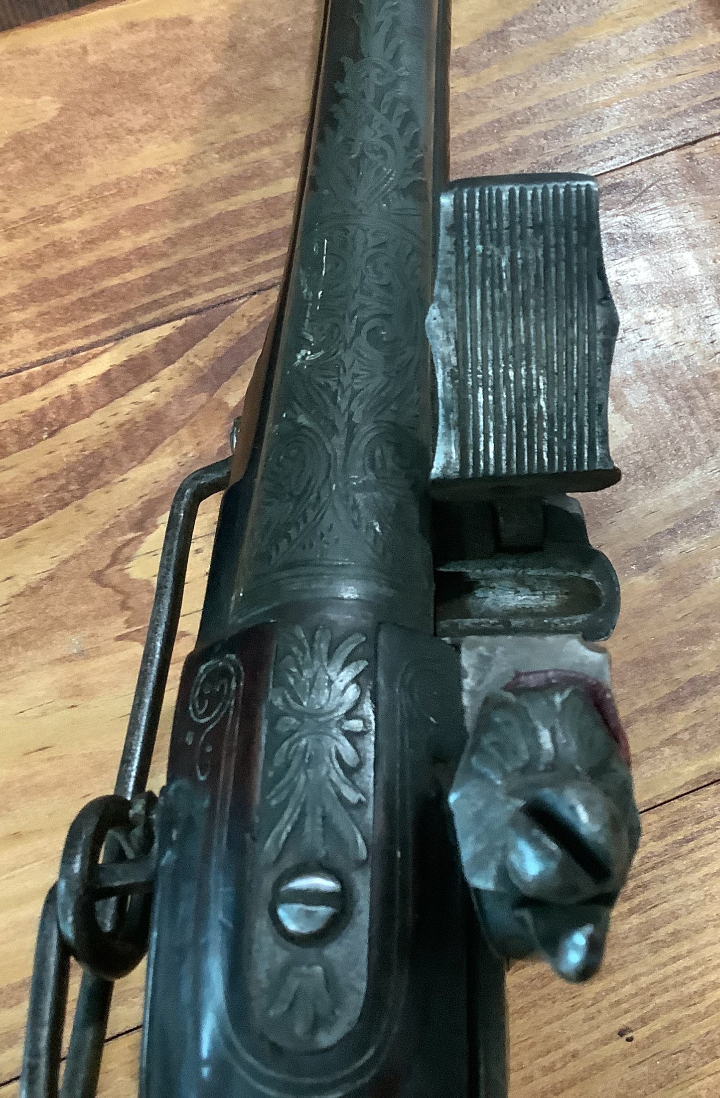Turkish/Ottoman Flintlock Knee Pistol - Blunderbuss (Dag). 11.75" flared barrel 1.5". Silver inlay, Detail carvings in stock; Embossed/Engraved barrel, with additional embellishment. Engraved trigger guard, lock plate, frizzed, hammer and barrel. Under barrel removable wooden ramrod. Metal Saddle ring. NVSN. Most likely made late1700's - early 1800's compared to similar weapons. What a beautiful and fun piece of history to hold and admire. Wasn't really sure I wanted to put this up for sale, but here it is ... for the moment.
