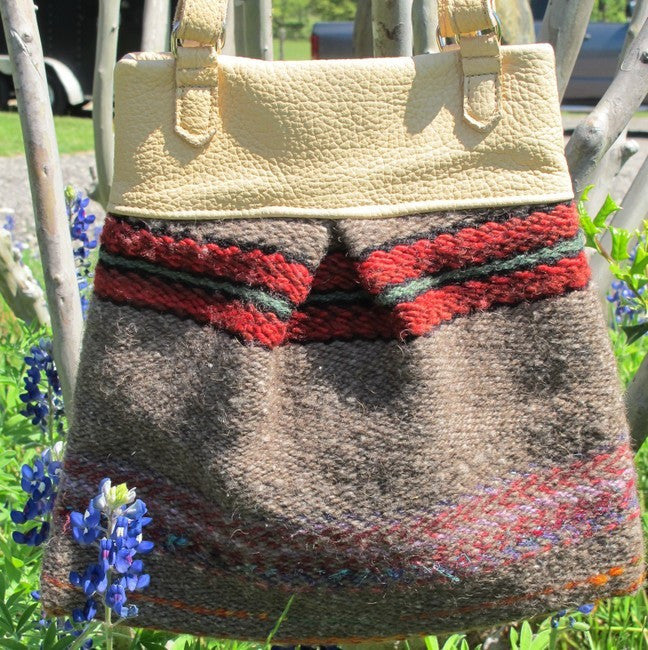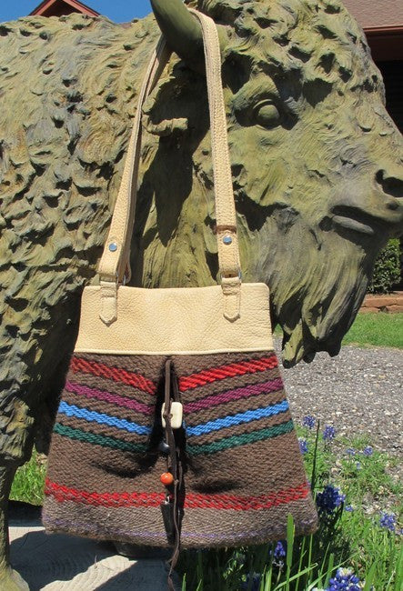 Hand woven hand spun bison cloth interwoven with domestic wool and alpaca.  Cream colored 4 oz American bison leather handle and trim.  This is another one-of-a-kind completely unique piece.