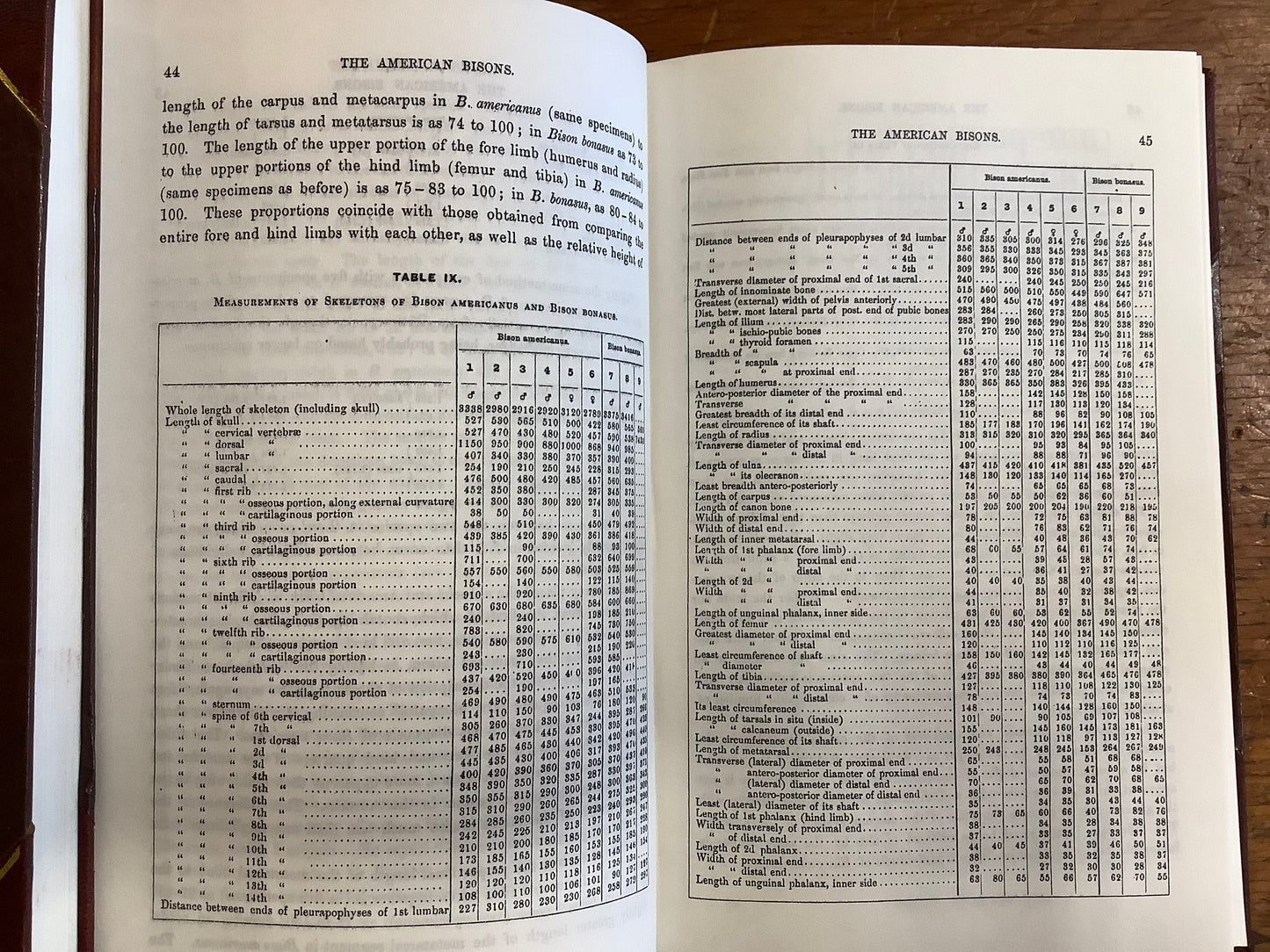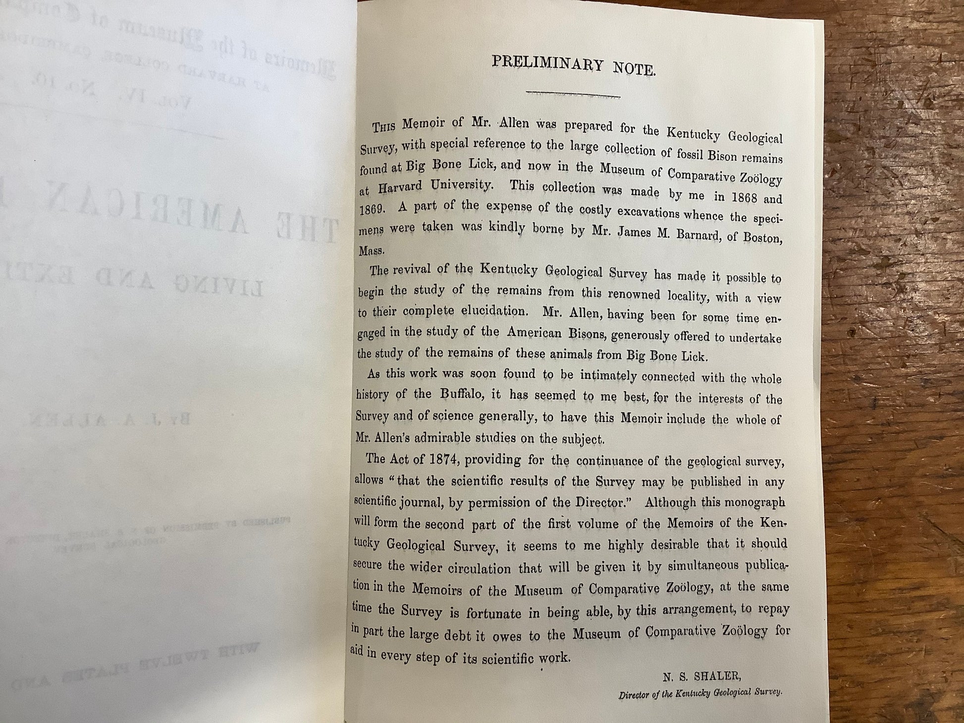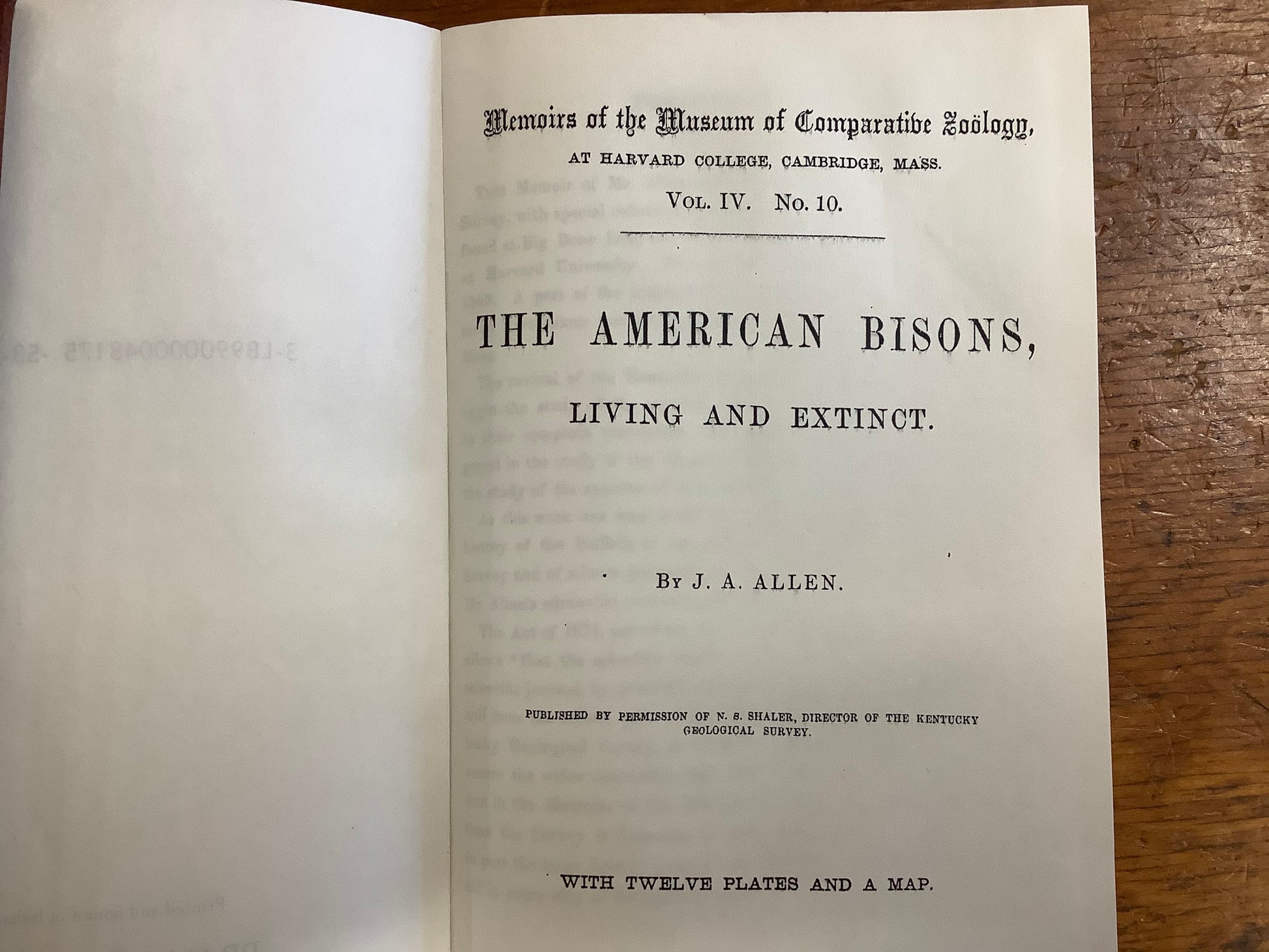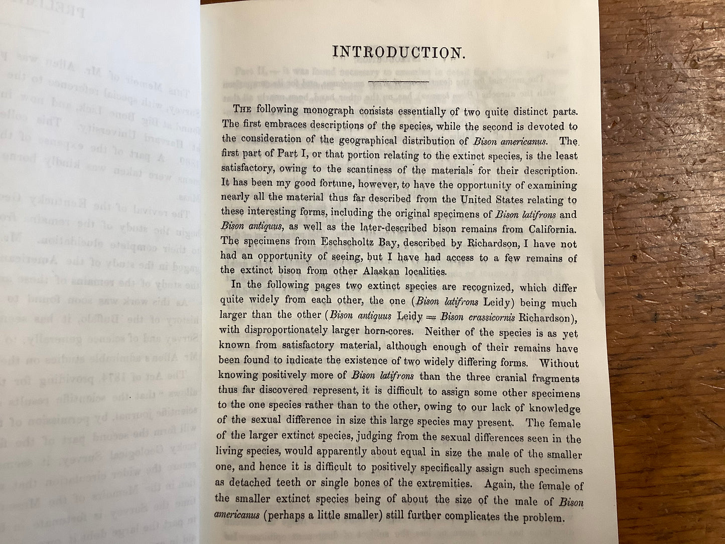 1876.  (reprinted and bound)  This is a very nicely leather-bound reprint of Volume IV, Number 10 of the "Memoirs of the Museum of Comparative Zoology", Harvard University", and as you can see from the "Introduction" deals with the then prevailing beliefs on both pre-historic and then living bison in the United States.