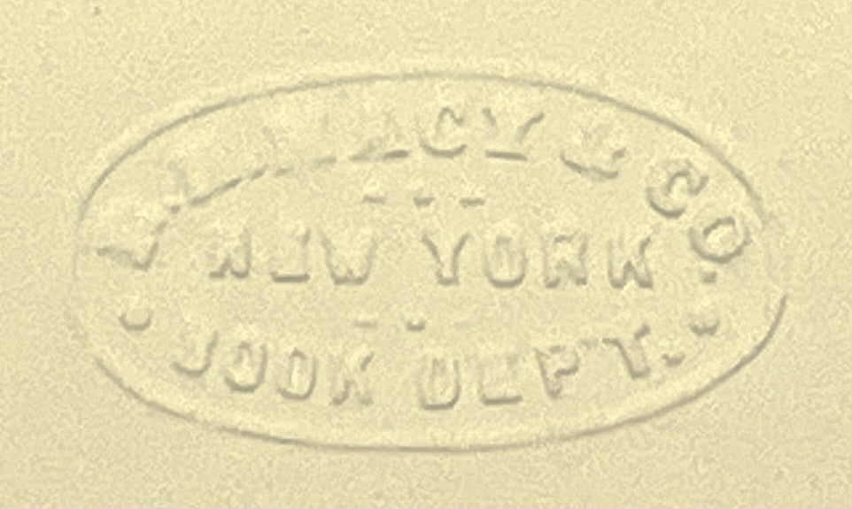 Blind stamped on title page, “R. H. Macy & Co. New York Book Dept.” This was the predecessor to the famous Macy’s department store chain, during the last year the flagship store was located on Sixth Ave, before it moved to present day Herald Square in 1902.