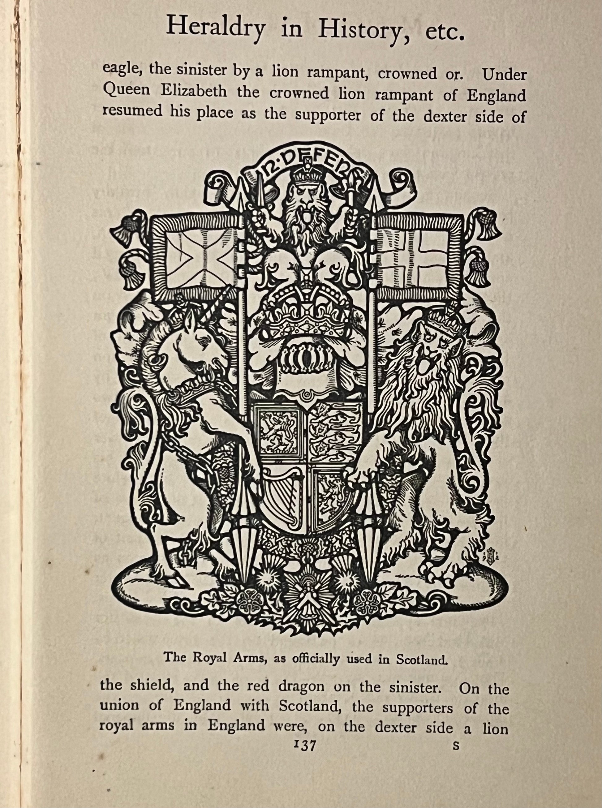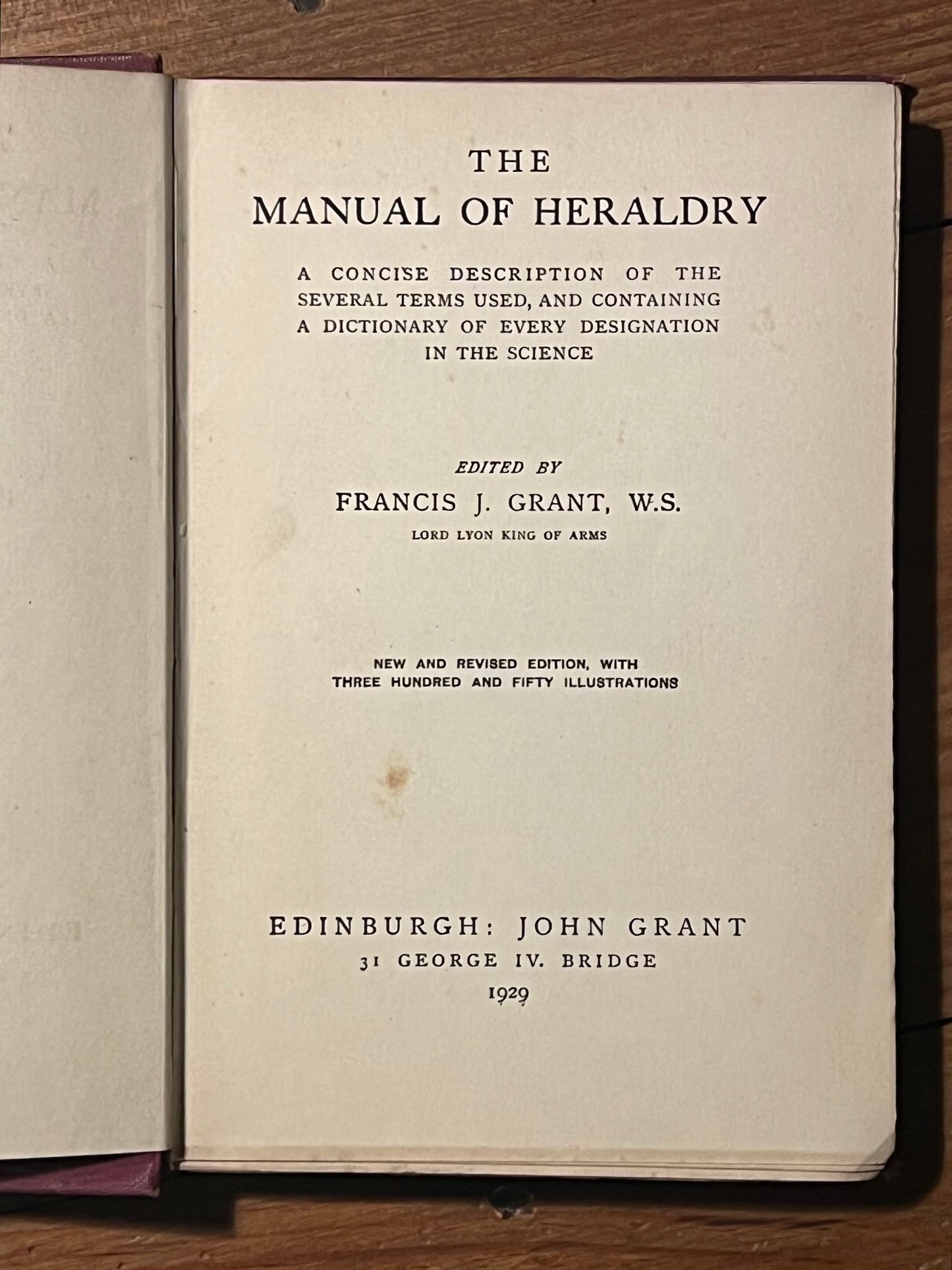 Heraldry is a discipline relating to the design, display and study of armorial bearings/armory... a coat of arms on a shield, helmet & crest. The author is Sir Francis James Grant KCVO WS (1863–1953), a Scottish officer of arms who eventually rose to the office of Lord Lyon King of Arms and Secretary of the Order of the Thistle.[1] He was made a Knight Commander of the Royal Victorian Order in 1935.