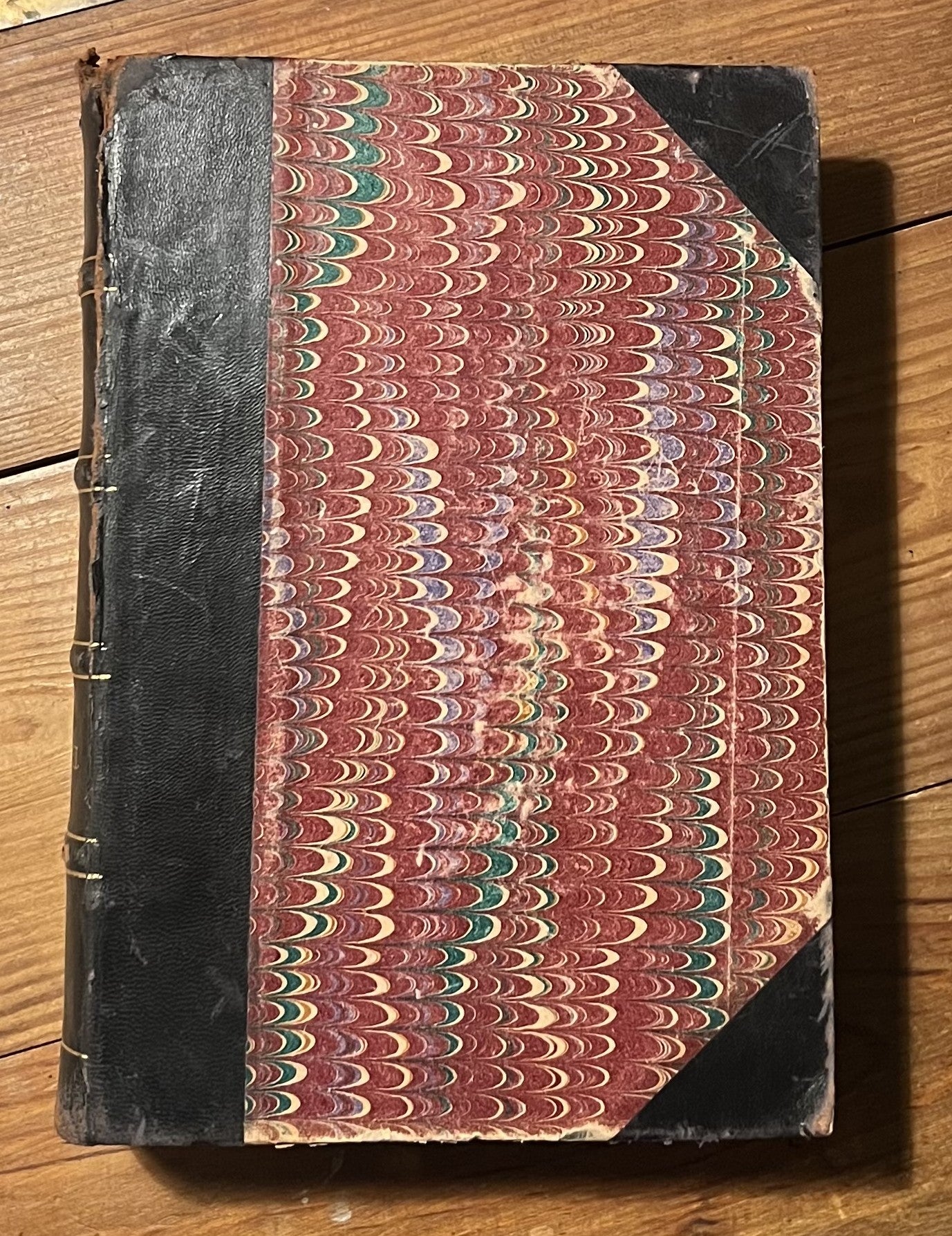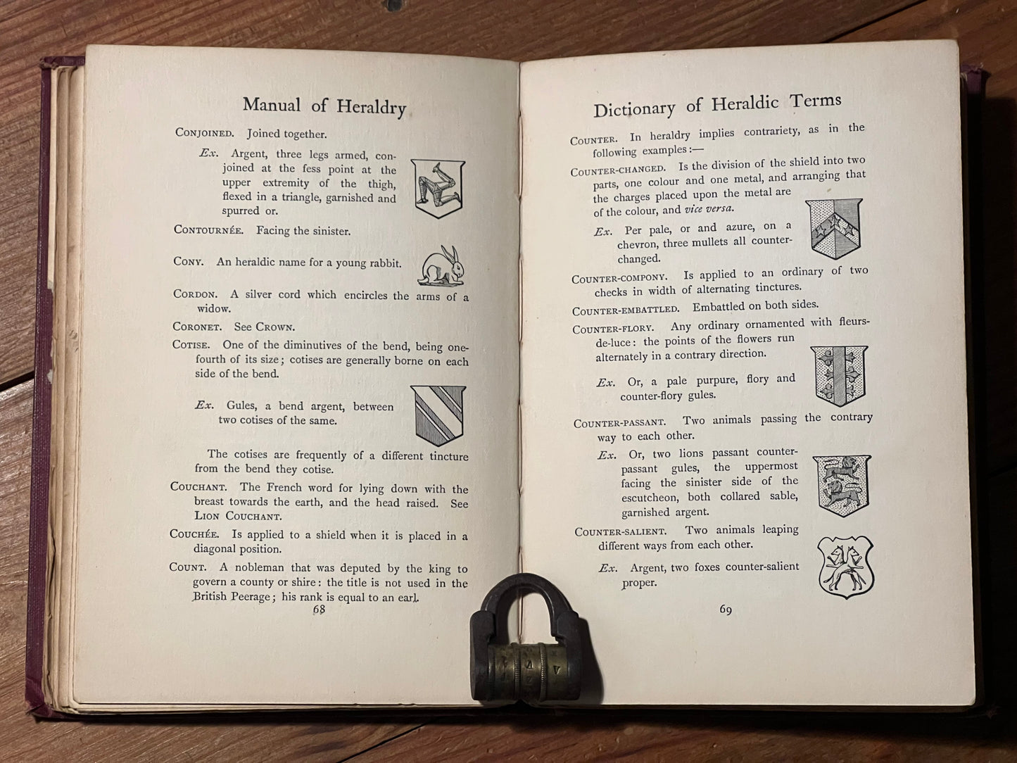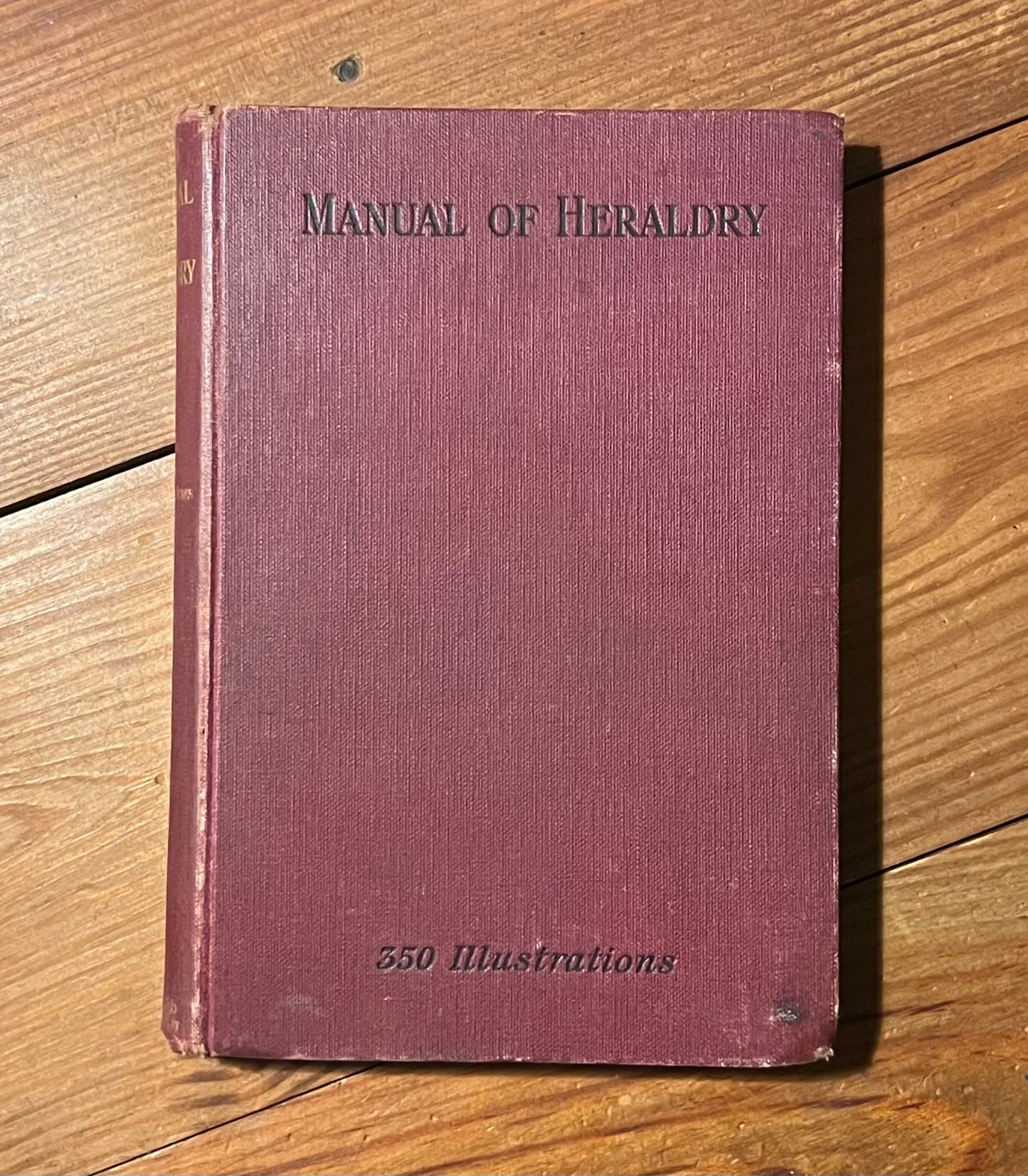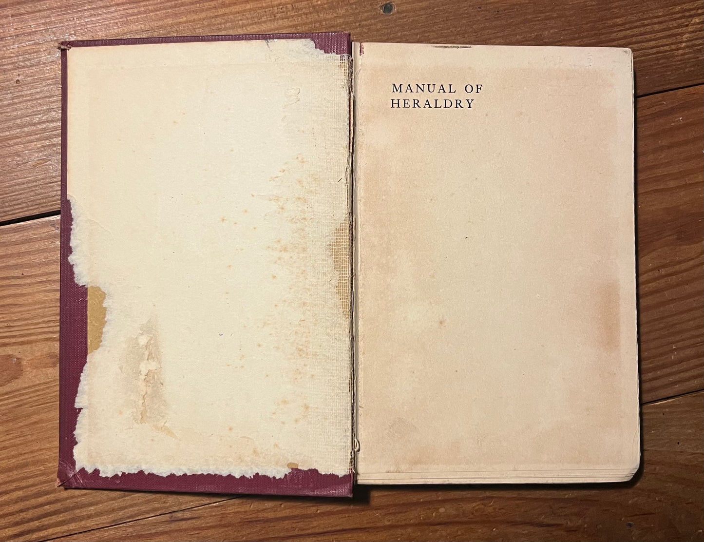 This first is a small tome, "The Manual of Heraldry" (1929). The boards are attached, but the hinges are in rough shape -- I can do some repair work with archival tools (can discuss before purchase, please) -- the pages however are all crisp & white, with minimal foxing. $150