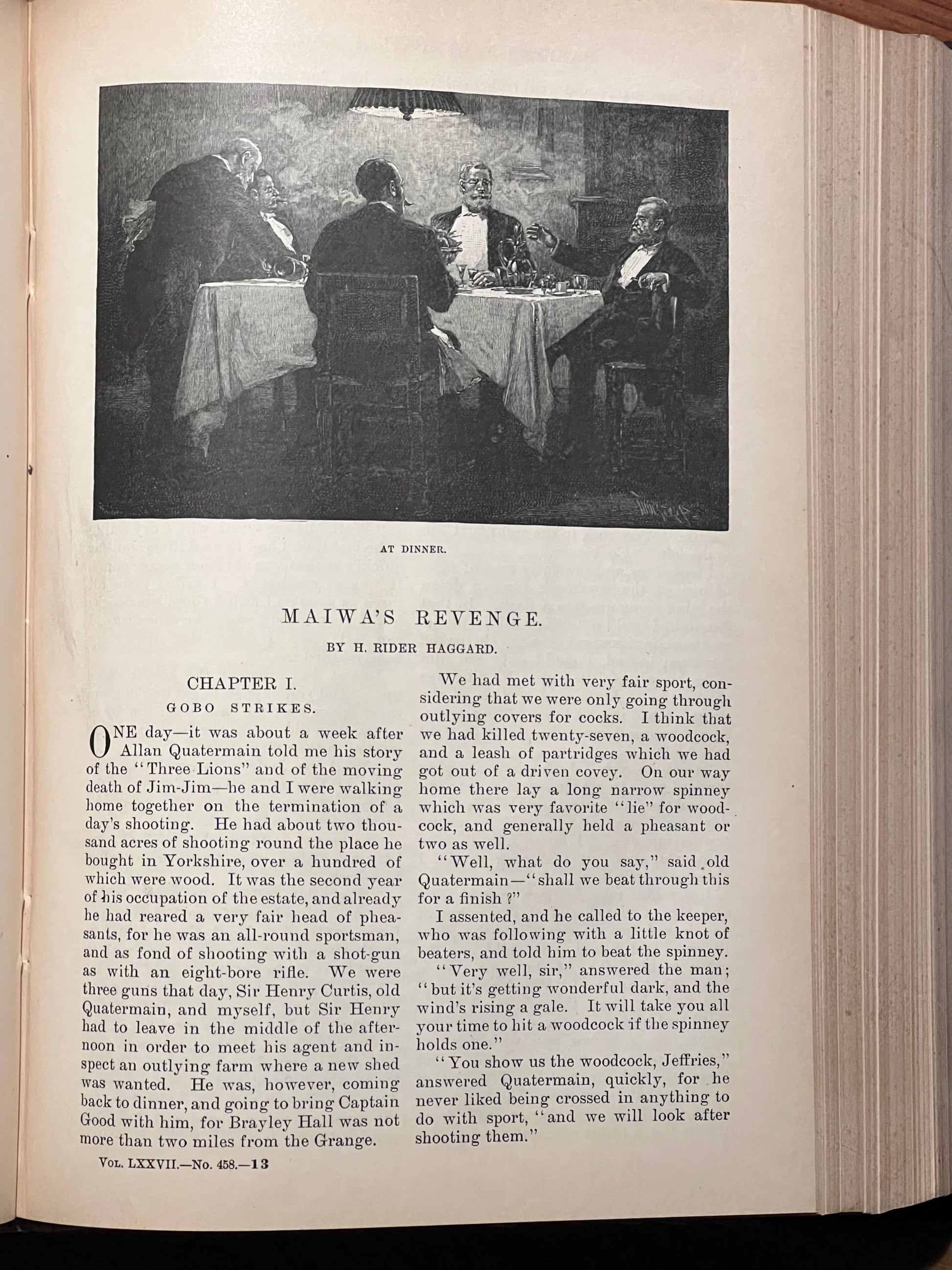 This short novel I found is titled "Maiwa's Revenge" (1888) and this is its original magazine appearance, months before it was published in book form... this is as "first edition" as it gets! Great story, too... Quartermain is on a hunting expedition in Africa, and avenges the death of Princess Maiwa's baby by joining an attack on the village responsible.