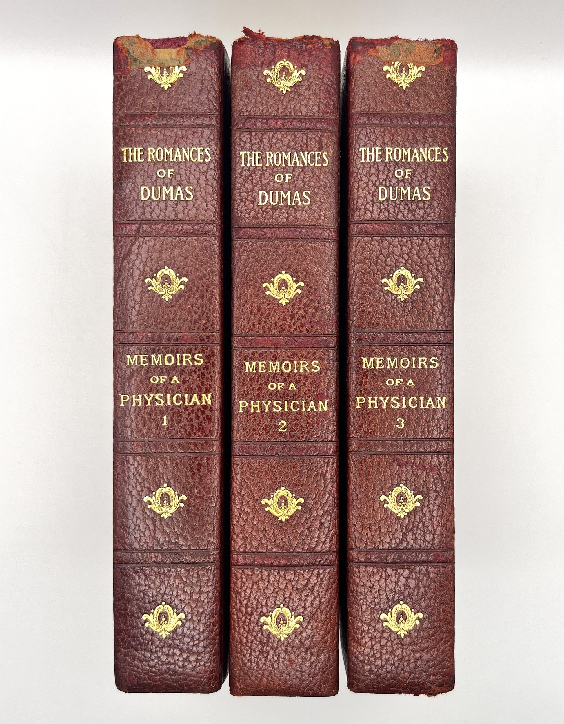 This is a bargain price on this set. This is the earliest set and has three volumes. There is a later set of the same three and then an even later set with 5. Ten years later (1903) there is a 32 volume set of all of Dumas's works to that point with an almost identical 3/4 leather binding (The Louvre Set).