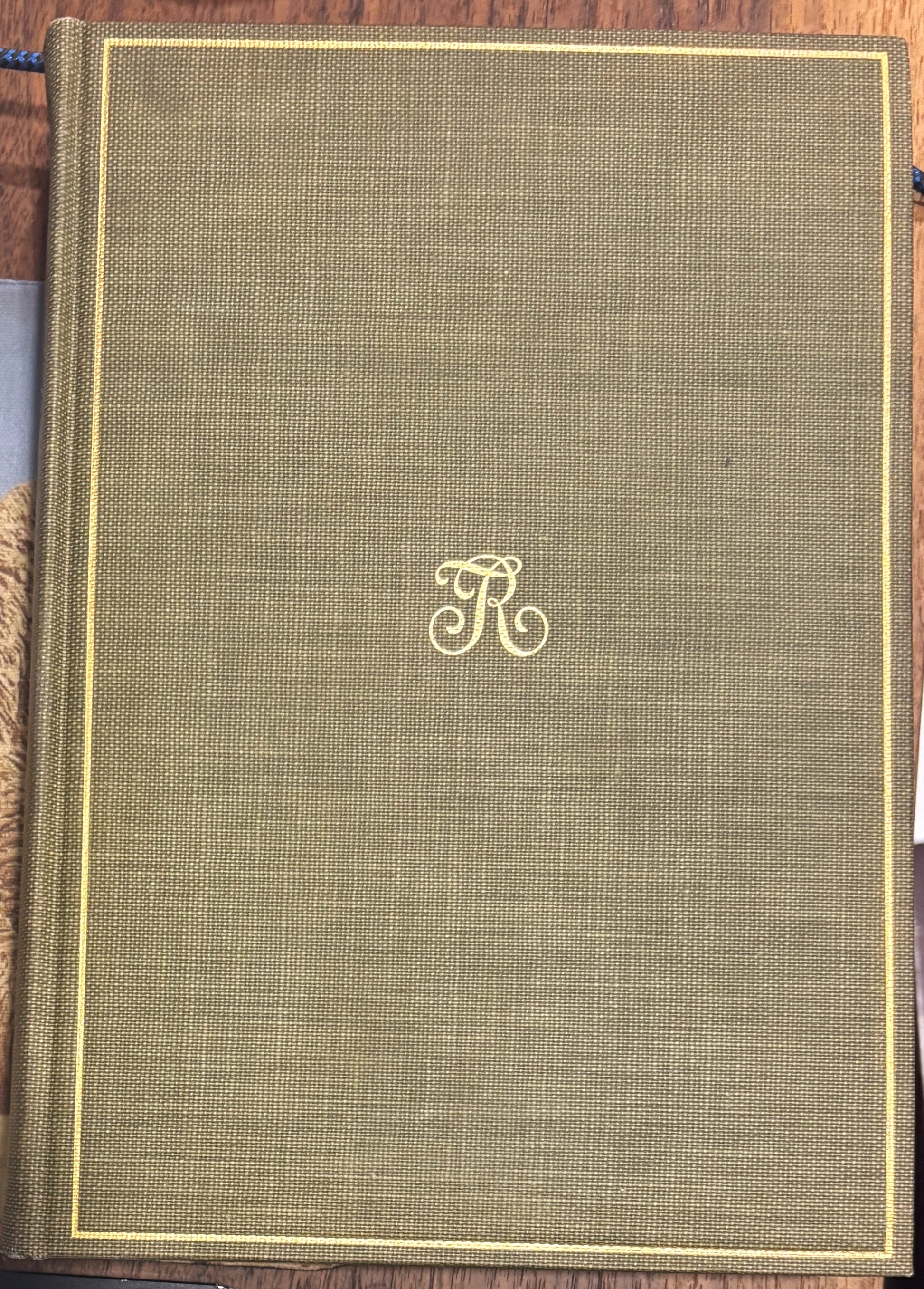 I just wanted to get this up as quickly as the books arrived and I could examine them. So far, very fine. First couple do not appear to have been read or creased. Olive(ish) green cloth bindings; inlay edge title and gold gilt on the top page edges. Gold border and "R" on the front cover. A small bit of wear on the end spines ... like being taken on and off shelves over the years, probably moving from place to place to place. One more such move coming up!