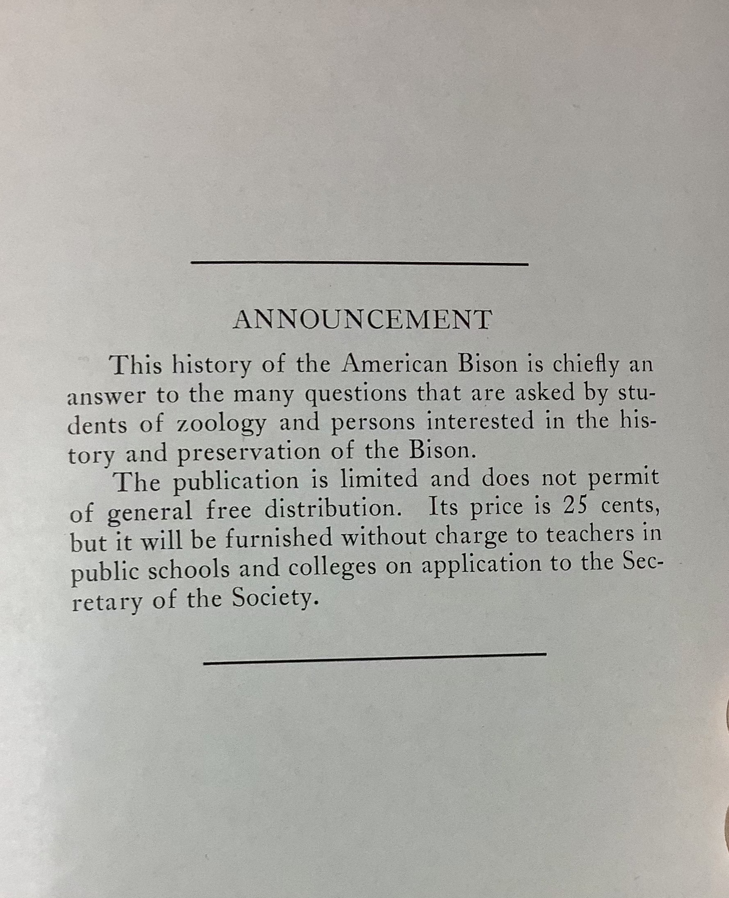 Martin S. Garretson (1866–1955) was one of the charter members of the Original American Bison Society* founded in the New York Zoological Park Dec. 8, 1905. Older and better-known men held the main title in the Society at first, but within a dozen years Garretson was elected as secretary, a key post. Several years later he was also made curator of the National Museum of Heads and Horns, situated in a stylish building on the zoo grounds.