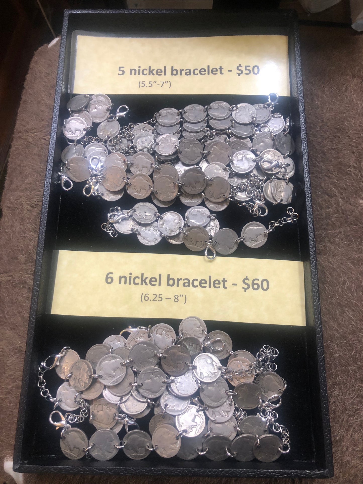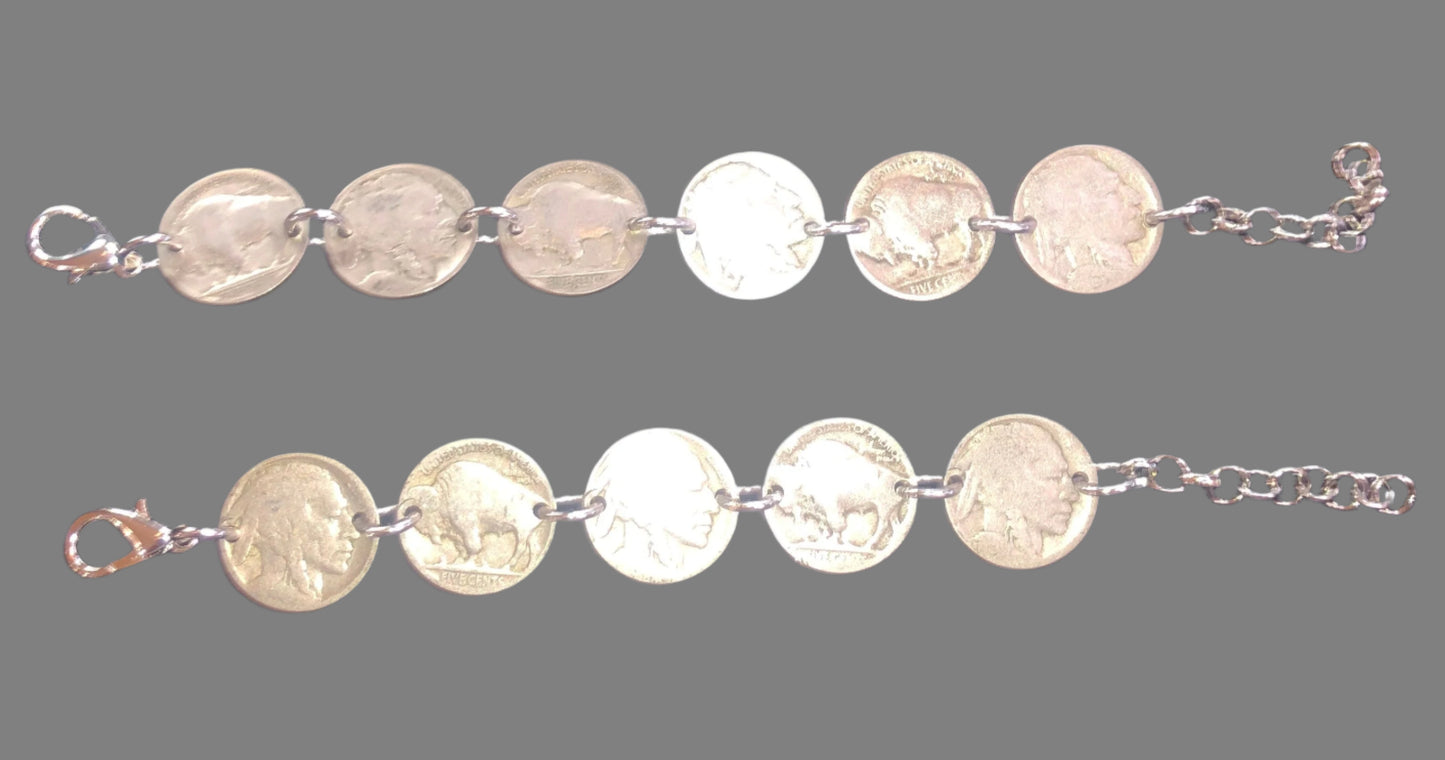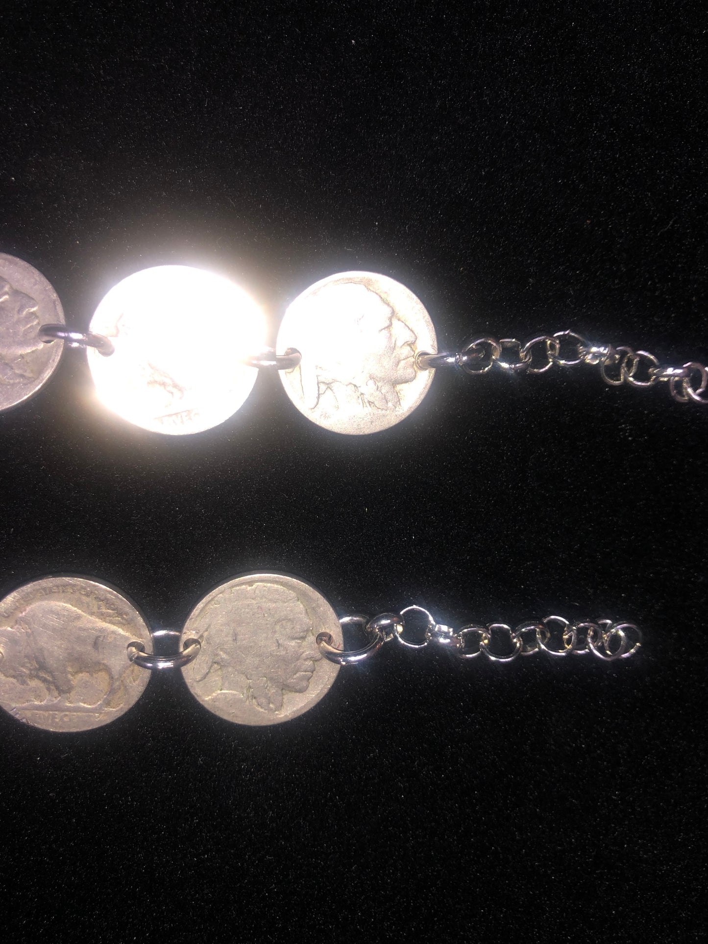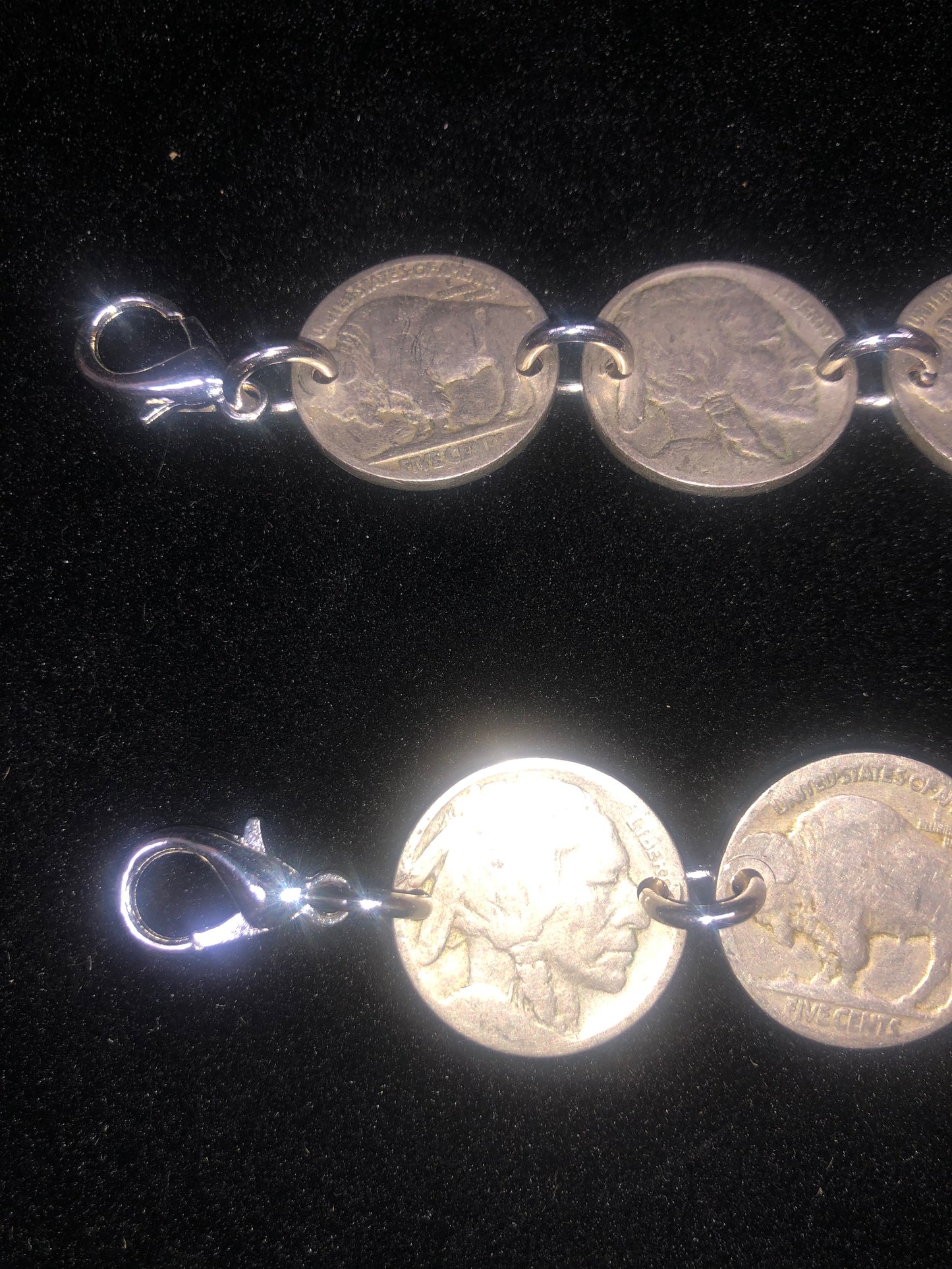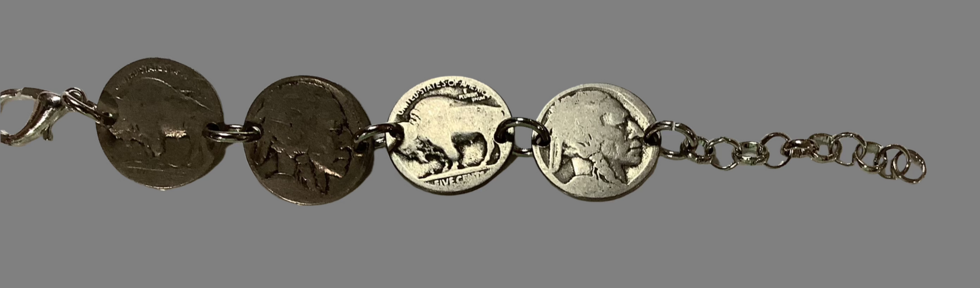 Actual 1920's and 30's Indian Head/Buffalo nickels (most of the dates are "no date" nickles)  connected with surgical stainless links; lobster clasp and a stainless end chain for wrist size adjustment.