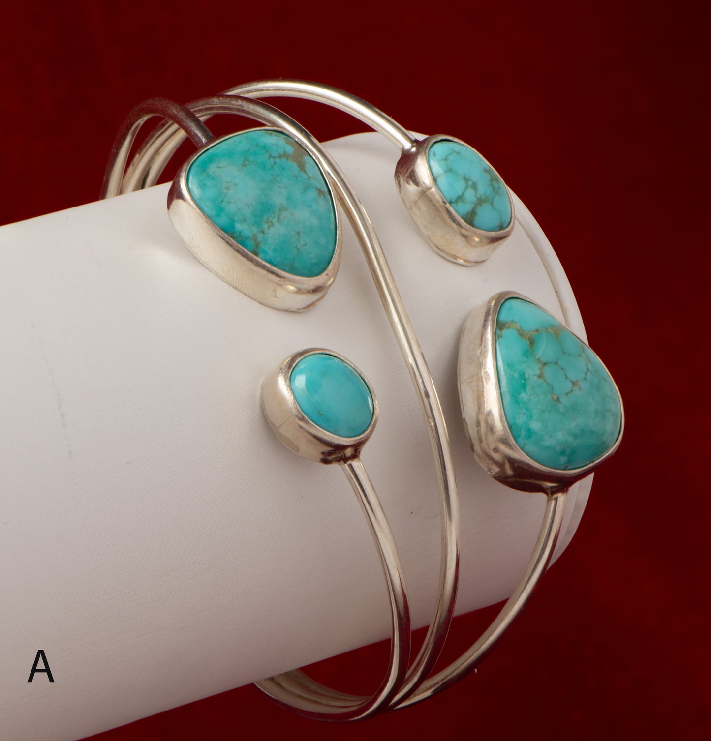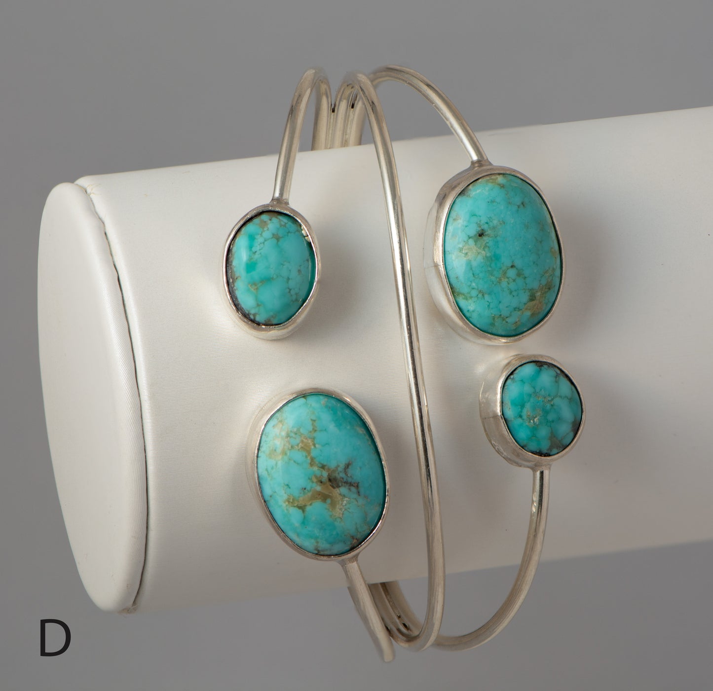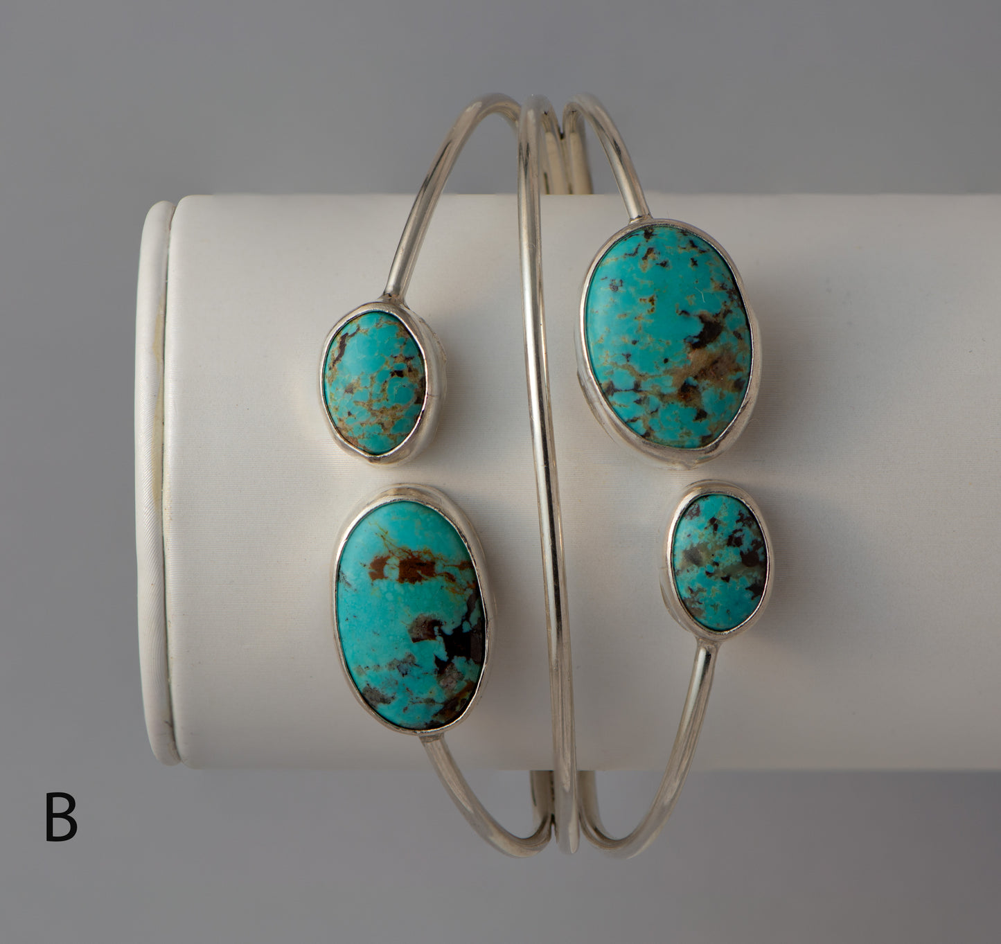 Jan Begay takes sterling wire rod, 4 beautiful, true Kingman turquoise and individualistic stones. He sets them in .925 sterling silver, giving the illusion of mass with but a featherweight on the wrist.