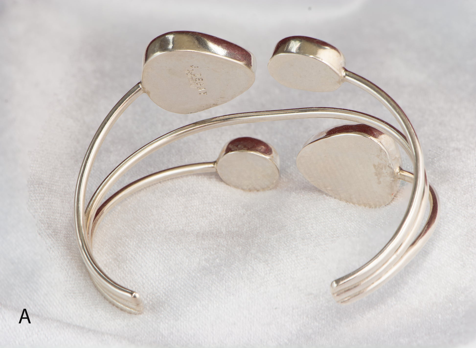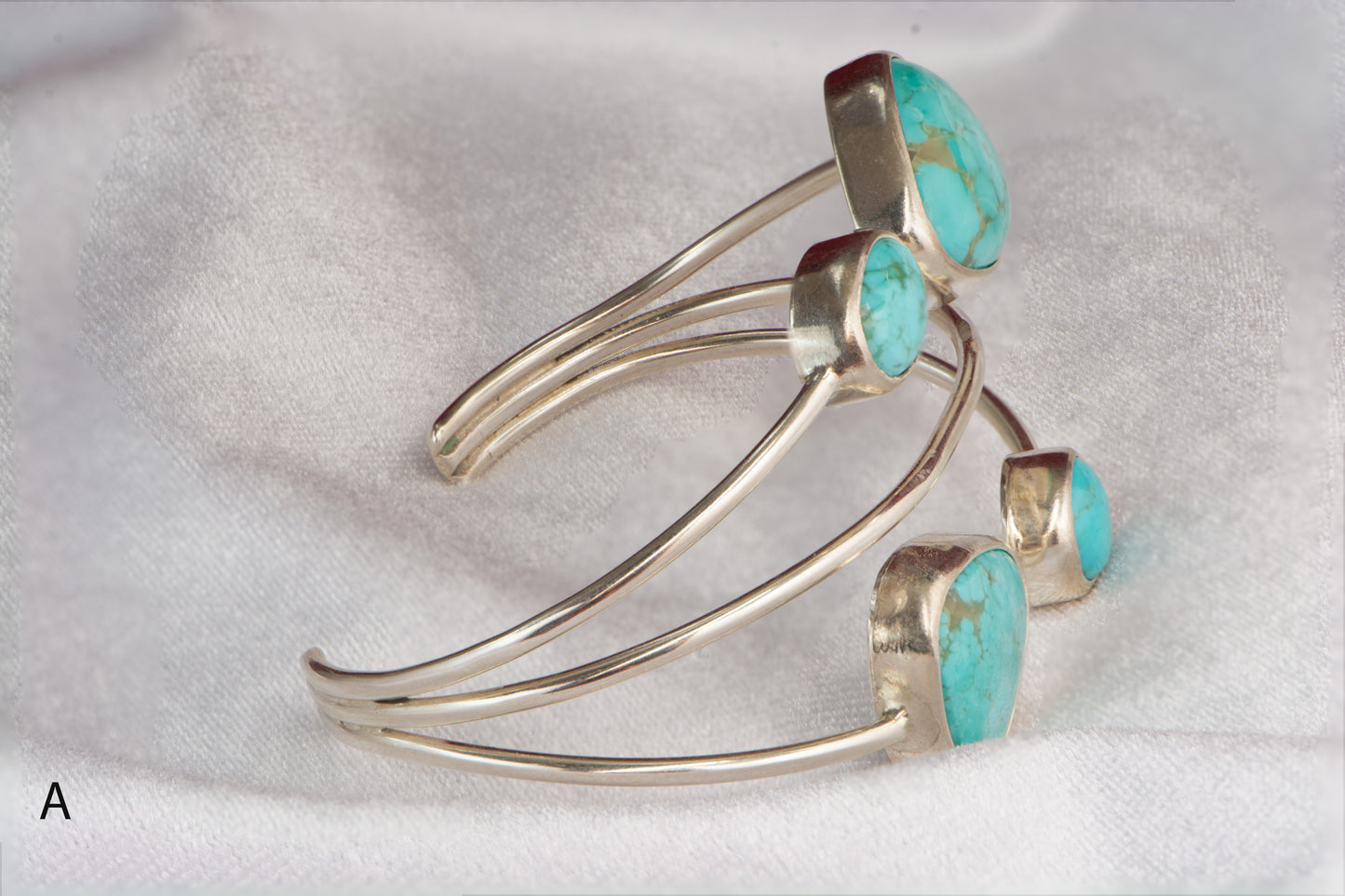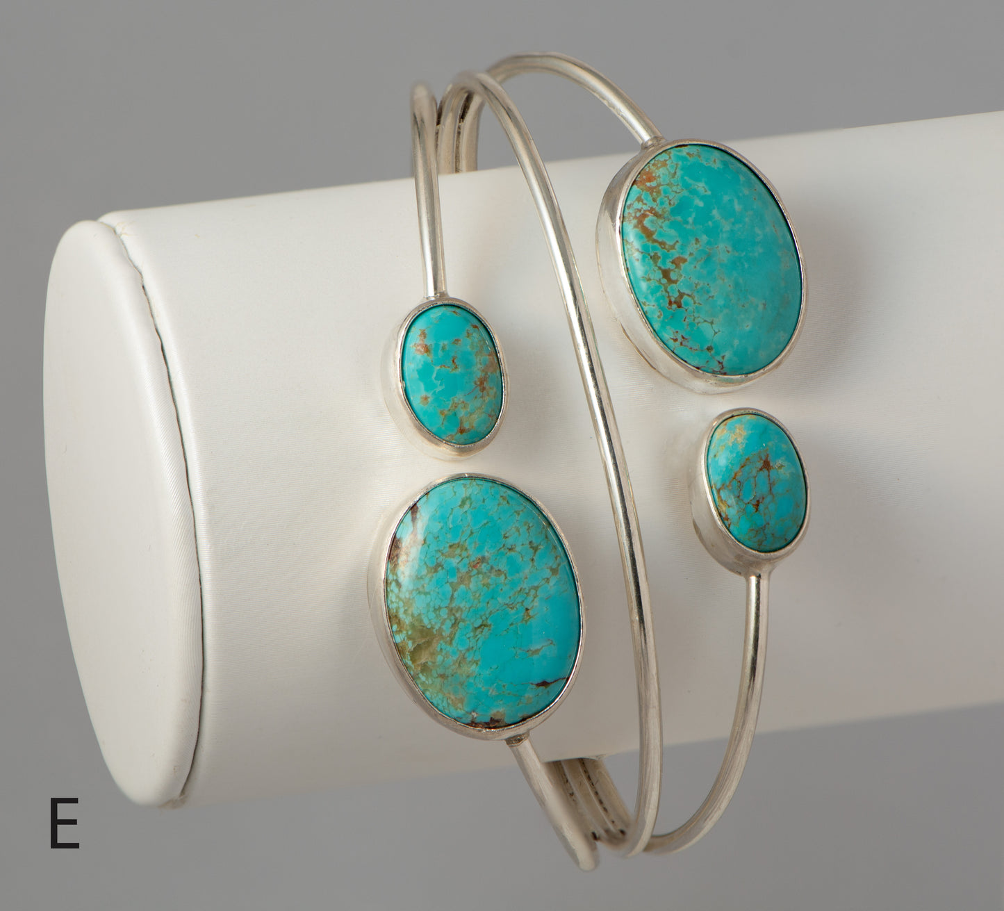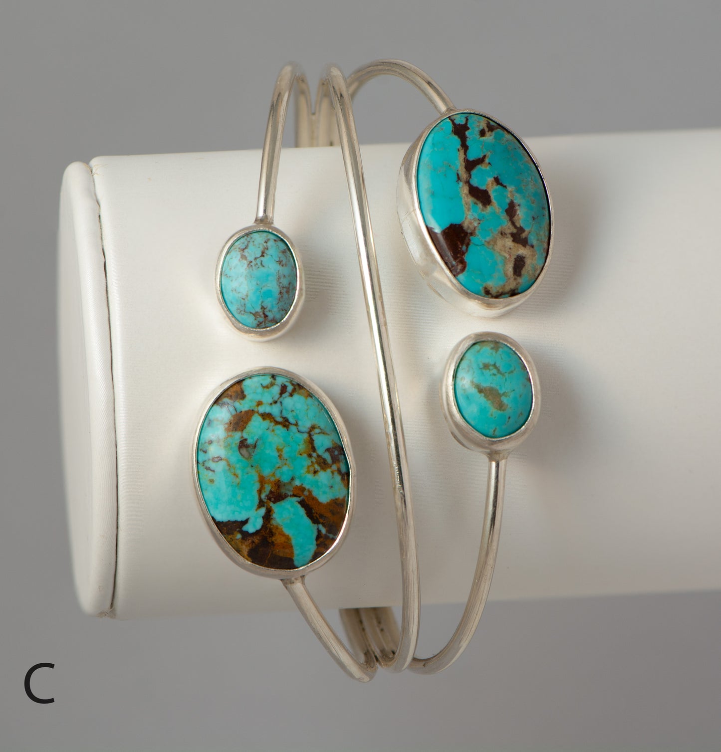 Jan Begay takes sterling wire rod, 4 beautiful, true Kingman turquoise and individualistic stones. He sets them in .925 sterling silver, giving the illusion of mass with but a featherweight on the wrist.