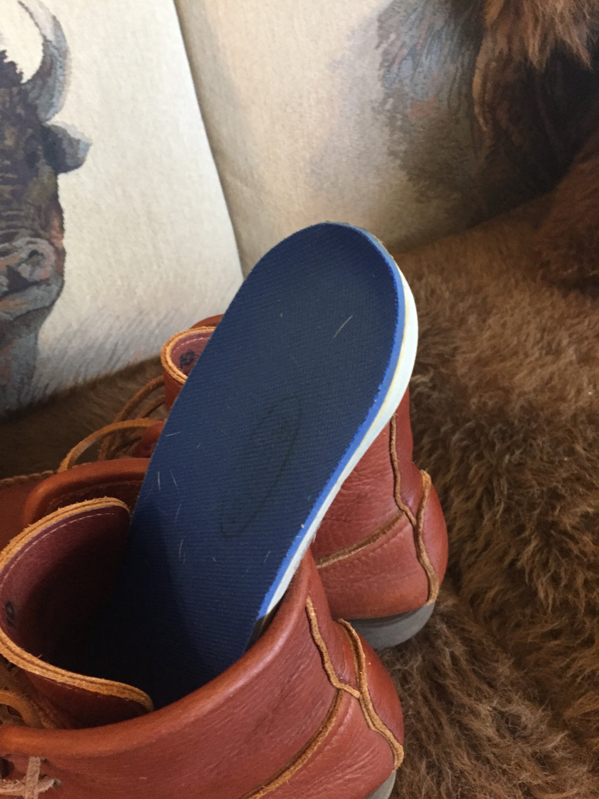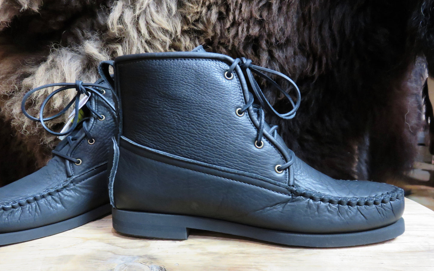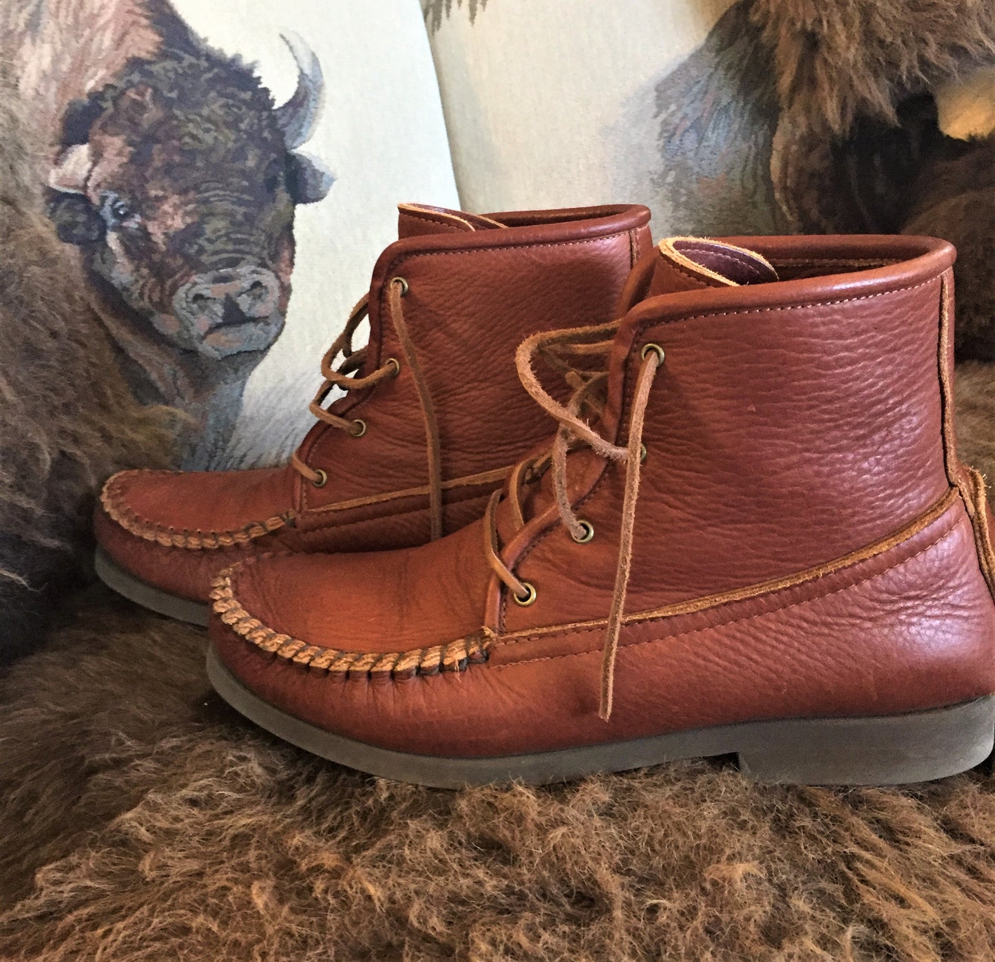 4 eyelet;  7" tall;  hand whipped external toe seamFull two layers of bison, so it is both bison outside and bison lined (but the lining is the same thickness as the outer layer for even more durability and support); medium Neolite out-sole, Sorbathane insole, leather lacing.