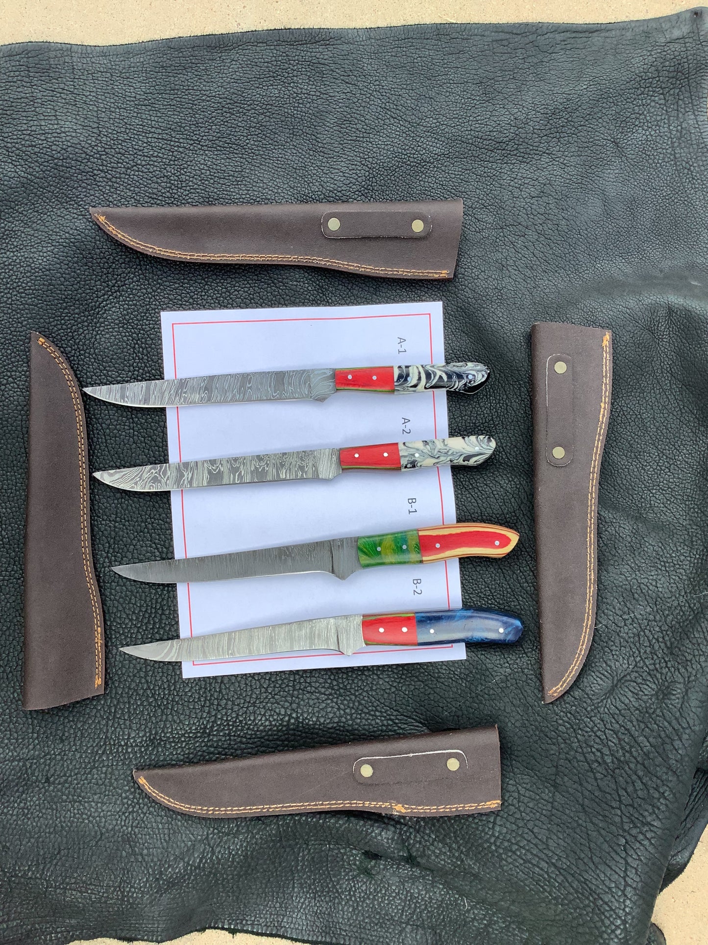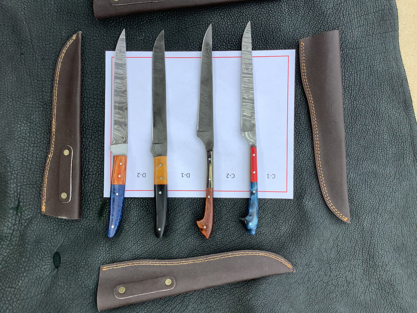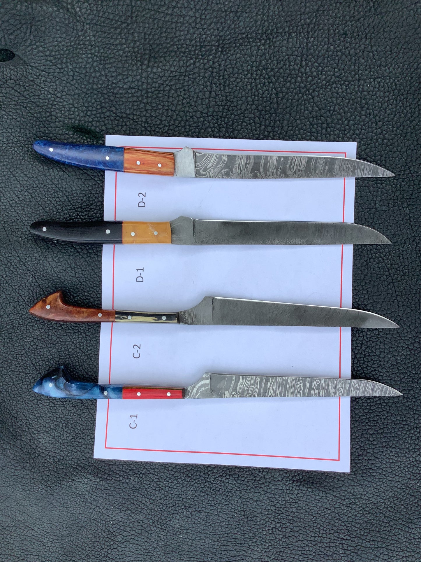 All are true Damascus steel with a mixture of 1095HC and 15N20 nickel carbon. You heat them up together and then fold the bar over and over to get the desired layers, these are 384 layers.
